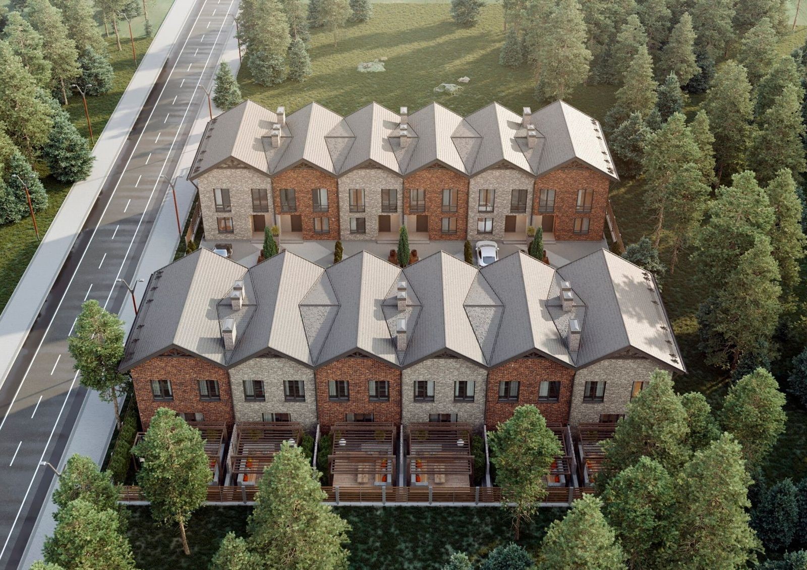 Nekrasov townhouse — коттеджный городок в скандинавском стиле на окраине соснового леса. Двенадцать двухэтажных таунхаусов с собственными придомовыми участками расположены в районе Лесной Бучи, в 20 минутах езды от Киева. Рядом с каждым коттеджем два паркоместа и небольшой задний двор, на котором можно обустроить уютный уголок для отдыха и семейных ужинов на свежем воздухе.