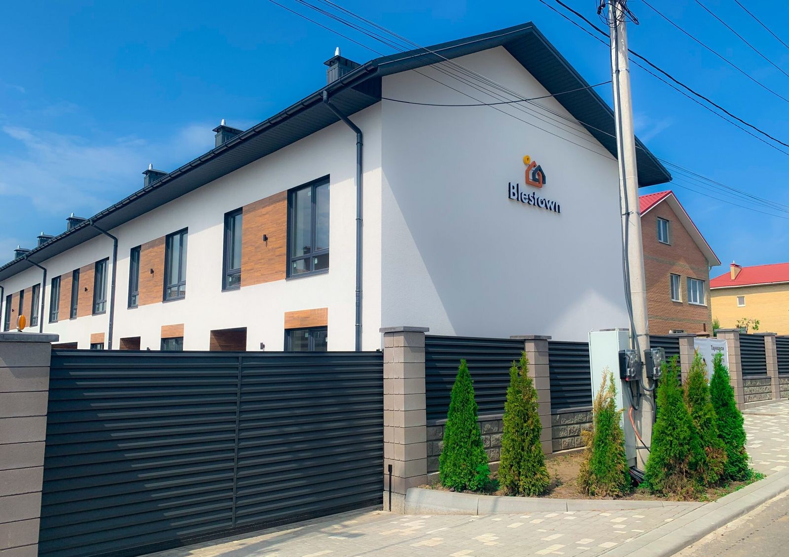 Комплекс Blestown состоит из 8 двухэтажных таунхаусов с мансардой в подарок от застройщика. Внешне это современное жилье в минималистичном стиле — светлая отделка с деревянными элементами, черные оконные профили и балконные ограждения, фасадная подсветка и отсутствие лишнего декора. Каждый таунхаус оборудован индивидуальными инженерными системами, что позволяет не зависеть от городских коммуникаций.