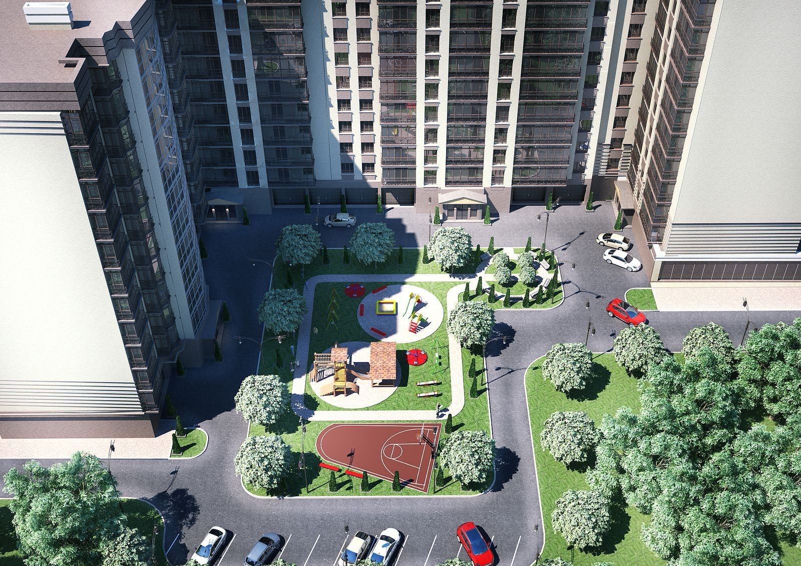 Первые этажи других трех секций отведены под коммерческие, а также торговые помещения. Во всех блоках функционируют скоростные лифты, установлены хромированные перила, продумано размещение кладовых помещений для жильцов. Во дворе есть детская площадка, зона для отдыха.