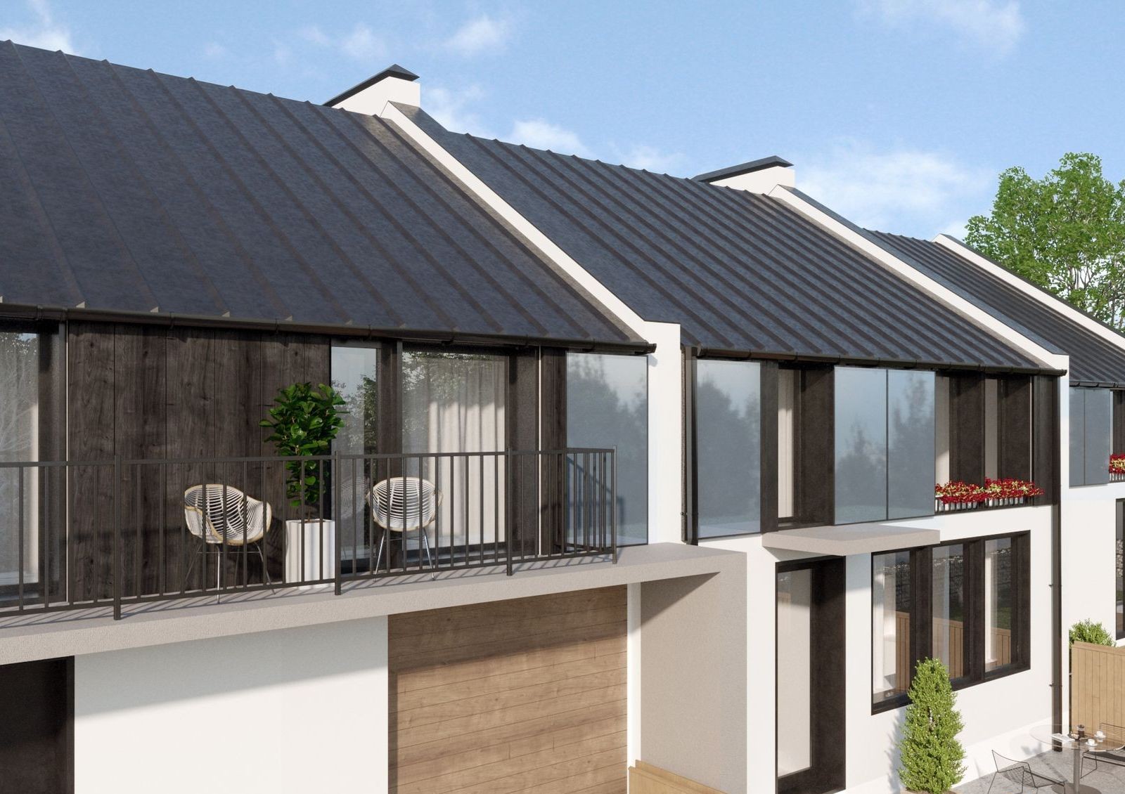 Фасад таунхаусов выполнят в сдержанном стиле со светлой отделкой, для контраста выбрали оконные профили в черном цвете. У каждого из трех домов будет индивидуальный земельный участок от 1,2 до 3,7 соток — этого хватит для обустройства уютного дворика с паркоместом, беседкой, бассейном и детской площадкой. Также застройщик позаботился о личной безопасности жильцов и их имущества — общая территория комплекса будет закрытой от посторонних, а между соседями установят заборы из дерева.