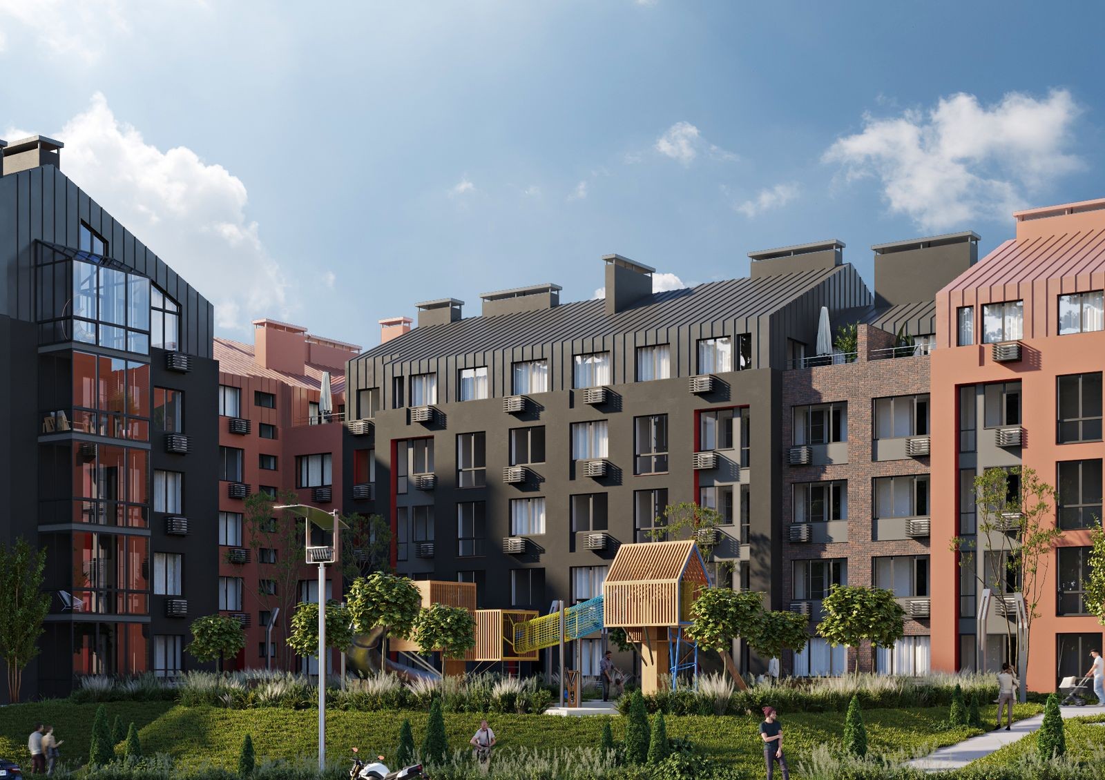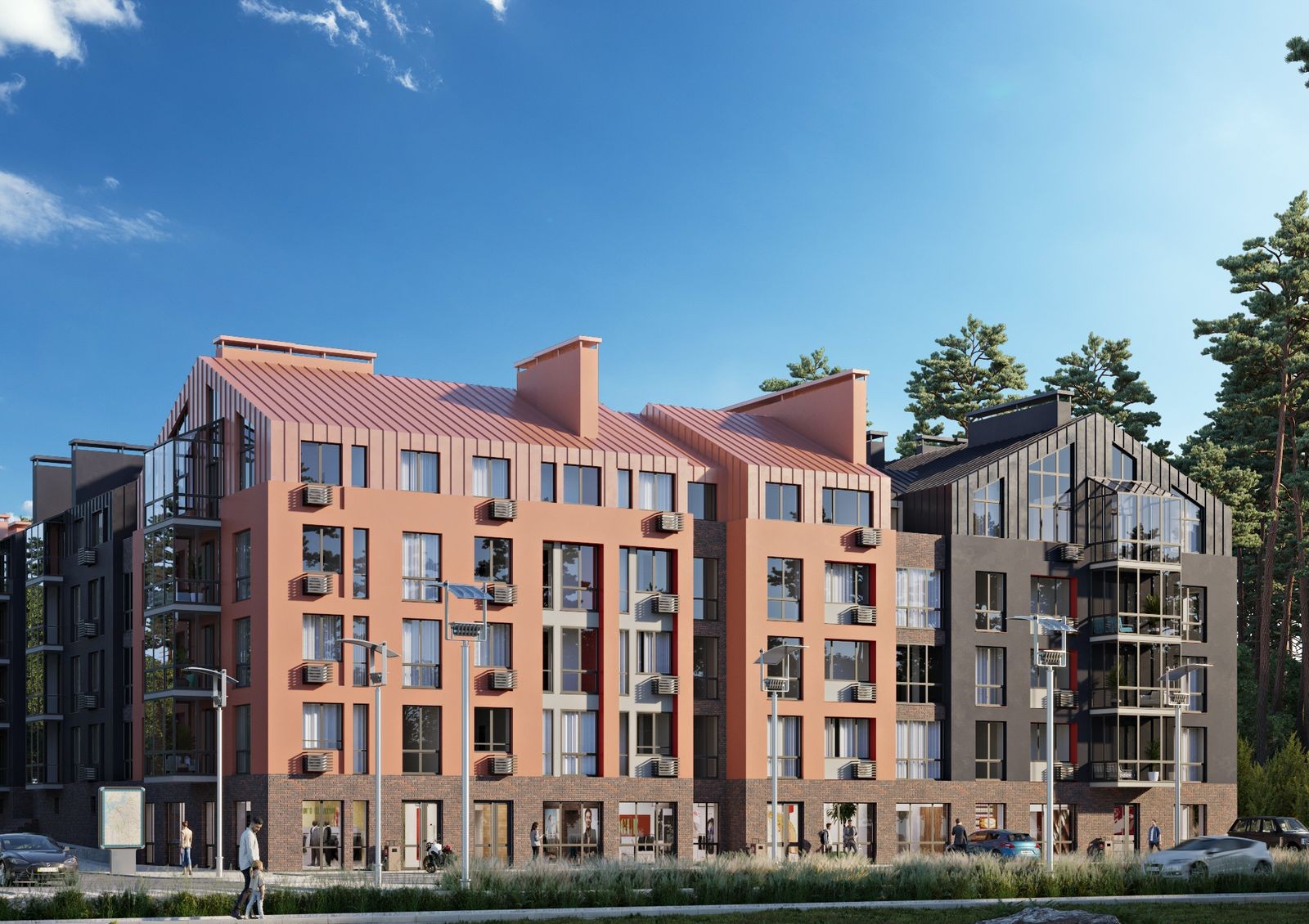 для автомобилей жильцов и гостей комплекса предусмотрены открытые стоянки с внешней стороны домов