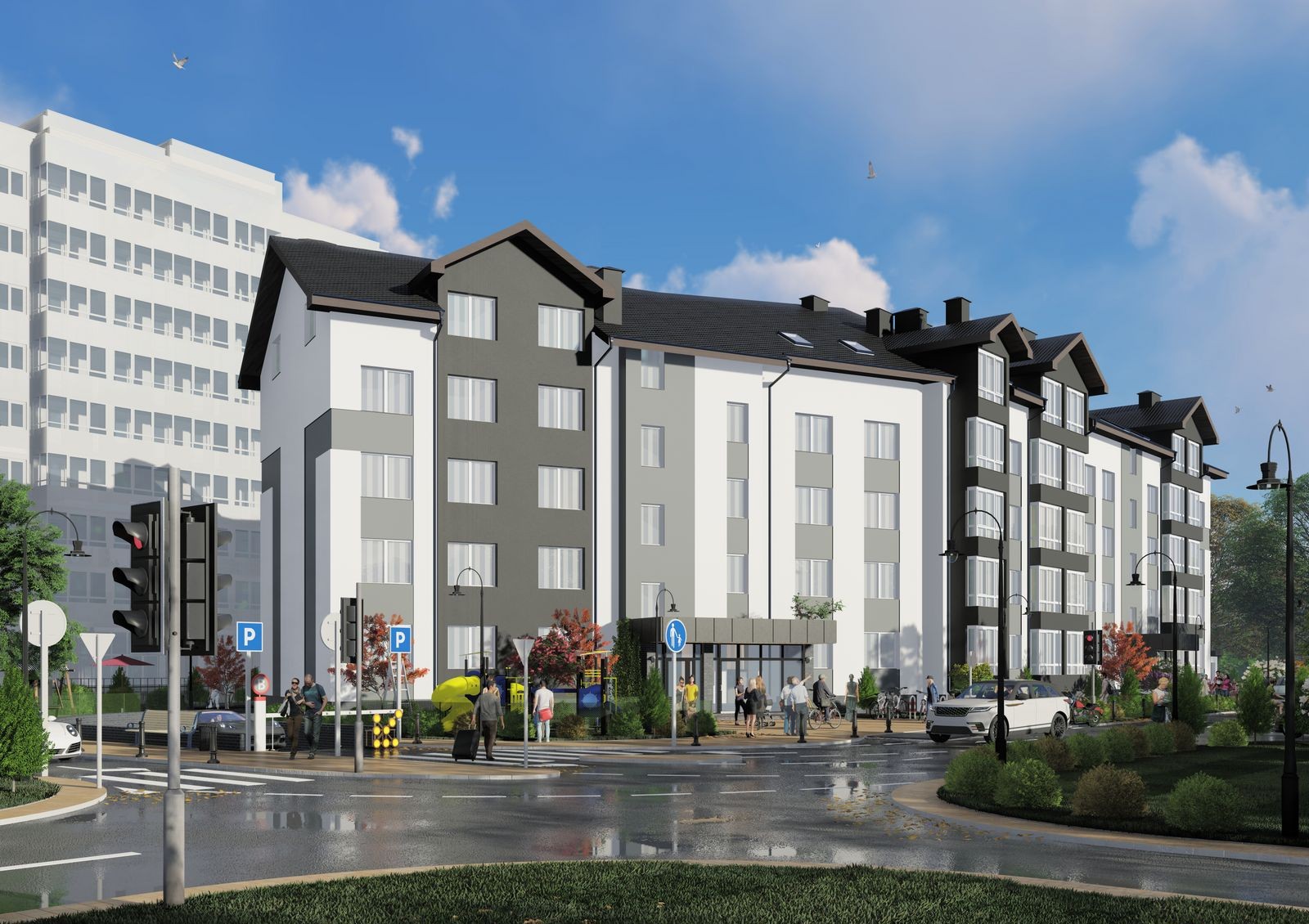 закрытая территория с концепцией «без авто и посторонних», ландшафтным дизайном и освещением