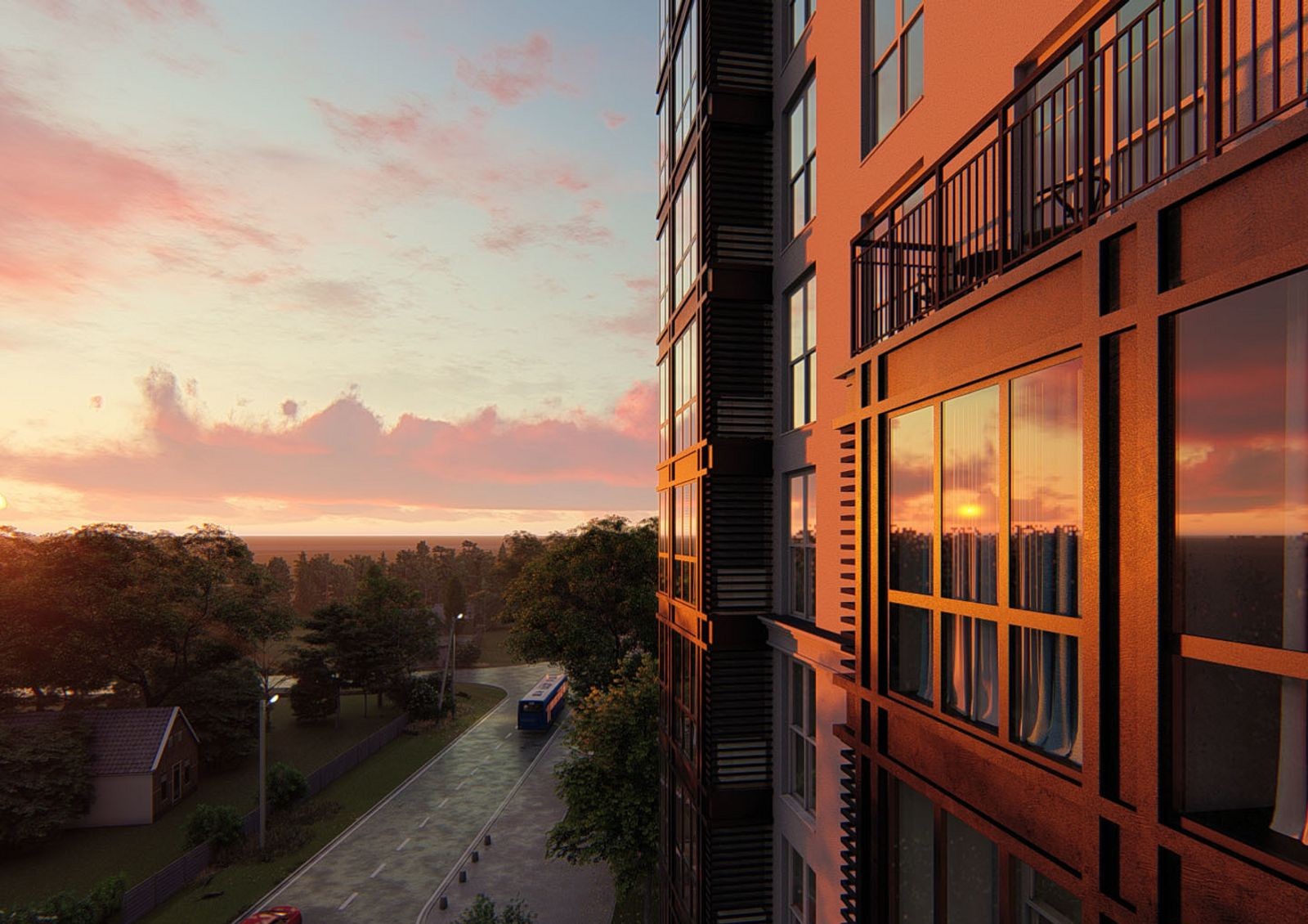 панорамные окна позволяют использовать естественное освещение в полную силу, также они обеспечивают прекрасный обзор на район