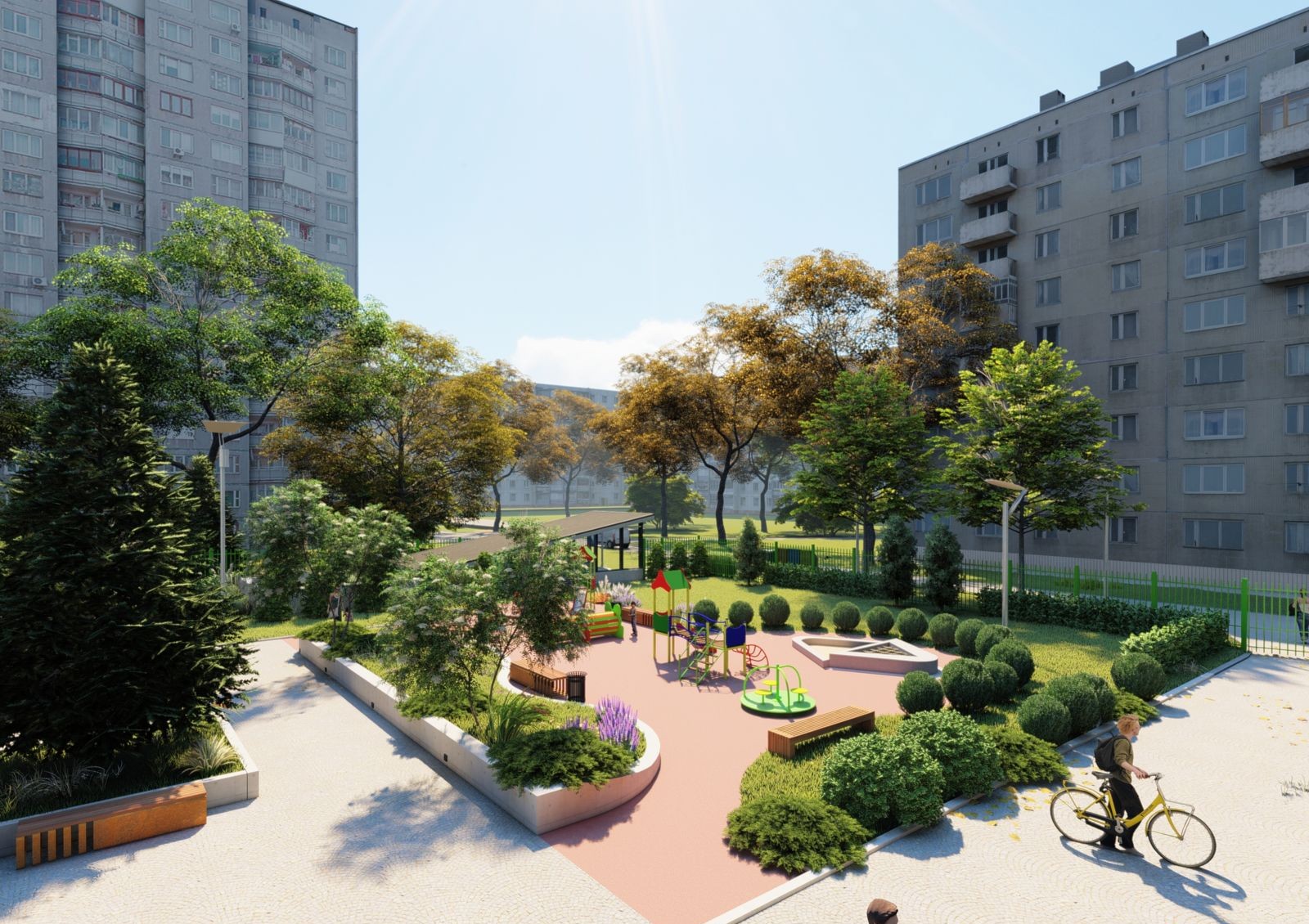 Район вокруг жилого комплекса имеет уже сложившуюся инфраструктуру. Поблизости находятся школы, детские сады, магазины и банки. Возле дома находится конечная
