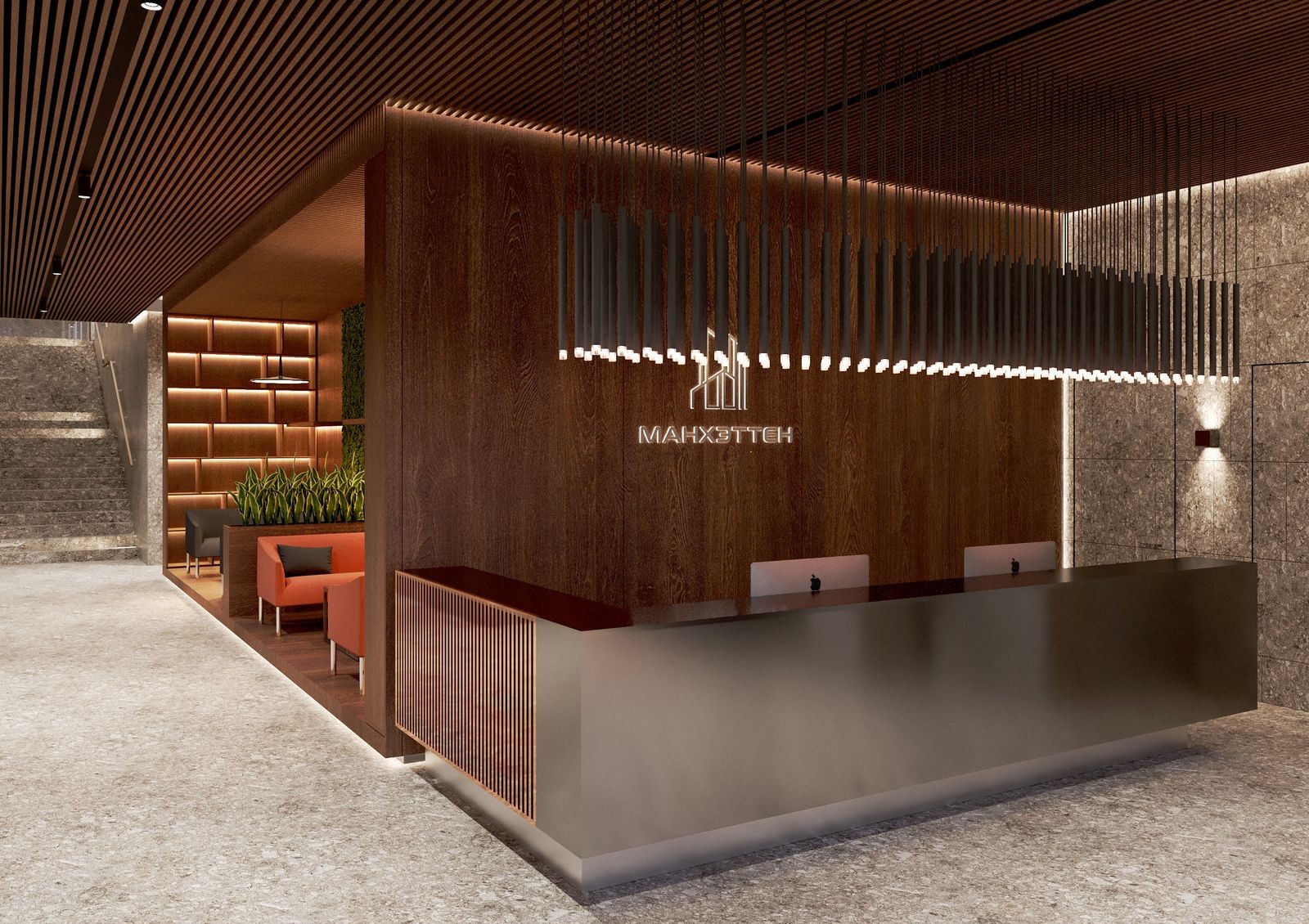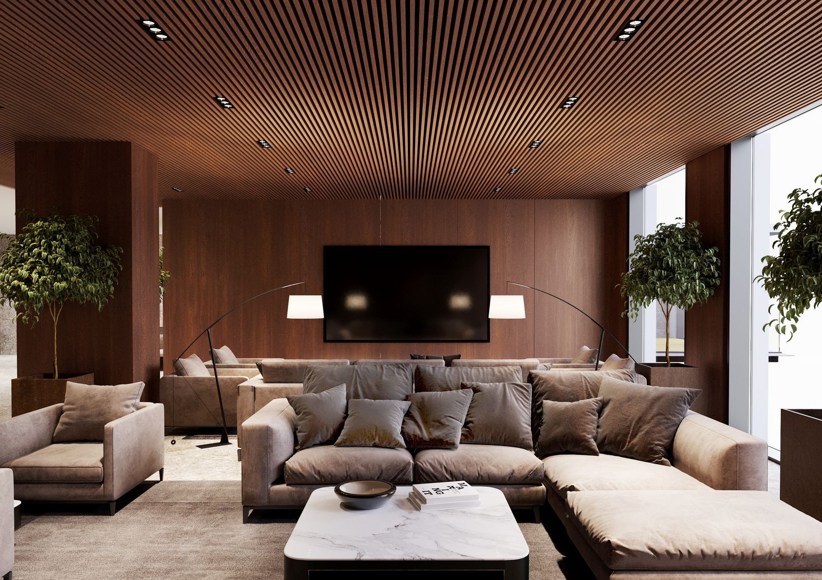 У центрального входа — стойка-ресепшн с консьержем и просторный холл с лаунж-зоной. На нижнем этаже первой секции — меблированный холл жилого комплекса с двумя выходами во двор, детской игровой комнатой, помещением для хранения детских колясок и велосипедов.