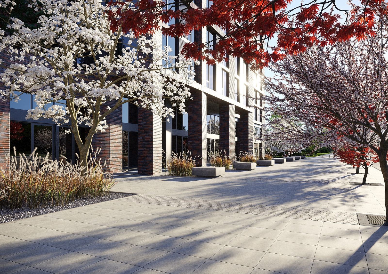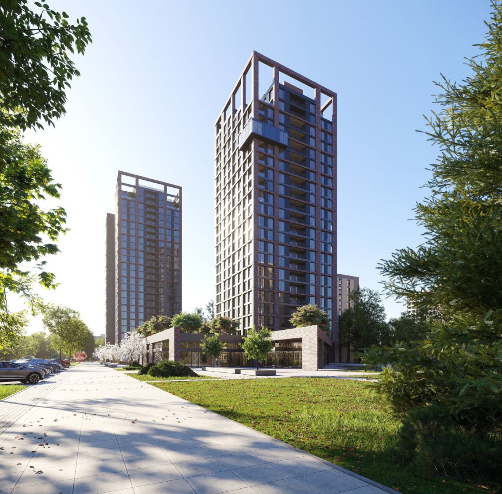 Жилой комплекс MARSHALL состоит из двух многоэтажных домов, объединенных общей территорией. Внешне здания выглядят современно: панорамное остекление, темный клинкерный кирпич на фасаде, лаконичные линии. Придомовая территория облагорожена по правилам ландшафтного дизайна и разделена на функциональные зоны: прогулочные и для отдыха, спортивные и детские игровые площадки. Благодаря концепции «двор без авто» жители будут чувствовать себя комфортно и безопасно во время прогулок по территории. Для хранения авто предусмотрены многоуровневые наземный и подземный паркинги, а для гостей спроектирована отдельная стоянка.