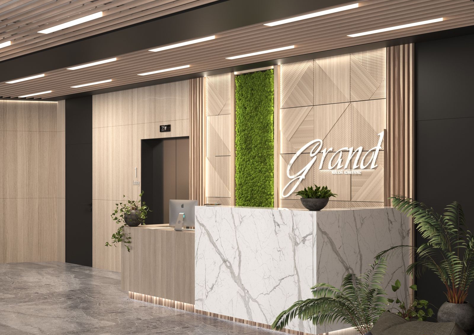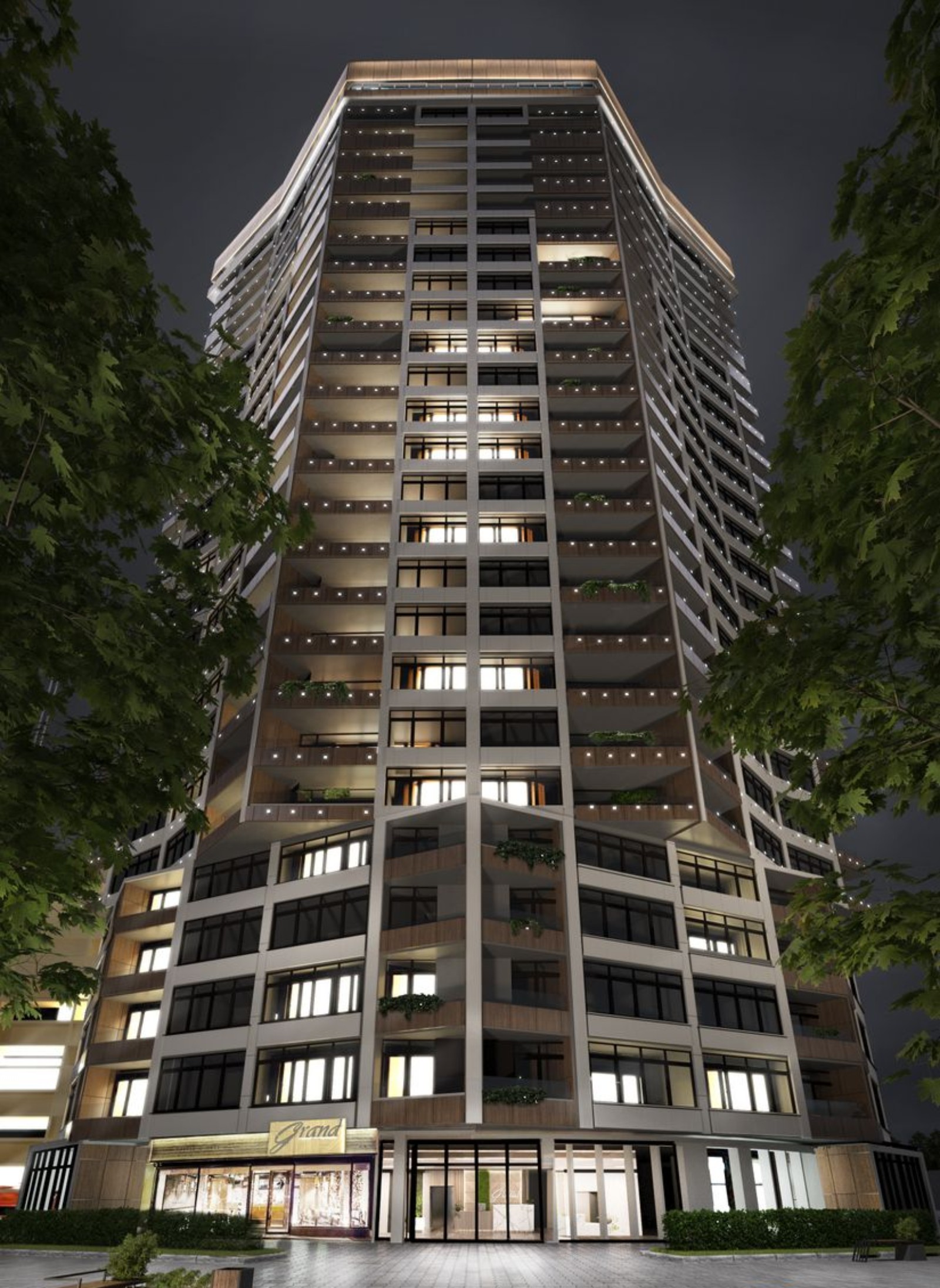 При выборе названия комплекса главной задачей являлось отобразить атмосферу комфорта и величия. ЖК GRAND включает недвижимость сегмента premium business class. Здание выделяется нестандартным фасадным решением и архитектурной выразительностью. Основная концепция заключается в гармоничном сочетании динамичности и яркости с лаконичностью и сдержанностью. Отделка входных групп и холла выполнена согласно авторскому дизайну, совмещающий эко-стиль и элементы современного интерьера. Общественные зоны оформят с использованием натуральных материалов, например, керамогранита и декоративных шпонированных панелей.