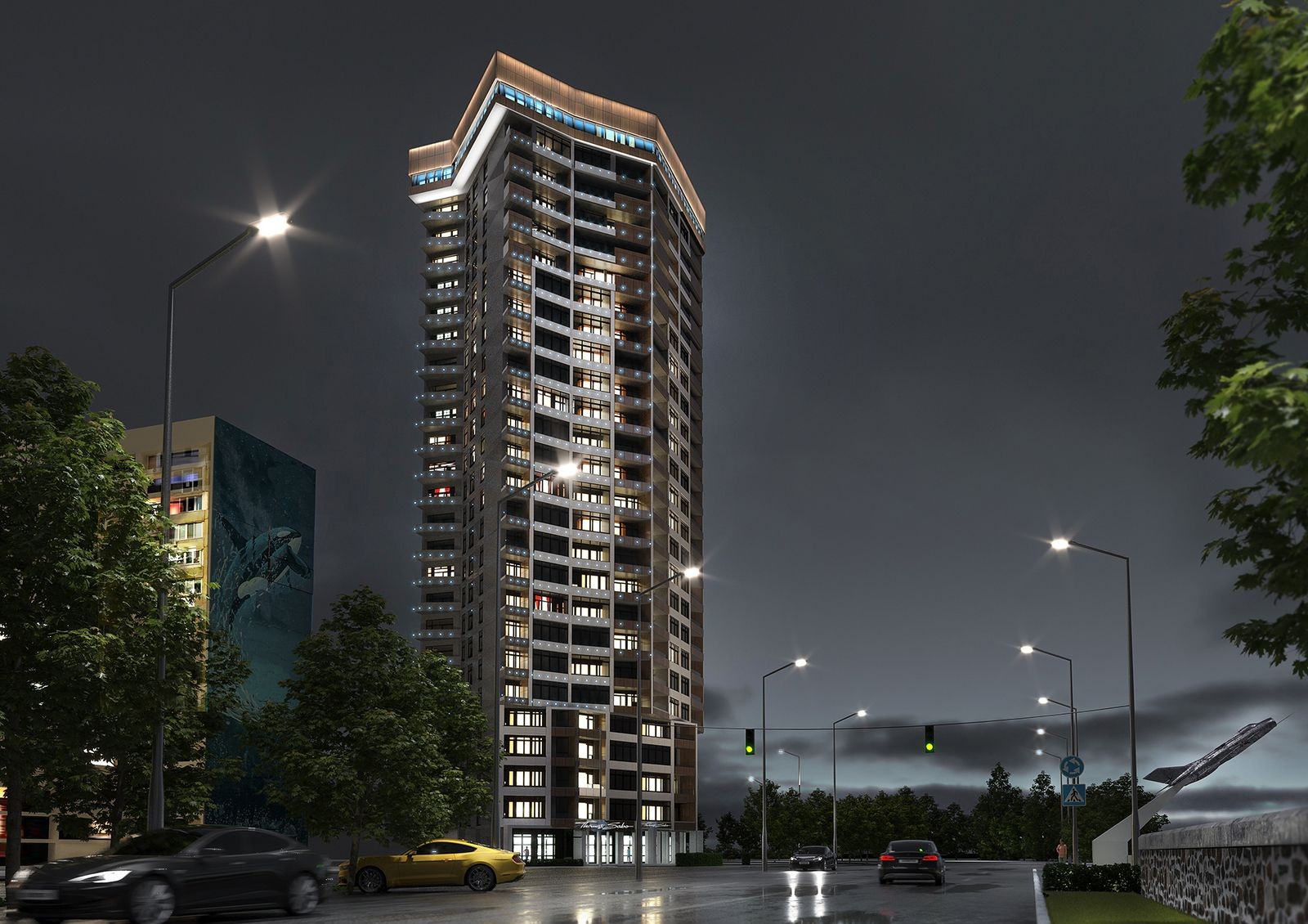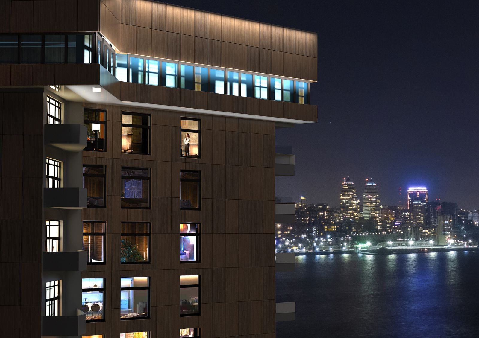 Комплекс построен на первой линии реки Днепр — благодаря такому расположению и большим панорамным окнам жильцы смогут ежедневно наслаждаться пейзажами на правобережье. Строительная компания планирует создать комплекс с автономной инфраструктурой — на первом этаже ЖК откроют магазины, кофейни, аптеки и салоны красоты. План цокольного этажа включает спортивный комплекс, прачечные и помещения технического назначения. Главная изюминка — ресторан на верхнем этаже с уникальной смотровой площадкой.