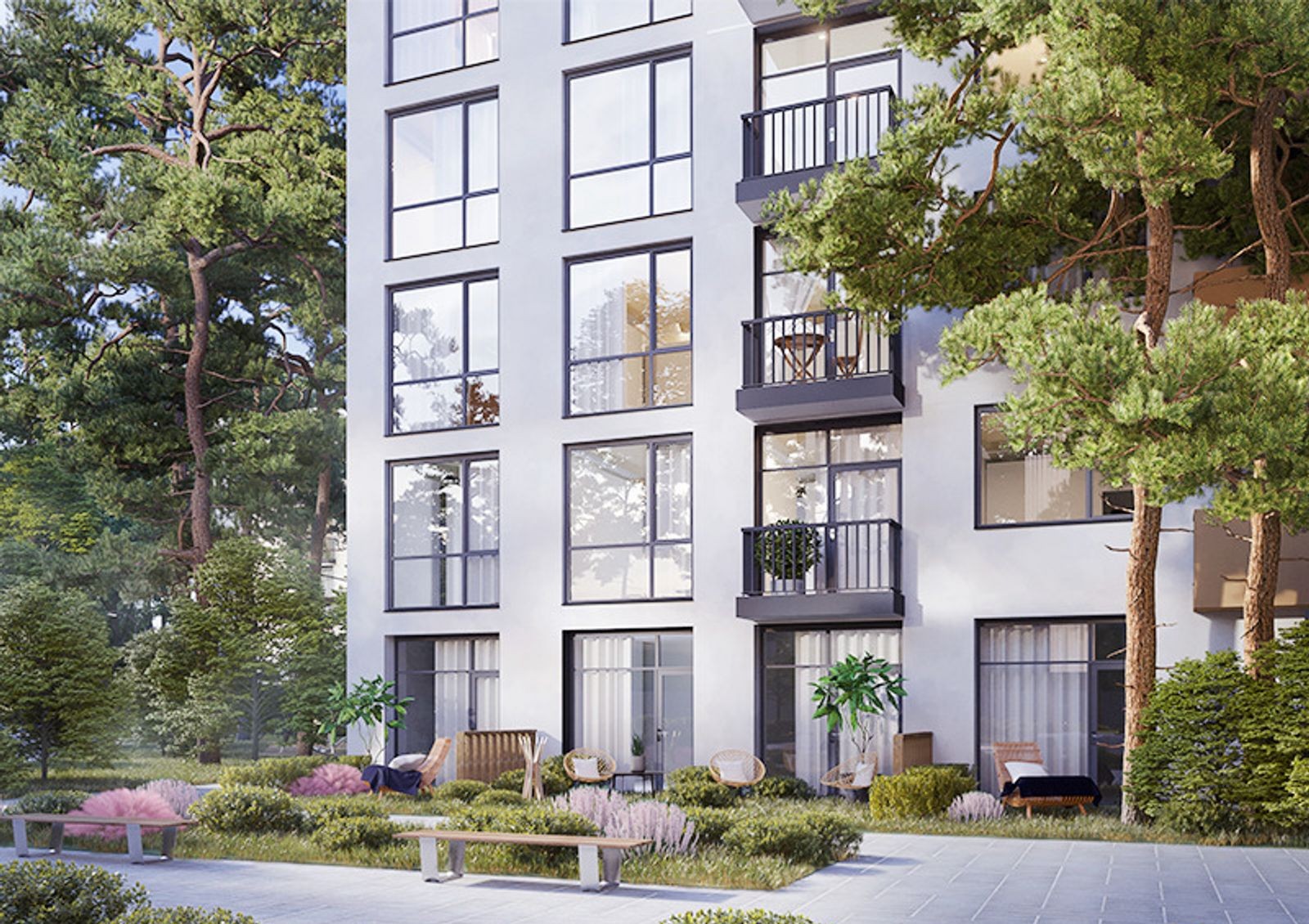 широкое разнообразие планировок площадью от 36 м2 до 92 м² с балконами, террасами или патио