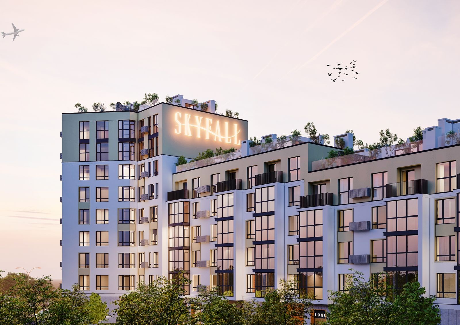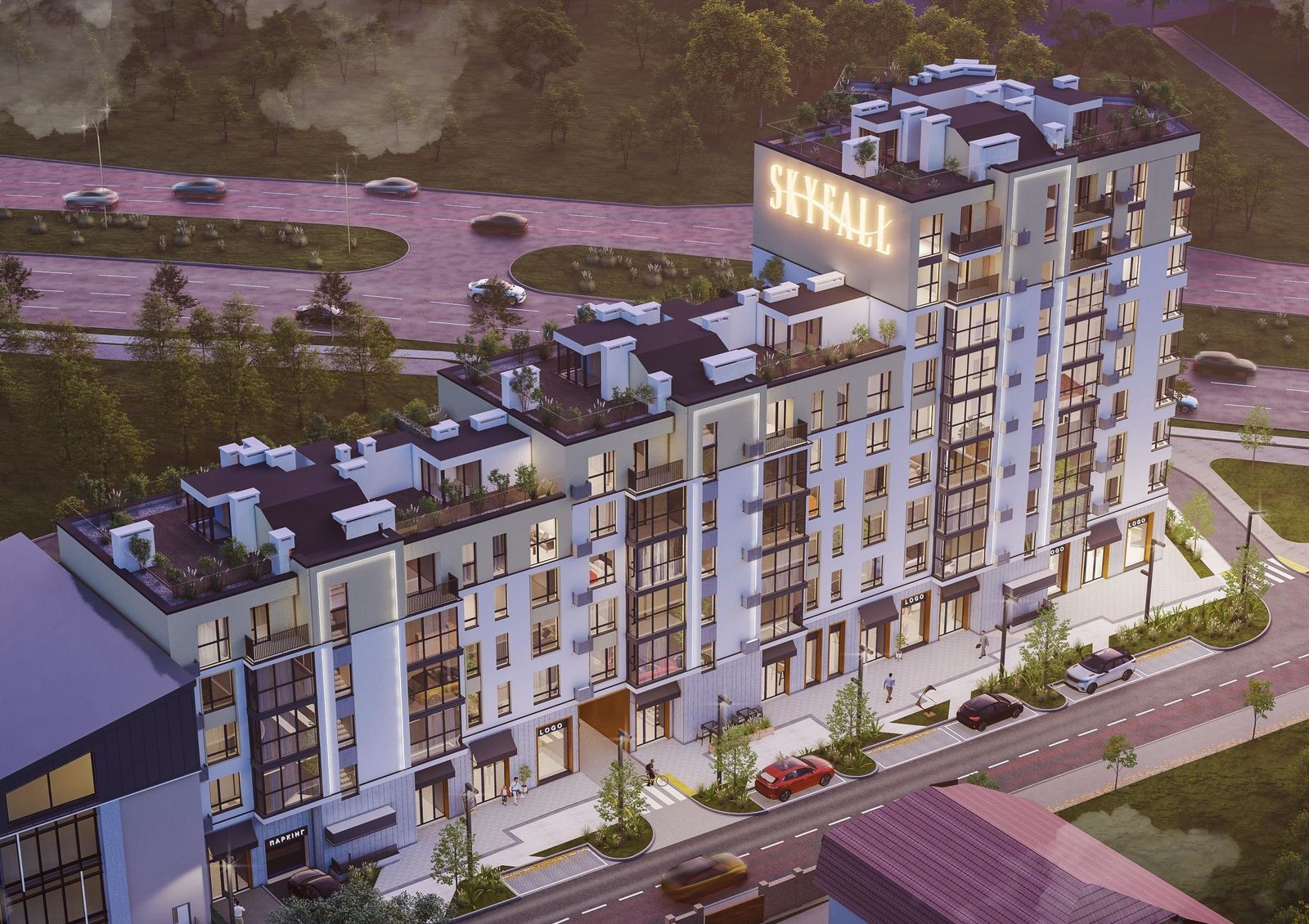 Жилой комплекс Skyfall — авторский проект, разработанный победителями международного конкурса «Хрустальный кирпич». На фоне соседних построек его выделяет панорамное остекление, применение разной этажности и озелененные крыши. Из окон квартир открываются виды на парковую зону, аллеи которой станут любимым местом отдыха жильцов. Во внутреннем дворе обустроены зоны отдыха для взрослых и современная детская площадка для разных видов активностей. Благодаря наличию подземного паркинга дети смогут безопасно играть около дома, а взрослые чувствовать себя спокойно, прогуливаясь вдоль пешеходных аллей. Для развития внутренней инфраструктуры в комплексе предусмотрены коммерческие помещения на первом этаже.
