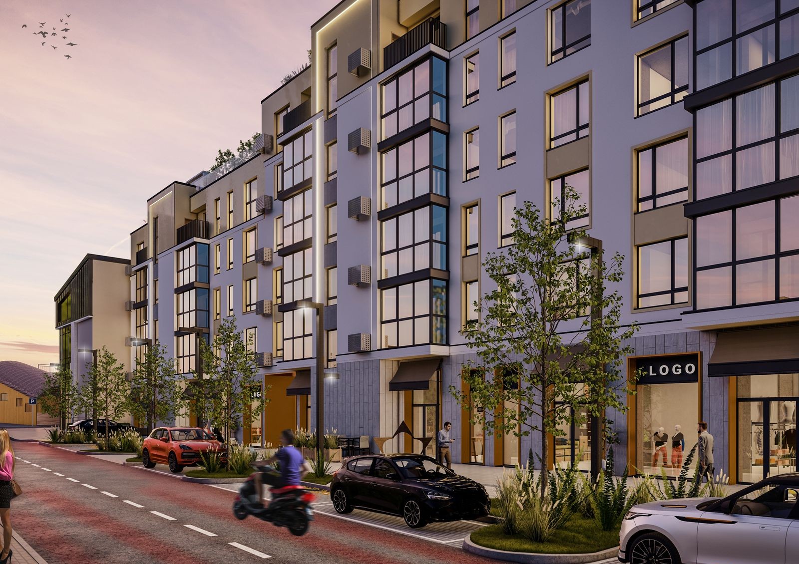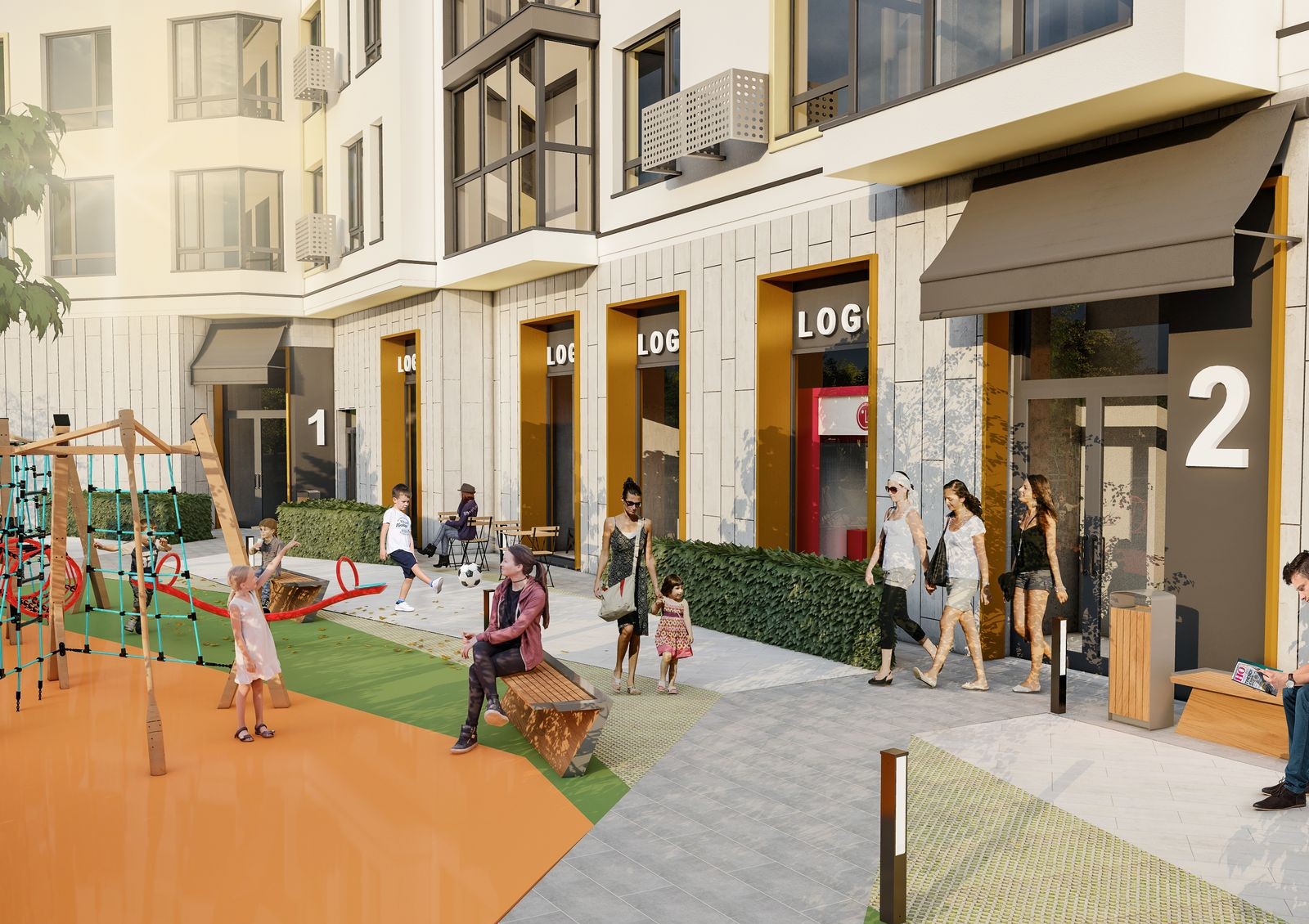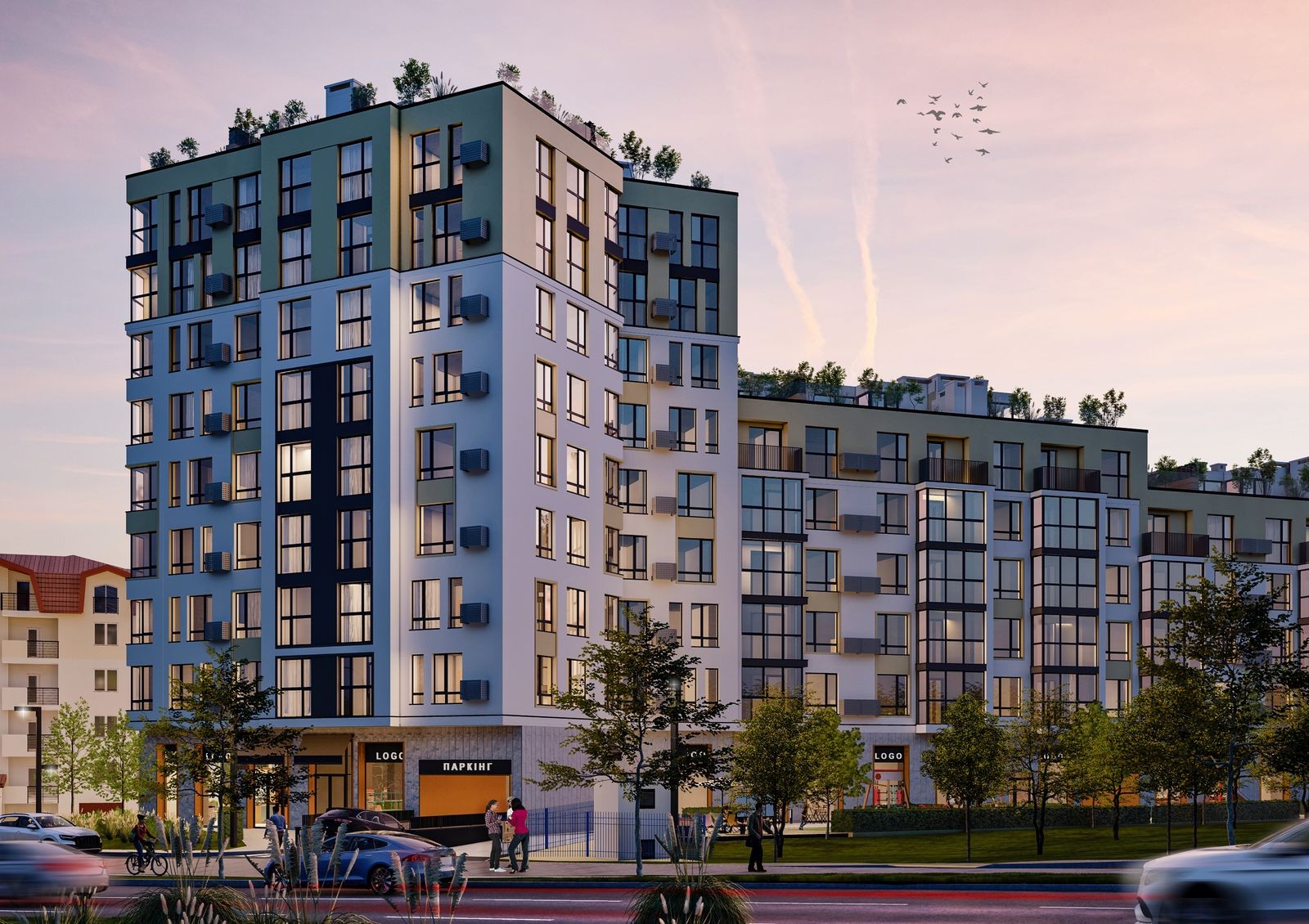 Новостройку окружают строительный гипермаркет «Новая Линия», торговый центр «Вам» с продуктовым супермаркетом «Сильпо» и большой торгово-выставочный комплекс «Южный» с более чем 1000 магазинами, ресторанами, фитнес-центрами и развлекательными заведениями. Здесь есть ледовый каток, детский игровой комплекс «Радуга», академия футбола «Клуб Лева — Південний», академия бокса Андрея Котельникова, спорткомплекс «Грация», лазерный клуб, роллердром, арт-студия, сквош центр и многое другое. Также в двух шагах от комплекса расположен ТРЦ Victoria Gardens с супермаркетом «Сильпо», сервисной инфраструктурой, различными магазинами, кинотеатром, боулинг-клубом и ресторанами.