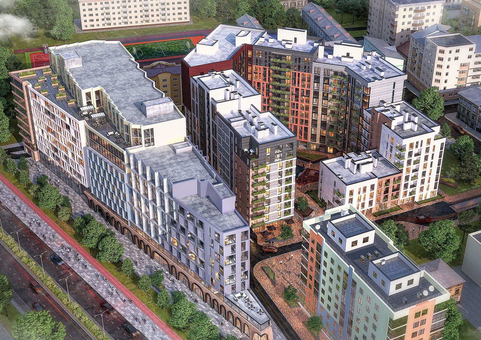 Mill Town — новый проект строительной компании «Интеграл-Буд» во Львове. Жилой комплекс выделяется применением разной этажности, панорамным остеклением, комбинированной отделкой фасадов из кирпича, штукатурки и панелей в классических коричневом, темно-сером и белом цветах, с которыми контрастируют бордо и ярко-красный.