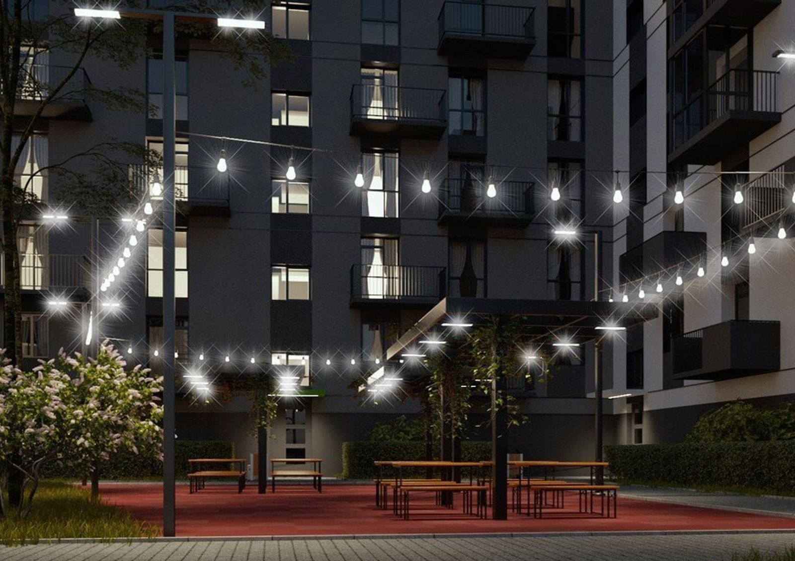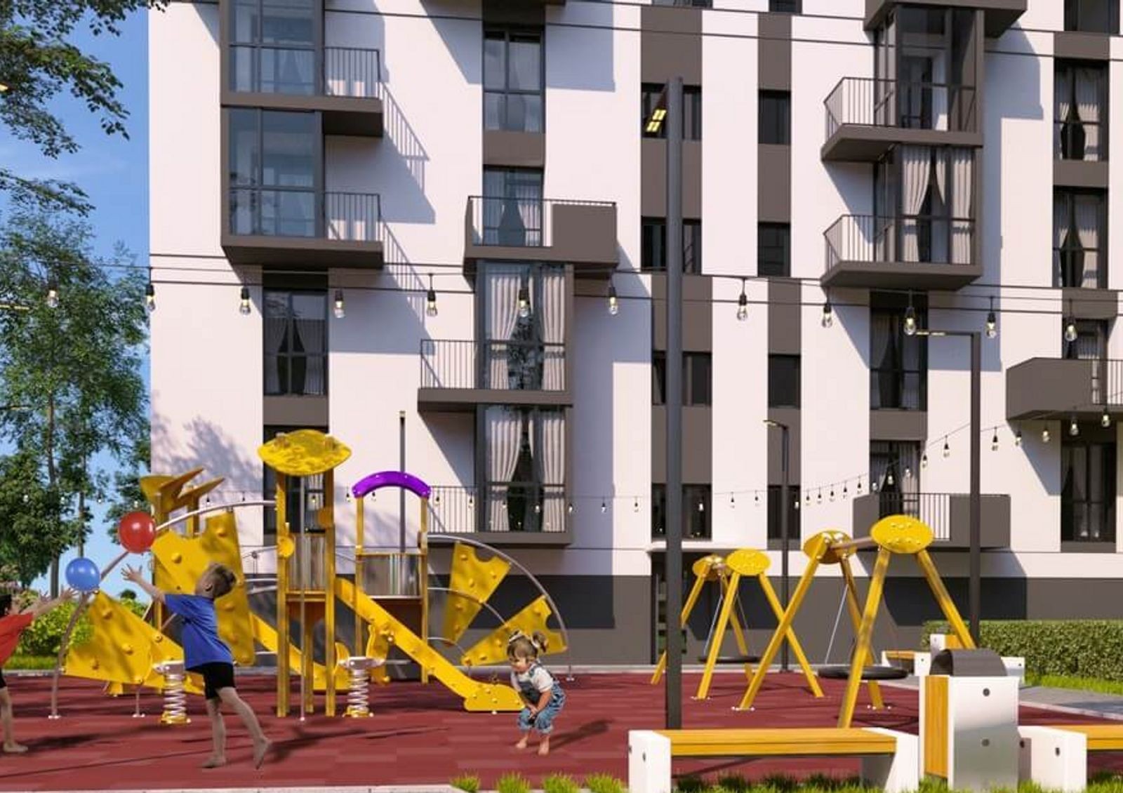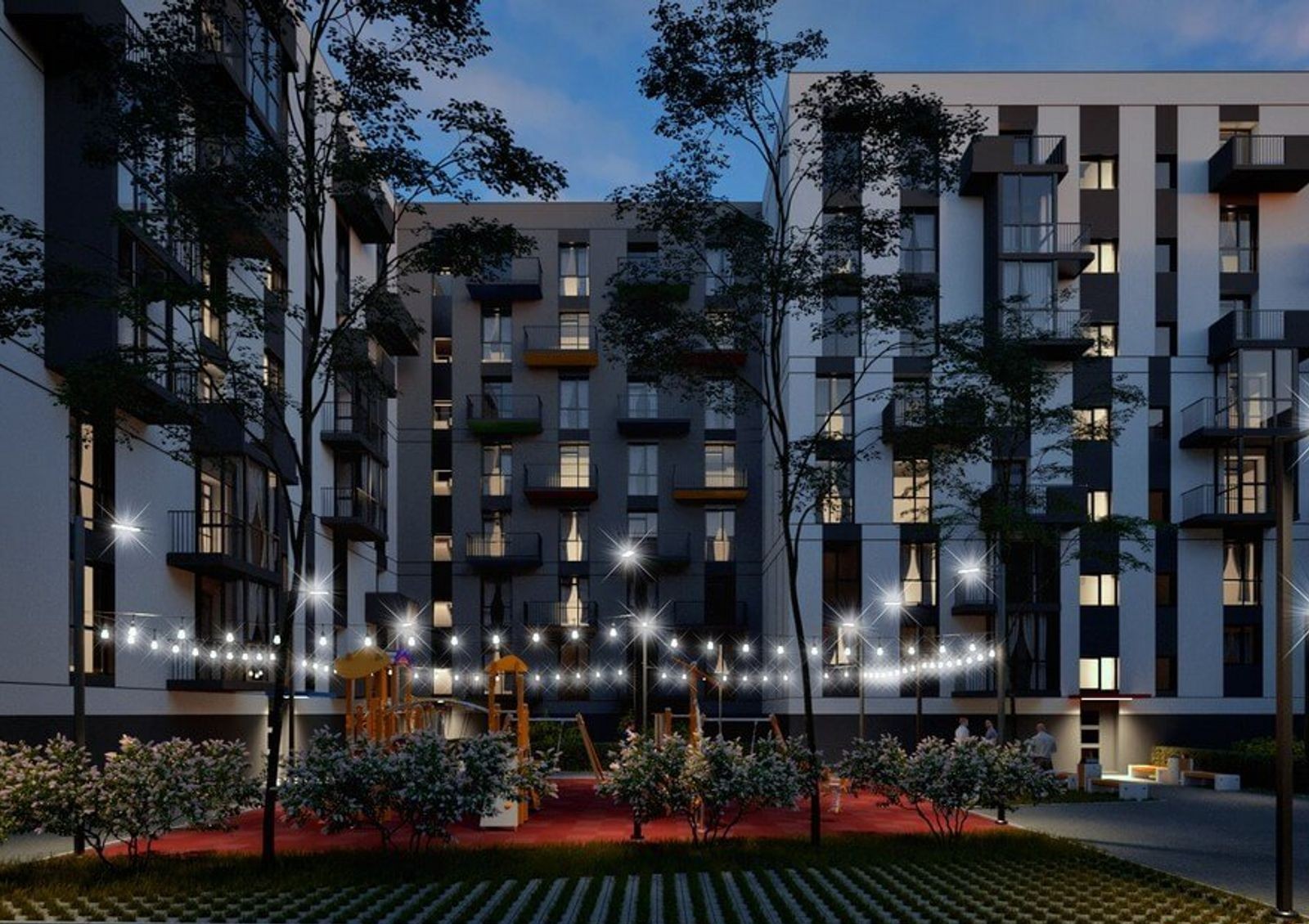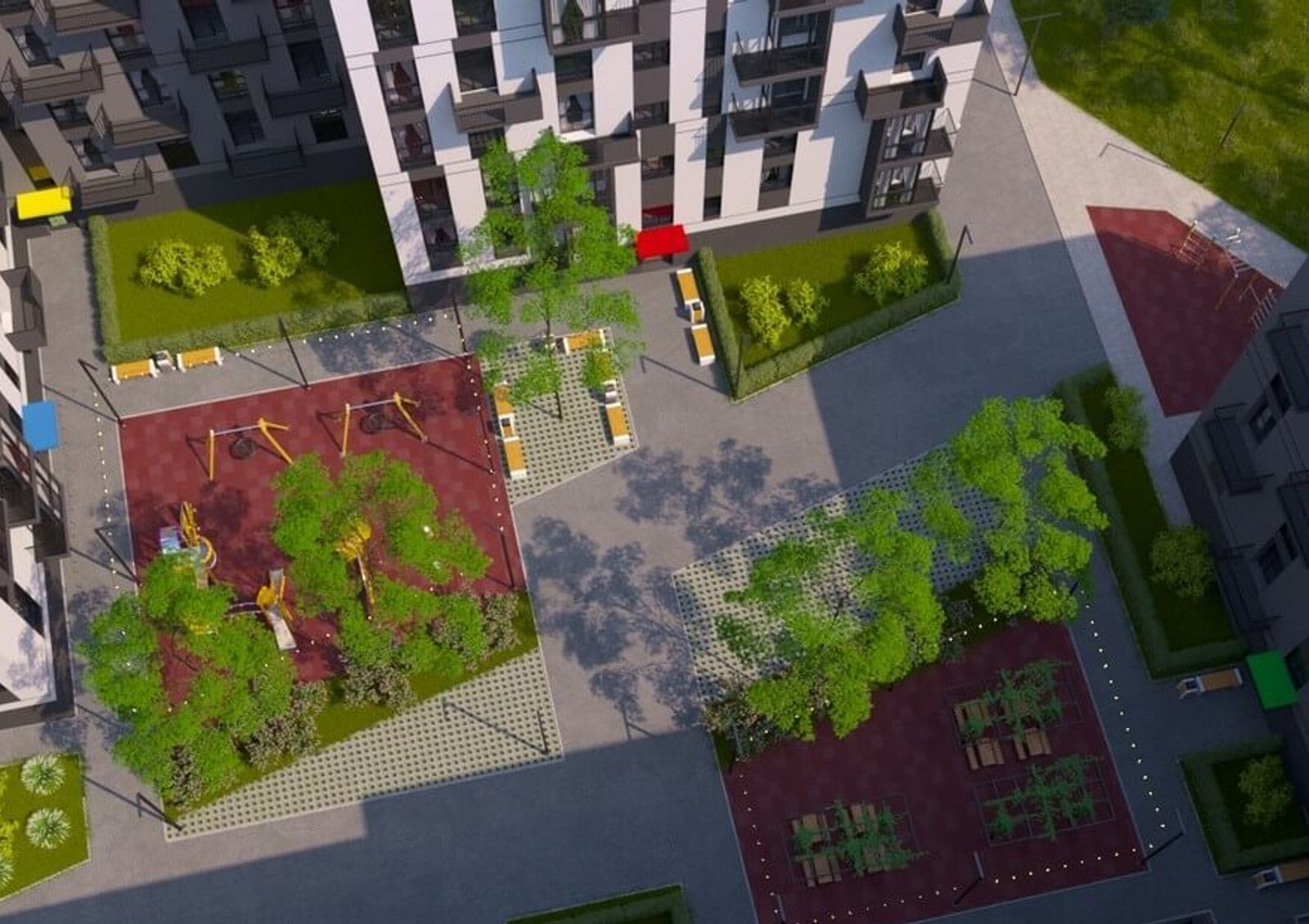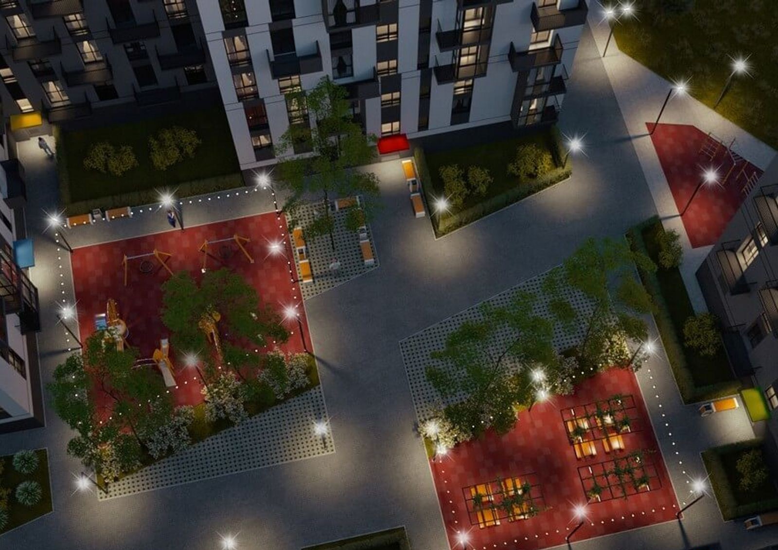 Придомовая территория организована в концепции «двор без авто», что позволит родителям спокойно отпускать детей во двор, где для них обустроен современный игровой городок. Также во дворе оборудовано место для занятий спортом и удобная парковка для автомобилей жильцов и гостей комплекса.