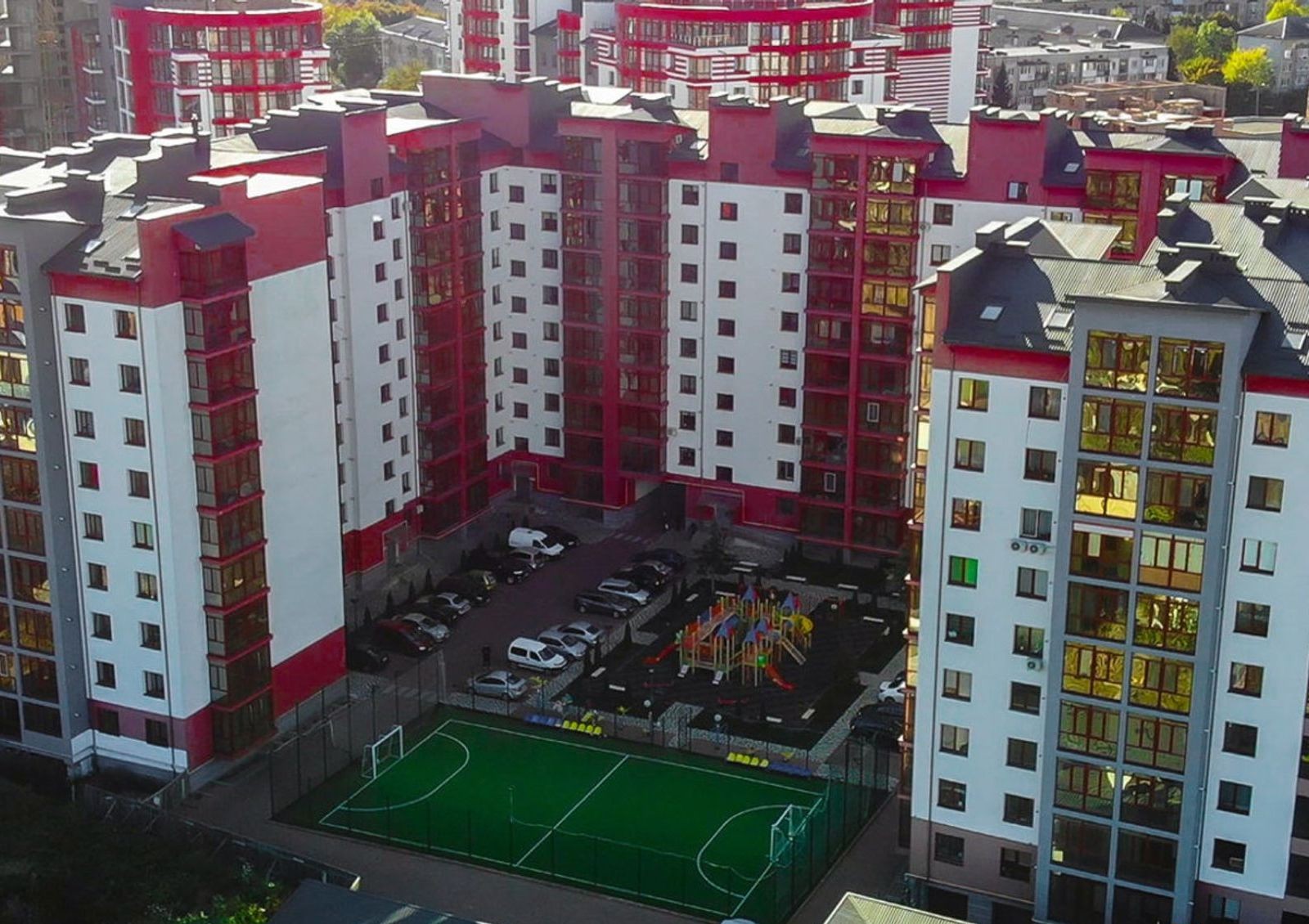 Микрорайон «Европейский city» – жилой комплекс с четырьмя отдельными новостройками в сумме на 25 подъездов. В каждой из них можно купить по приемлемой цене квартиры с удобными и практичными планировками. В каждый дом подведены коммуникации, установлены счетчики, радиаторы, двери и евро-окна. Также есть разводка электросети. Приятный бонус для жителей – стильные и яркие фасады домов.