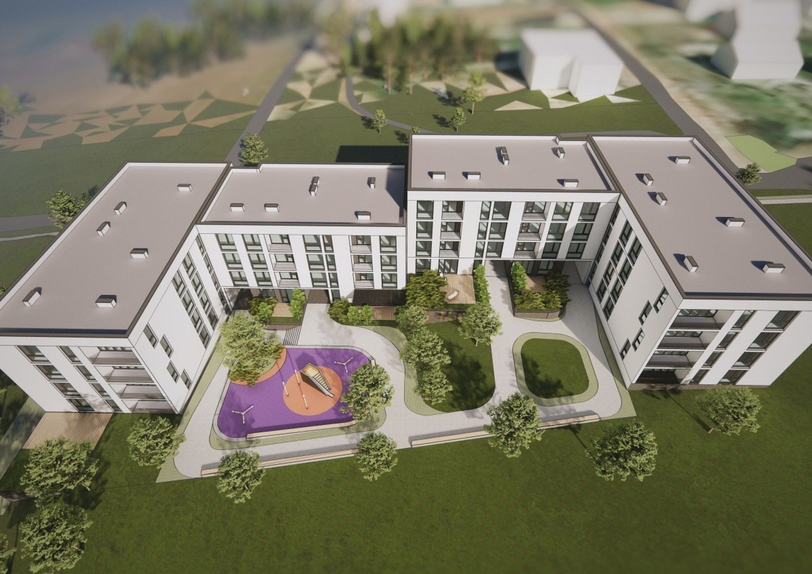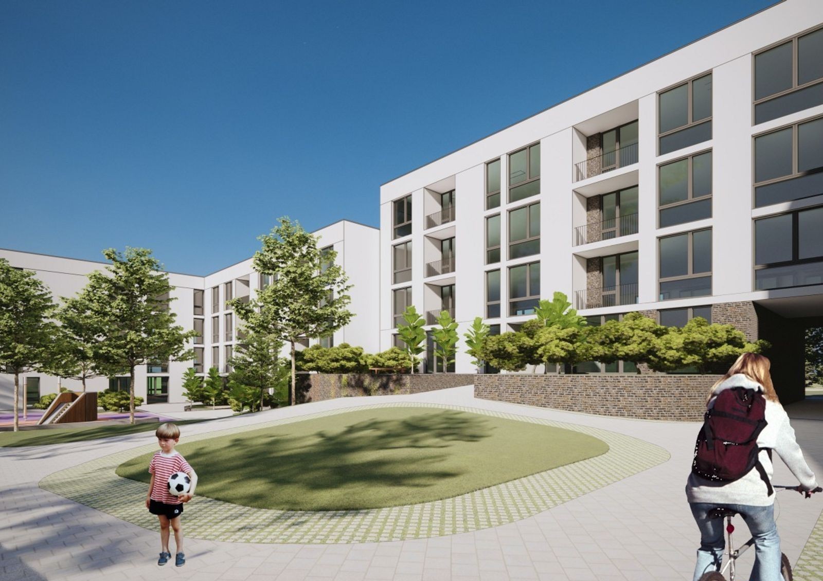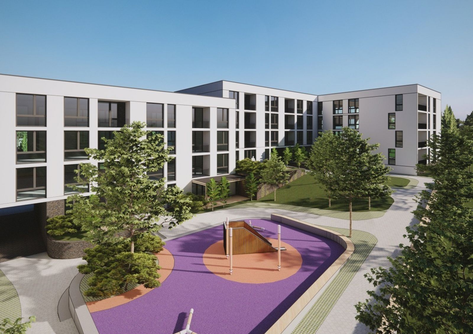 закрытая территория с концепцией «без авто и посторонних» оборудована автомобильными проездами и пешеходными аллеями