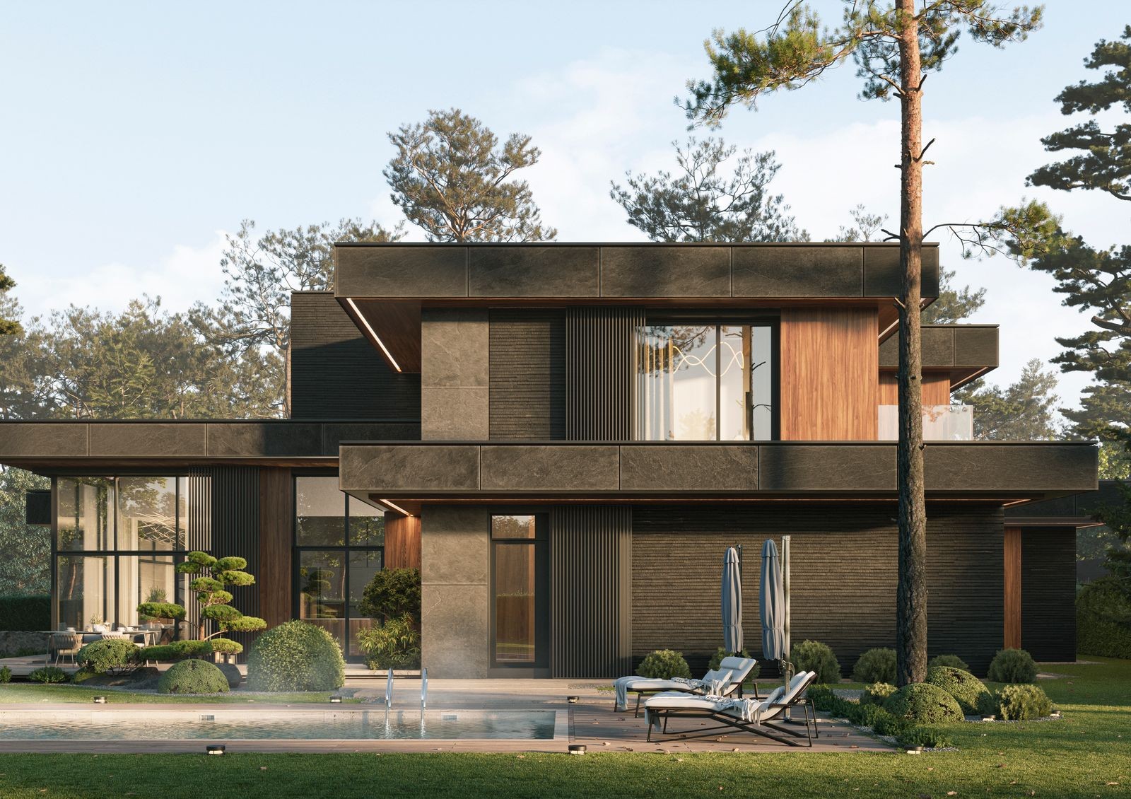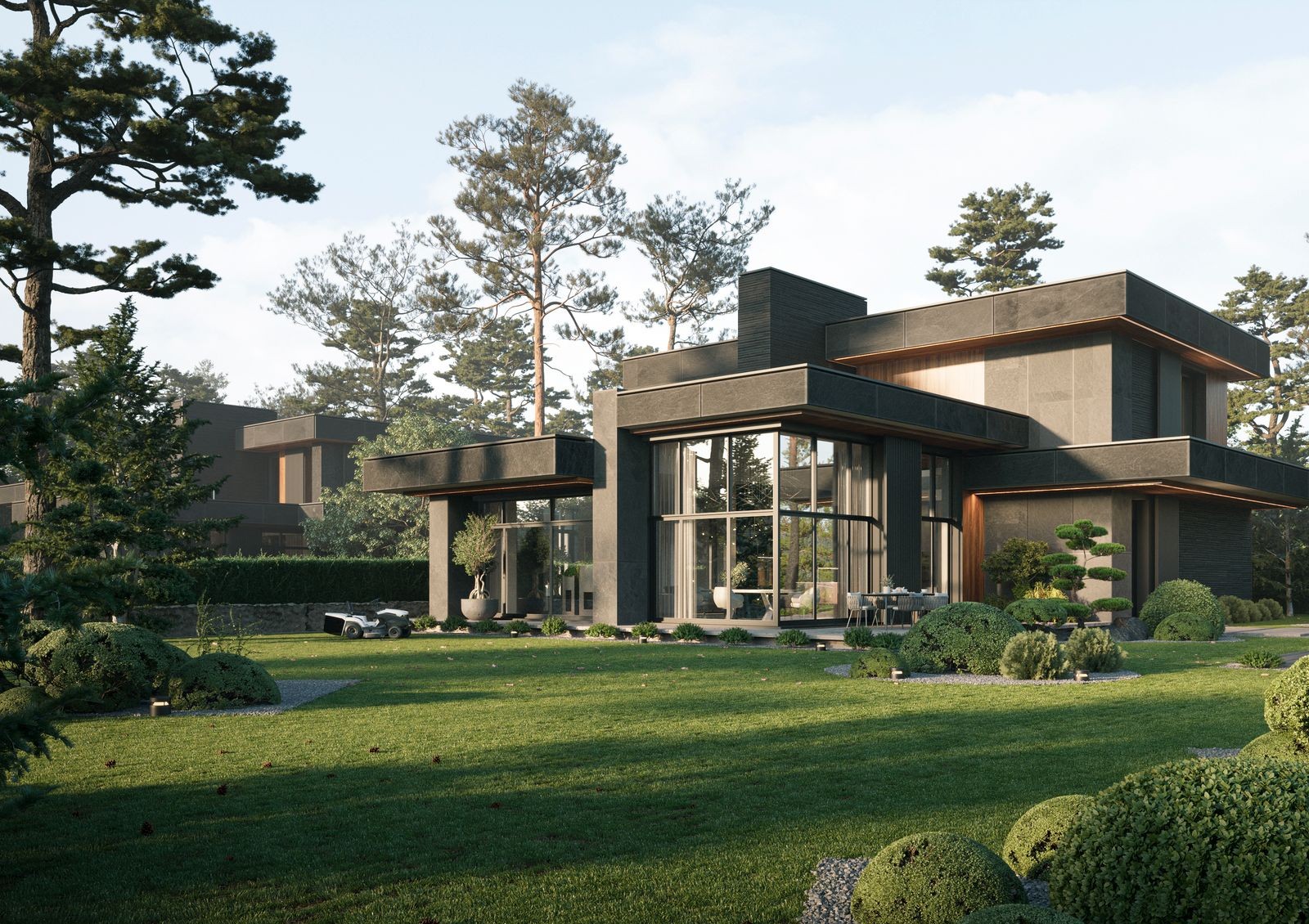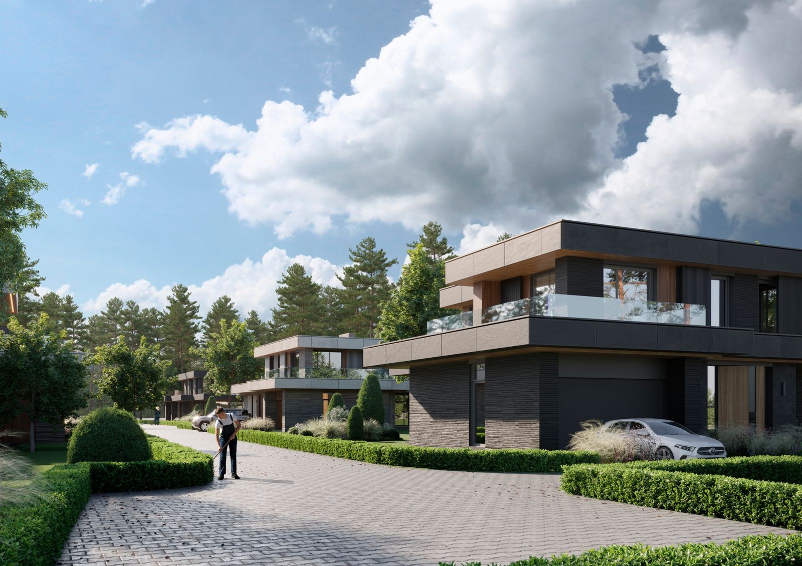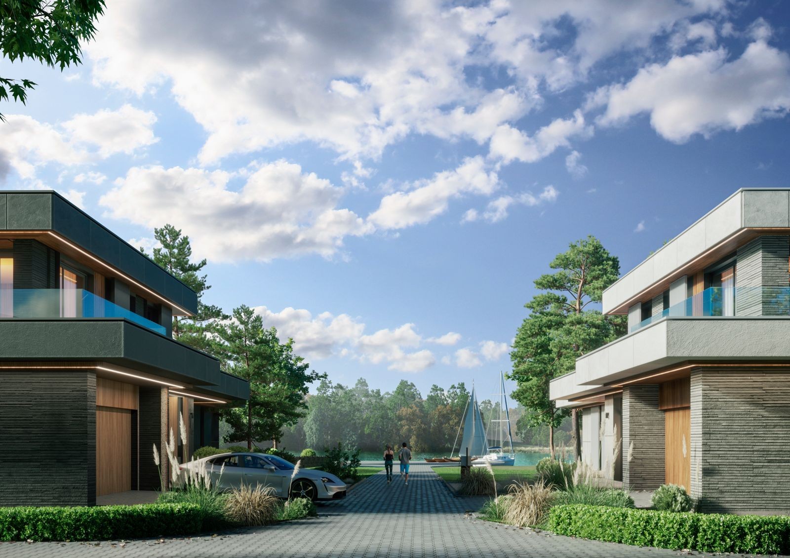 Данный проект бросает вызов привычному стилю «роскоши» Конча-Заспы. Вместо вычурных вензелей — строгость минимализма, вместо лепнины — натуральное дерево и стекло, вместо нерациональных пространств — эргономичные планировки, вместо высоких заборов — общественные пространства. Для отдыха будущих жильцов предусмотрены барбекю-зона с выходом к речке Козинка, рыболовный причал, спортивная и детская площадки.
