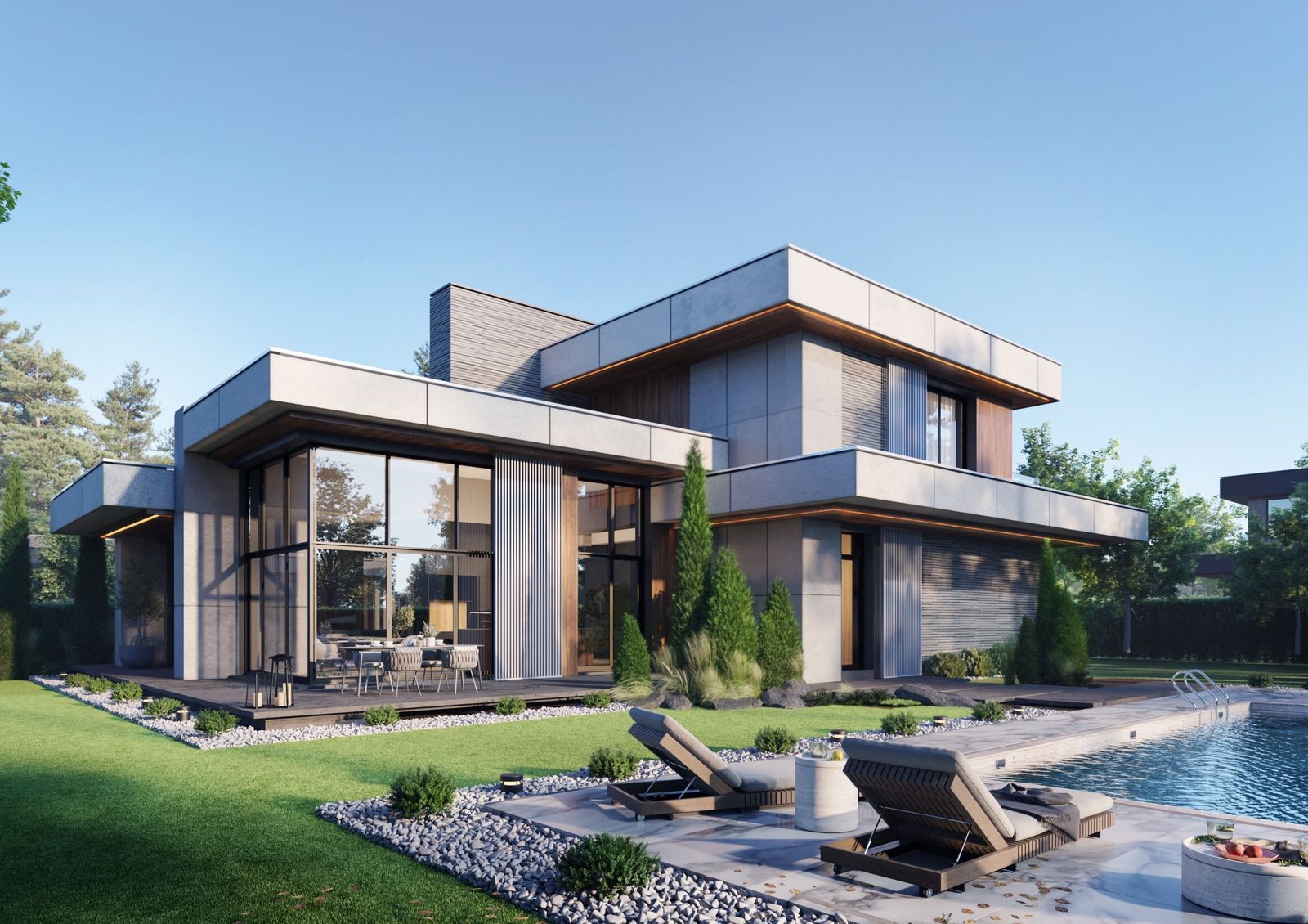 современный архитектурный стиль коттеджей со светлым или темным фасадом на выбор покупателя