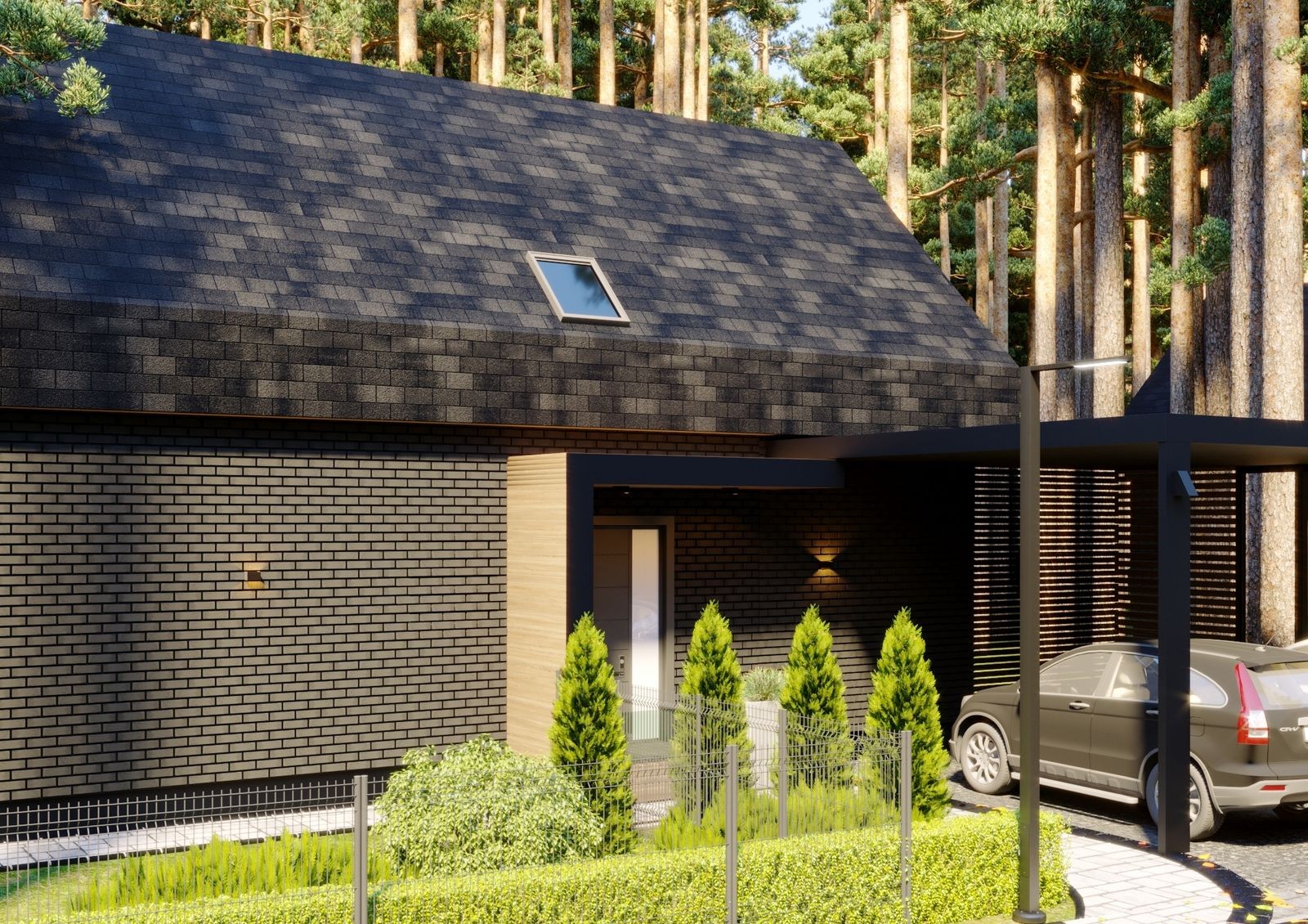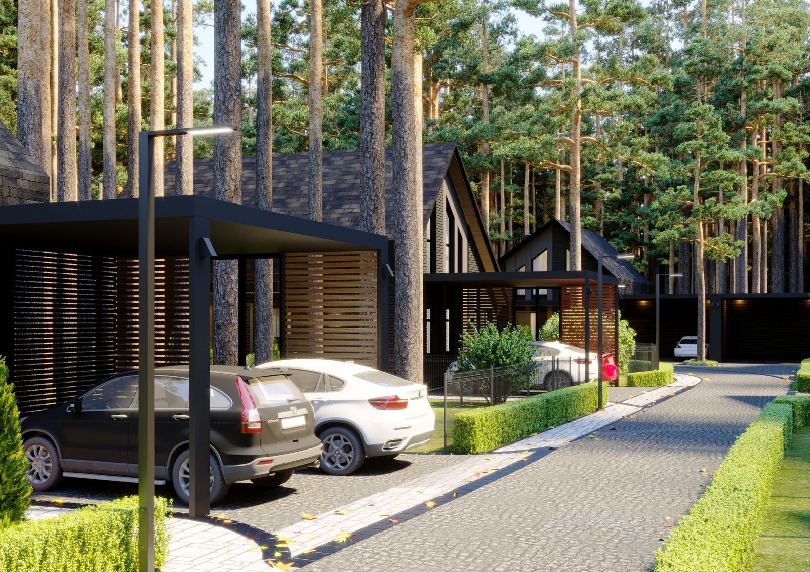 Концепция комплекса предусматривает крытые паркоместа на два автомобиля для каждого внутреннего дома и заезд на два паркоместа с автоматическими раздвижными воротами для первых двух домов. Также предусмотрена станция для зарядки электромобилей на одно паркоместо для каждого дома.