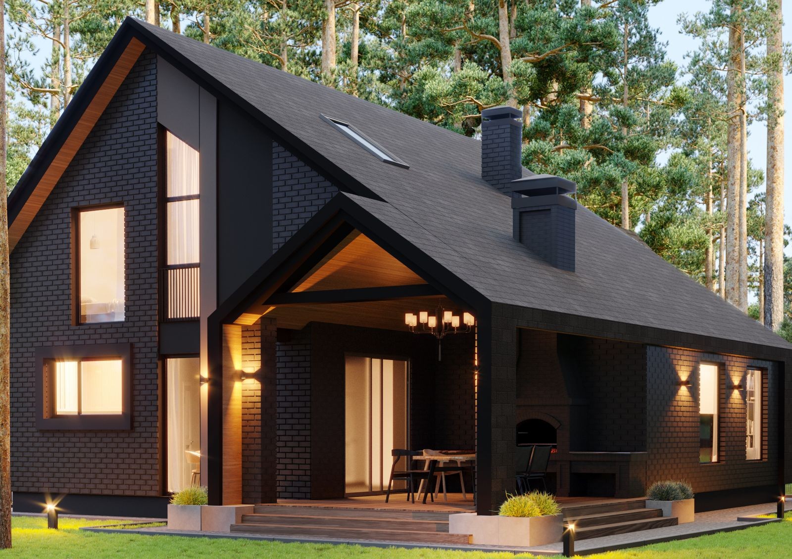планировка каждого коттеджа предусматривает просторную крытую террасу, украшенную керамической плиткой и оборудованную столешницей под кухню для удобного приготовления на улице с возможностью установить мангал