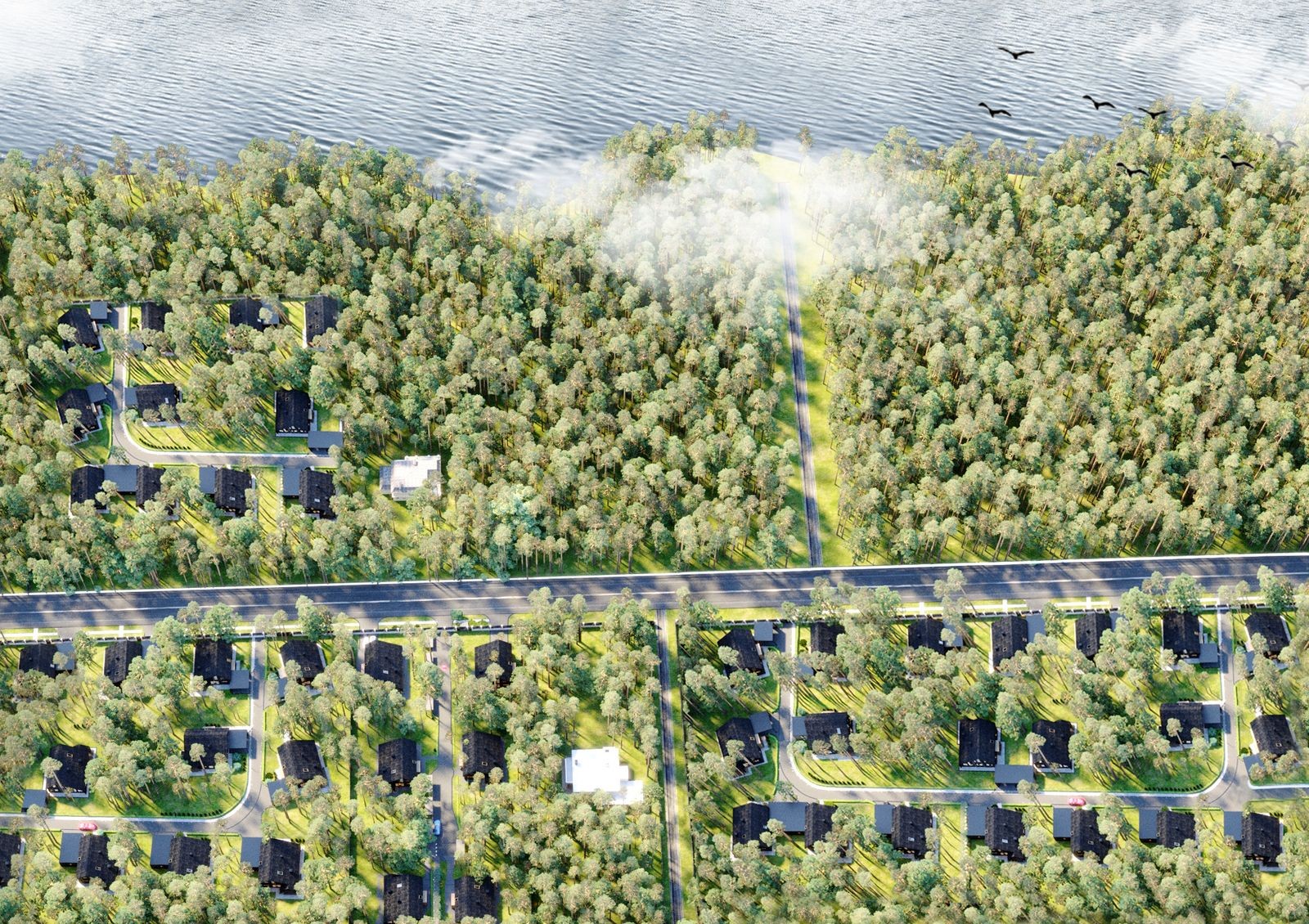 Название коттеджного городка Green Lake связано с его локацией — дома расположены прямо посреди соснового леса и рядом с каскадом озер. Этот район принято называть украинской Швейцарией благодаря живописной природе и хорошей экологии.