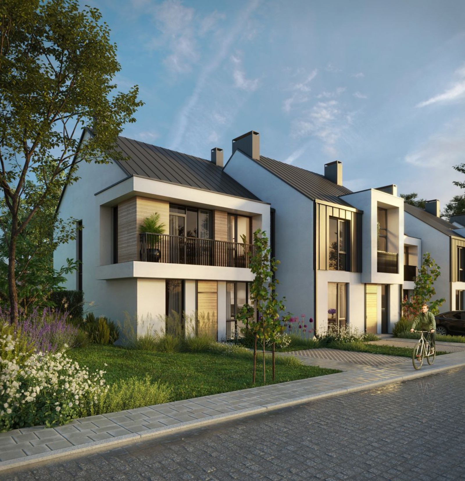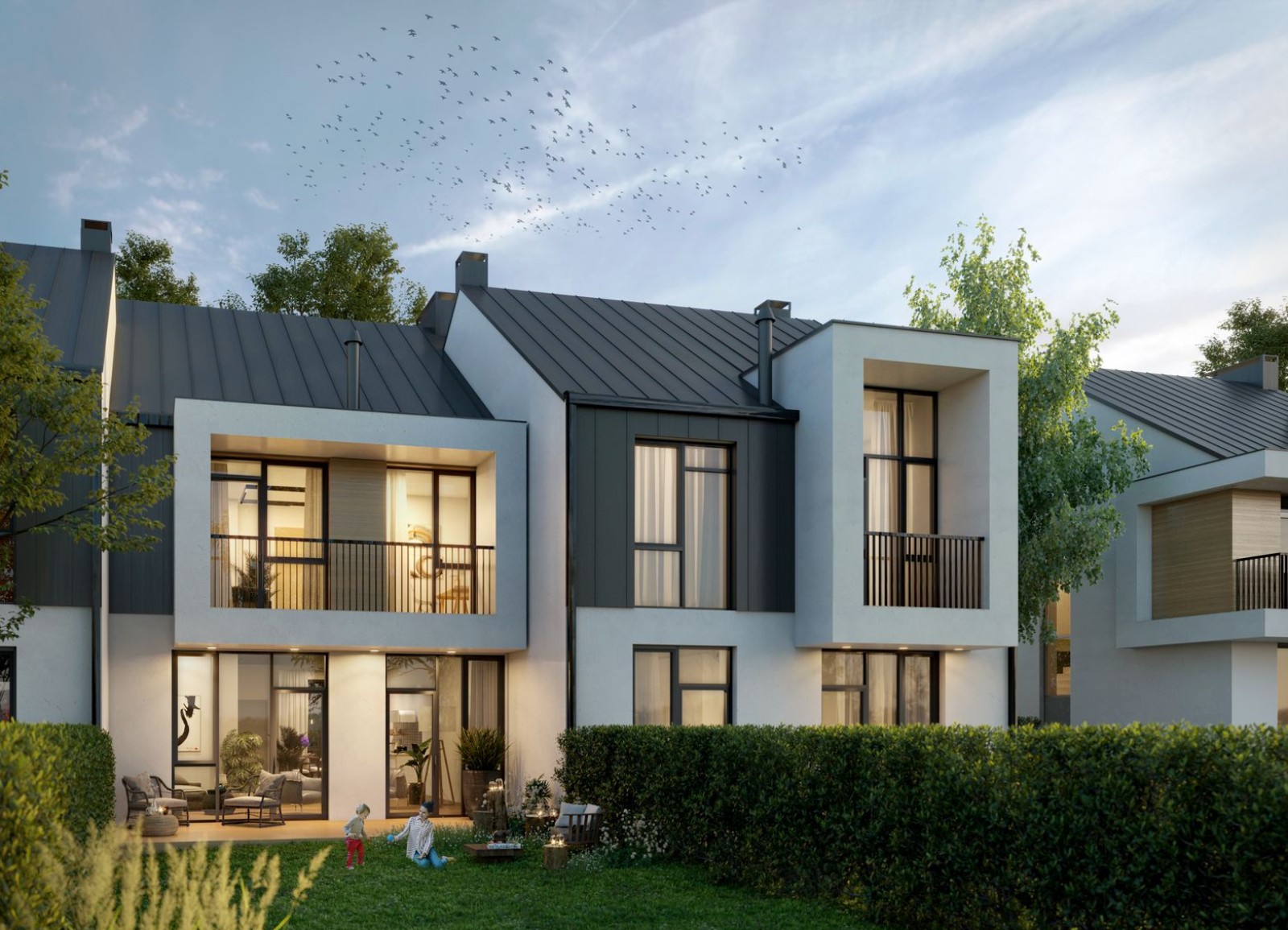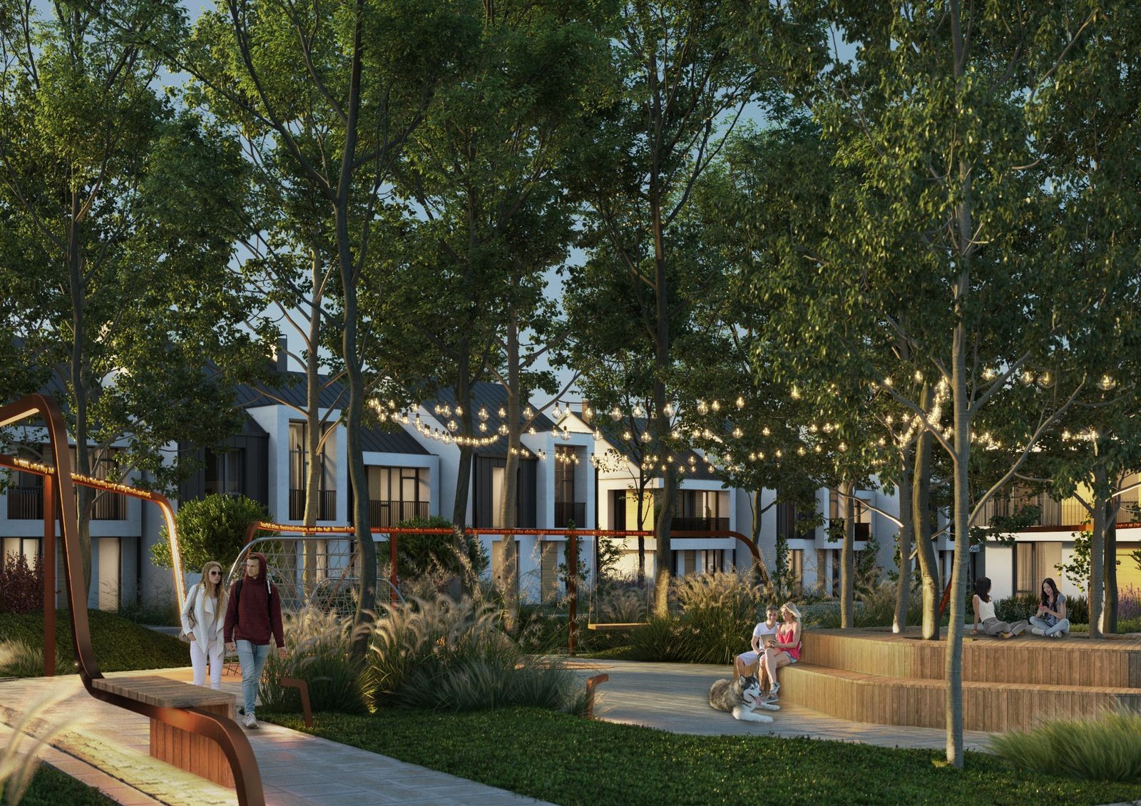 Коттеджный городок Loft Affair представлен 48 домами, объединенных общей архитектурной идеей. Многоуровневый фасад со светлой отделкой и деревянными элементами, фальцевая кровля темного цвета, панорамные окна и открытые террасы — все это характеризует внешний вид коттеджей Loft Affair. На выбор покупателей доступно три варианта планировок: на 102 м2, 107 м2 и 130 м2. Благодаря эргономичному зонированию, продуманному расположению комнат, а также окнам в пол в домах будет много света, пространства и воздуха. К каждому коттеджу прилегает собственный земельный участок площадью от 1,4 до 3 соток, где можно обустроить барбекю-зону с бассейном и лежаками.