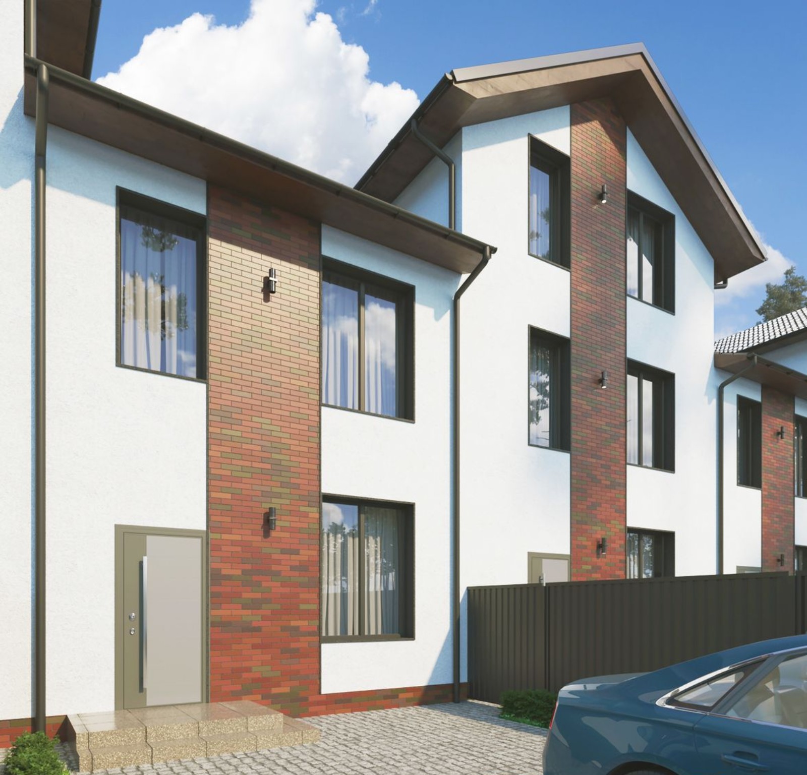 перед коттеджем место для парковки, вымощенное тротуарной плиткой