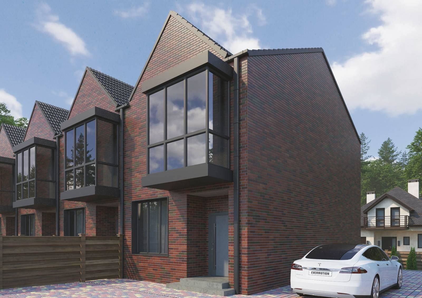 Проектом таунхаусов предусмотрены кухня-студия с выходом на террасу, 4 спальни, 2 санузла и 2 гардеробных. На втором этаже — полностью стеклянный балкон, с которого открывается вид на город, перед домом — место для стоянки автомобиля.