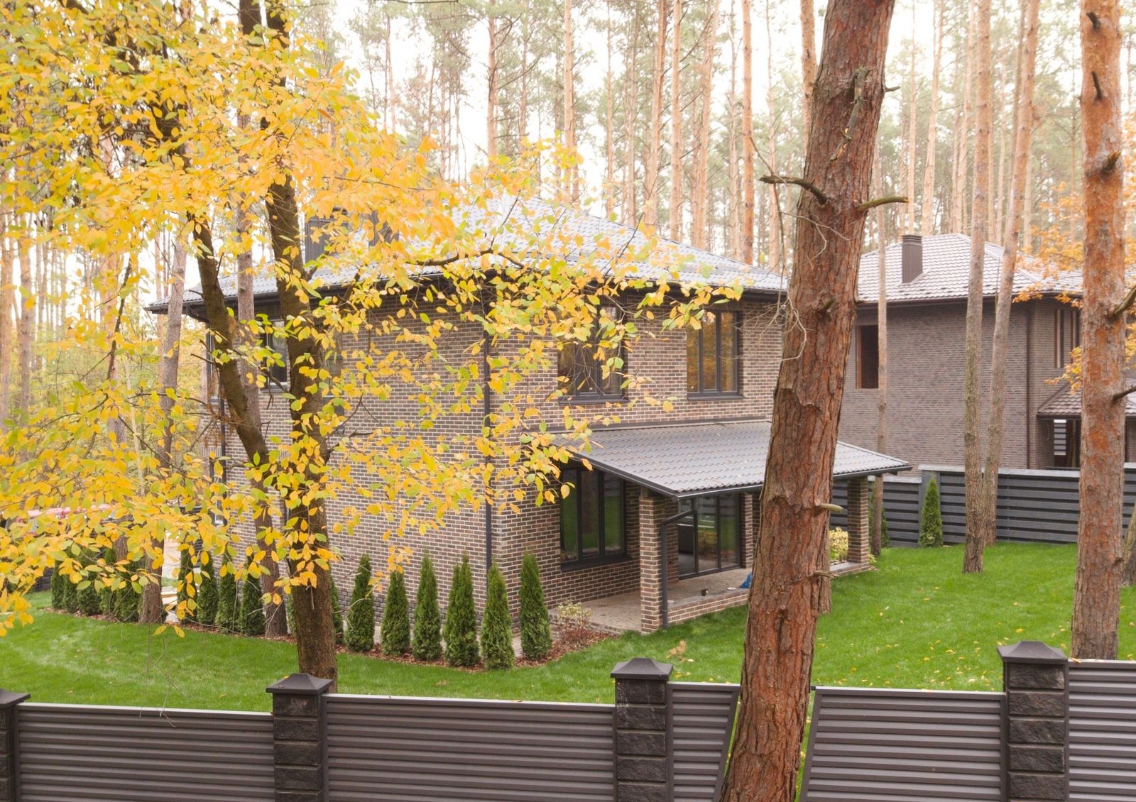 каждый участок огорожен и озеленен, пешеходные аллеи и паркоместа для автомобилей вымощены брусчаткой