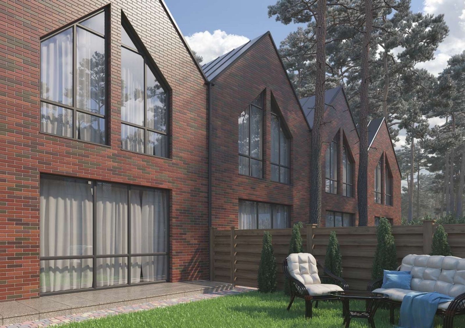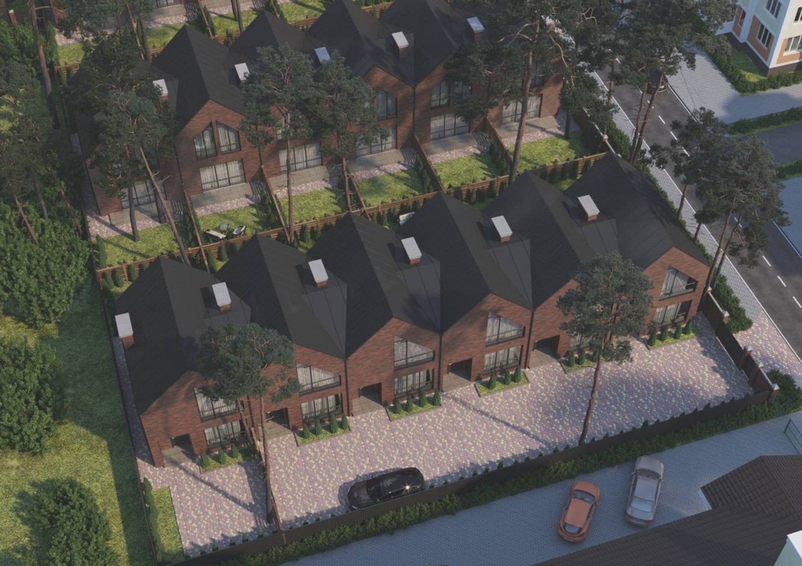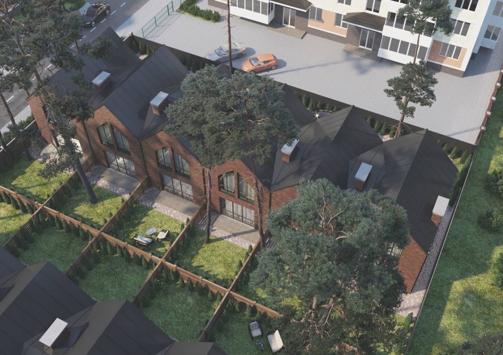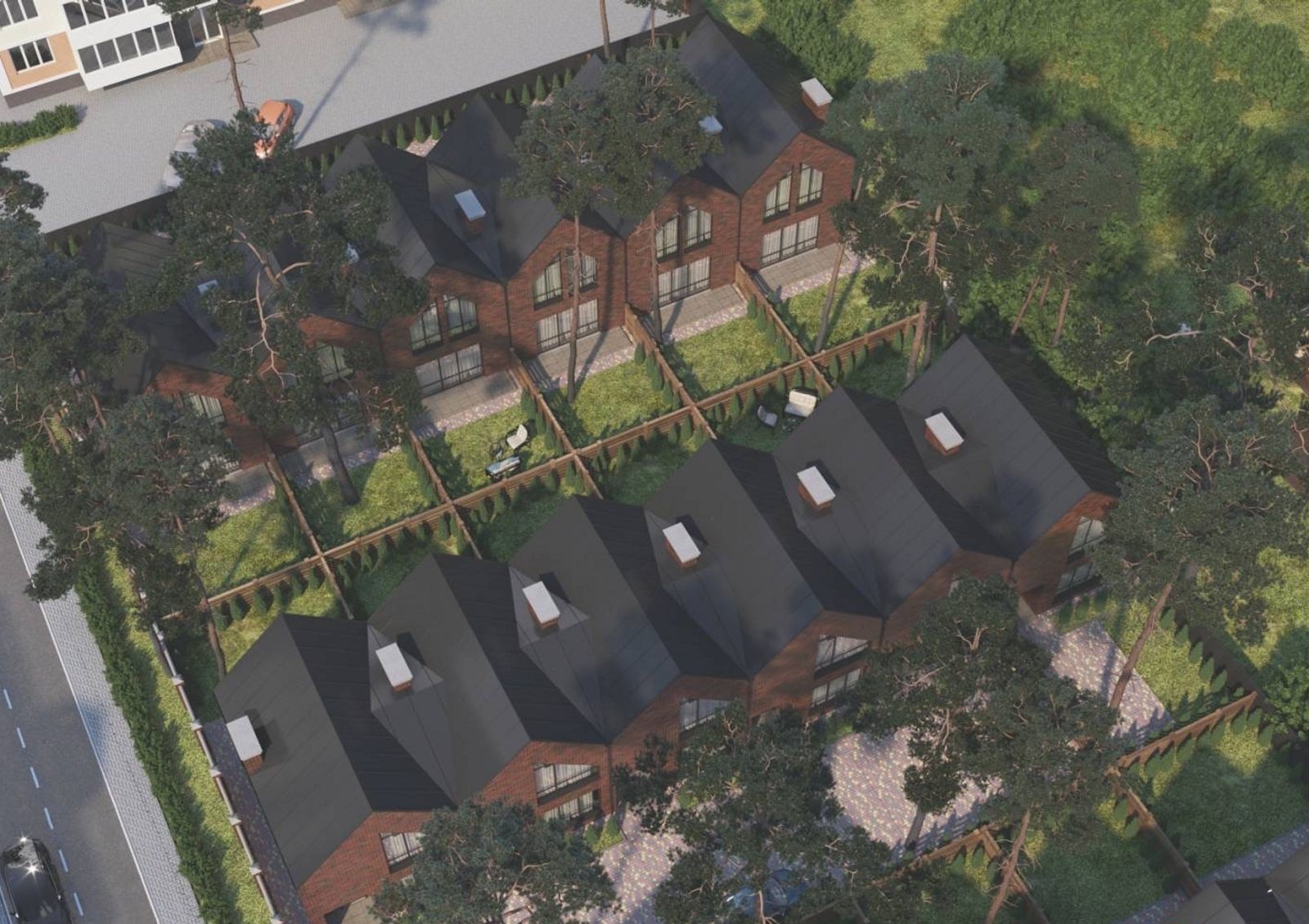 Расположение домов, задних и передних дворов продумано так, чтобы жильцы таунхаусов могли наслаждаться тишиной и покоем в своих небольших, но уютных дворах с предусмотрительно сохраненными застройщиком вековыми соснами.