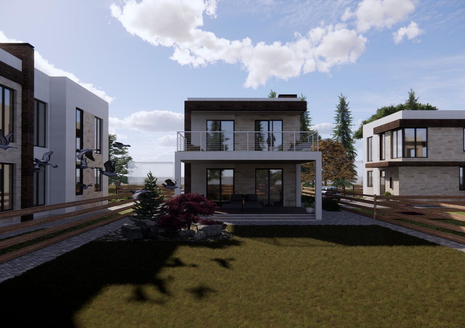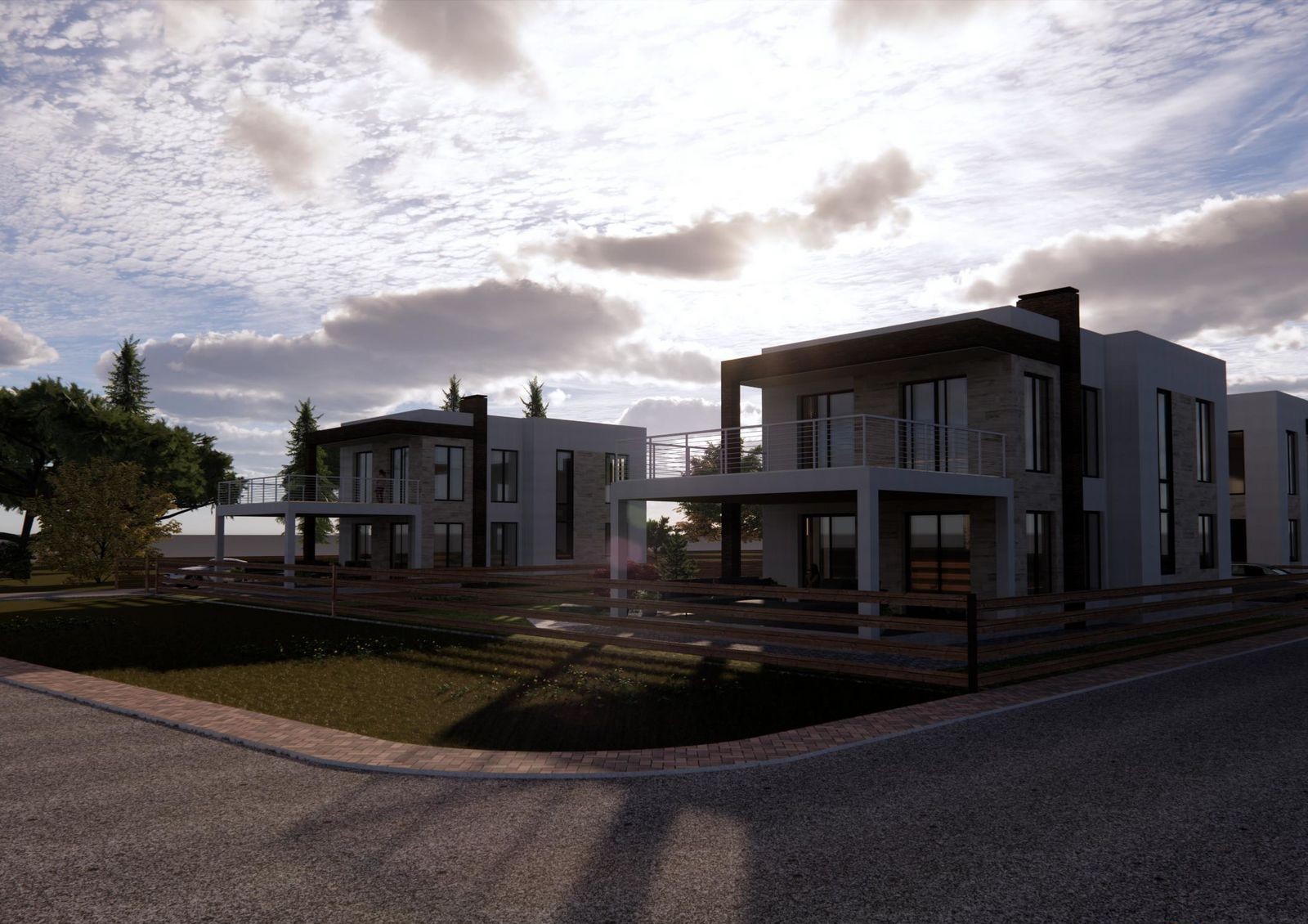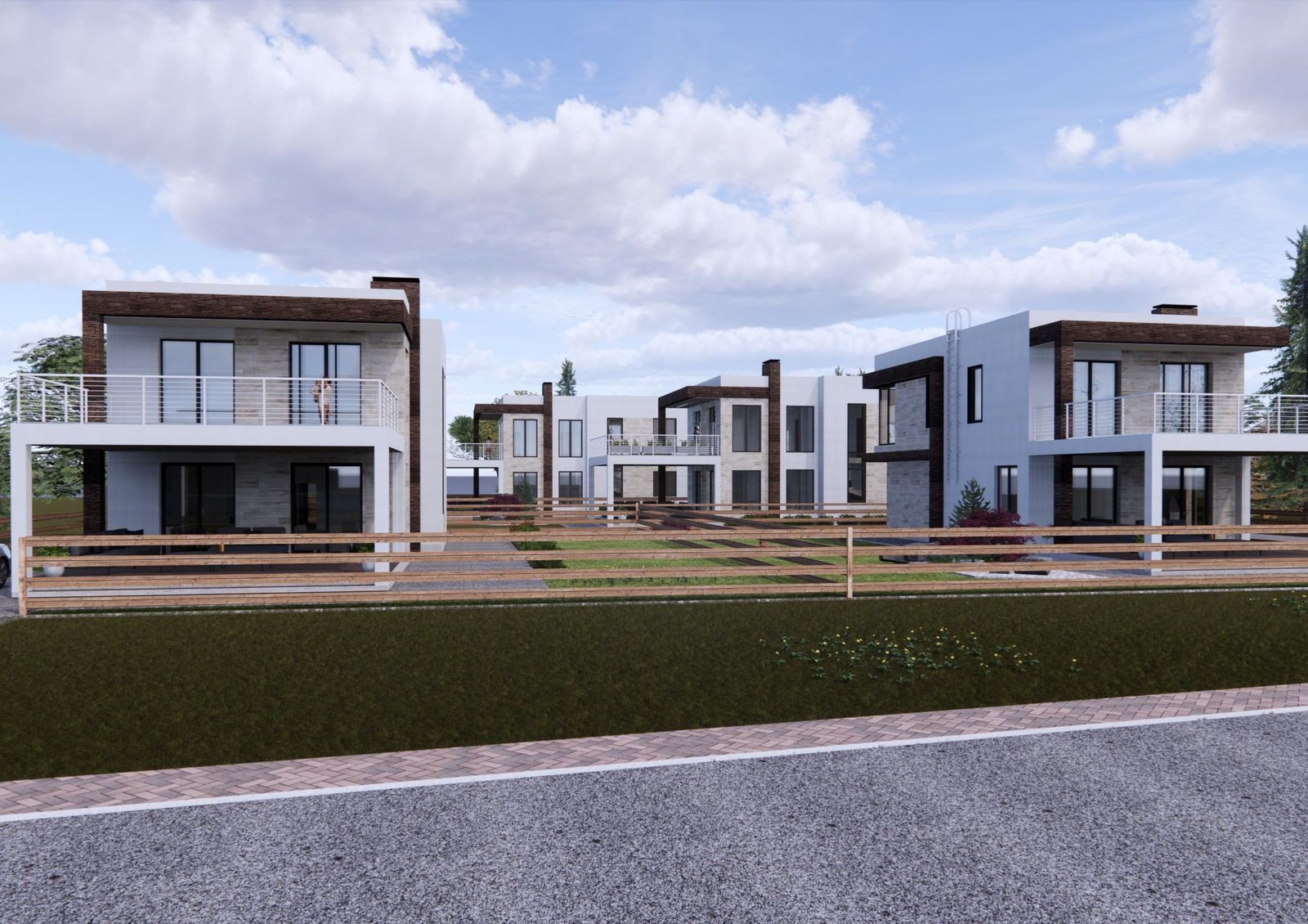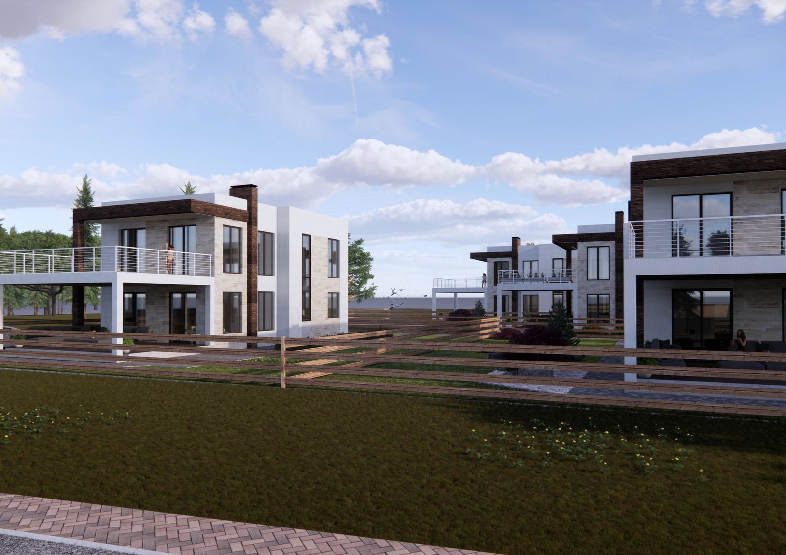 Коттеджи строят в стиле Hi-Tech — для них характерны минимализм, лаконичность, четкие прямые линии и сдержанный дизайн фасада. Типовая планировка двухэтажного дома включает в себя кухню-гостиную с камином, кабинет, гардеробные, кладовки, три спальни и несколько санузлов. Также в распоряжении жильцов две просторные террасы и придомовой участок 5-6 соток, где можно обустроить барбекю-зону или заняться садоводством.