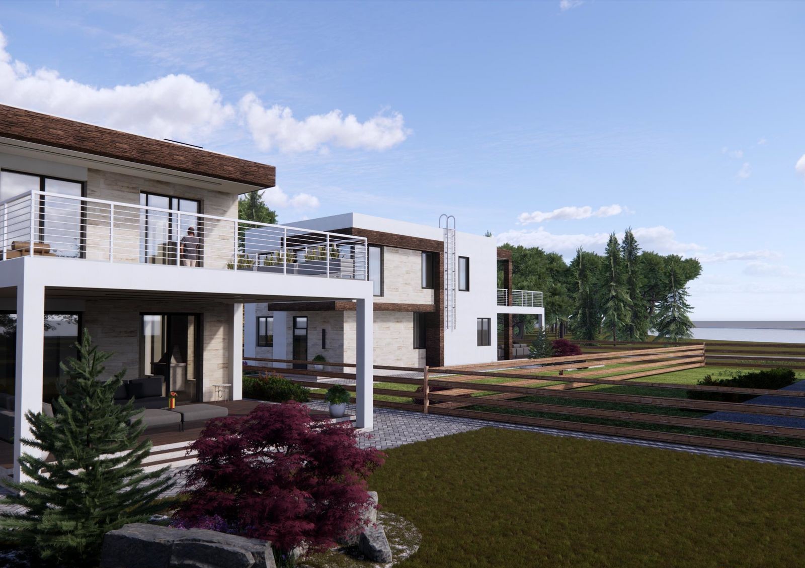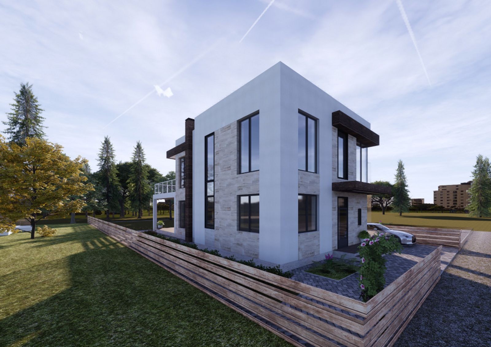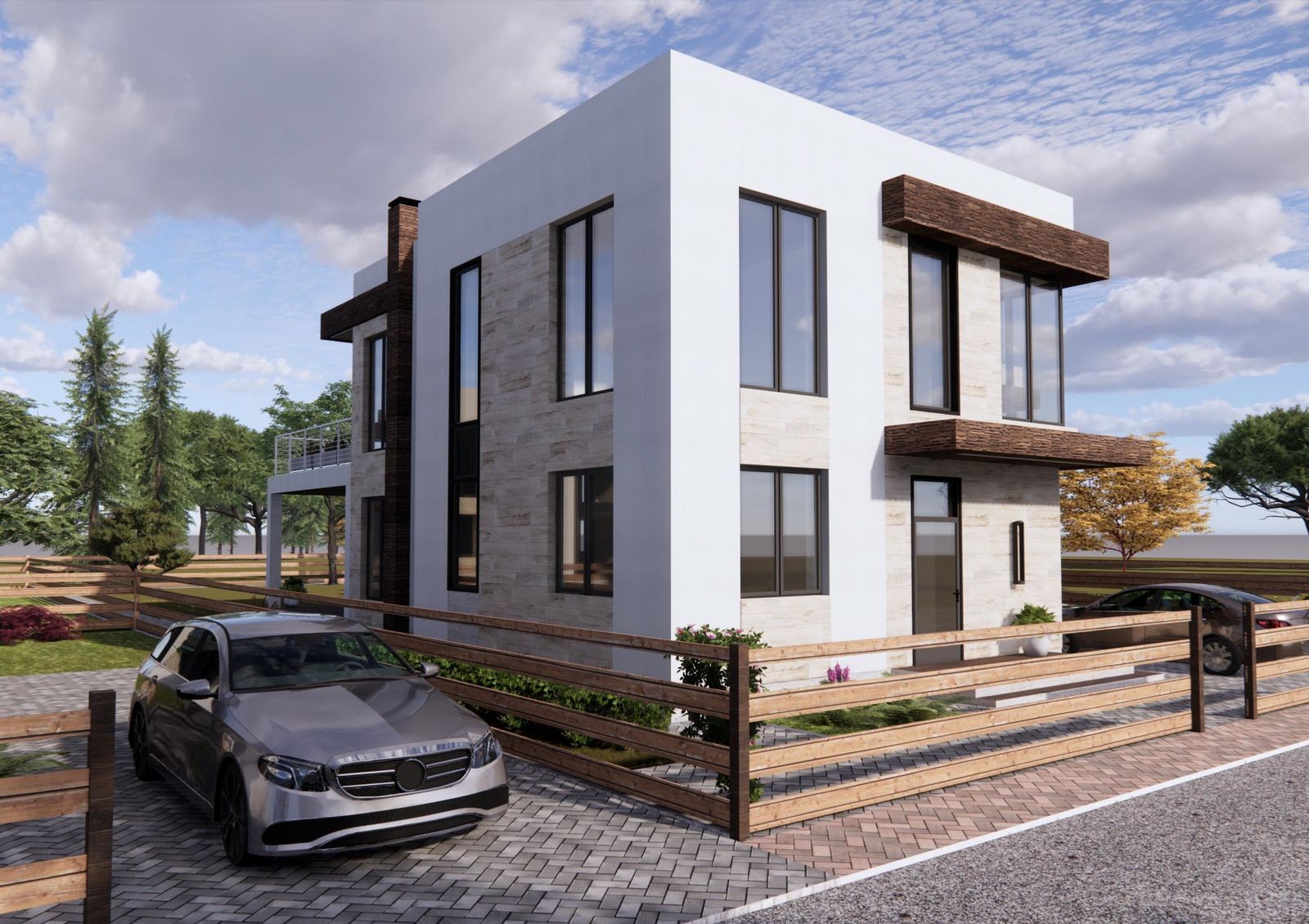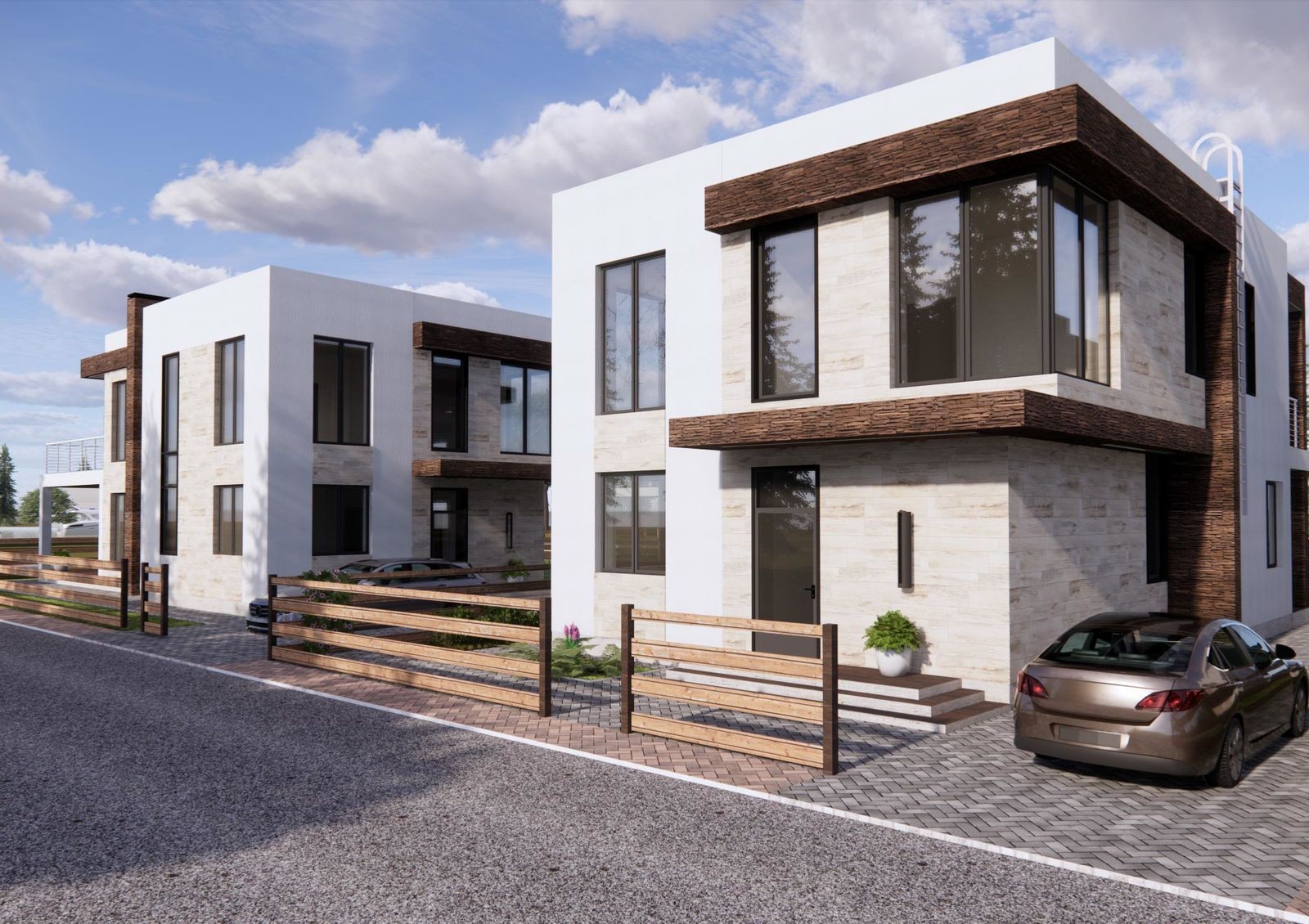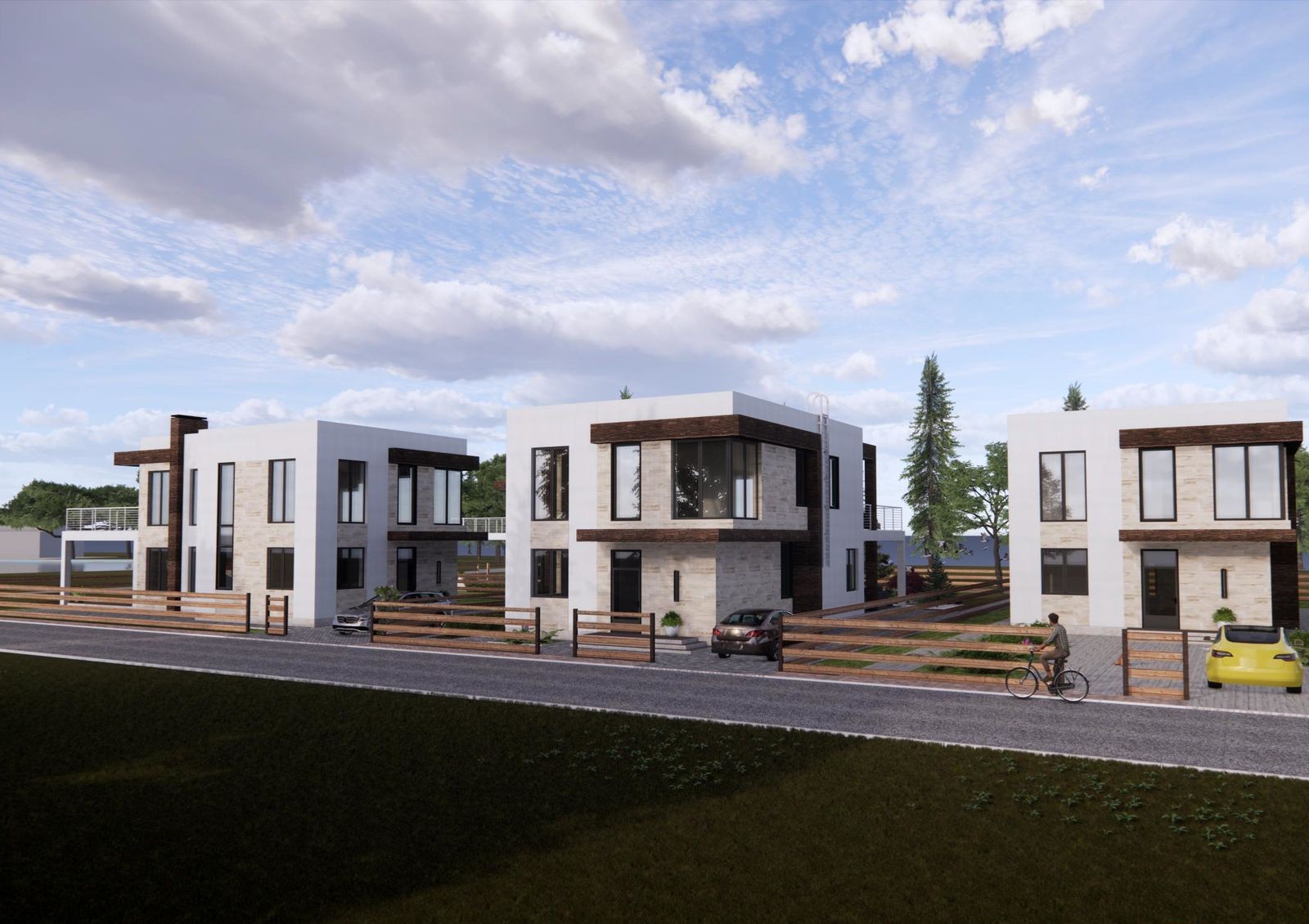Коттеджи строят в стиле Hi-Tech — для них характерны минимализм, лаконичность, четкие прямые линии и сдержанный дизайн фасада. Типовая планировка двухэтажного дома включает в себя кухню-гостиную с камином, кабинет, гардеробные, кладовки, три спальни и несколько санузлов. Также в распоряжении жильцов две просторные террасы и придомовой участок 5-6 соток, где можно обустроить барбекю-зону или заняться садоводством.