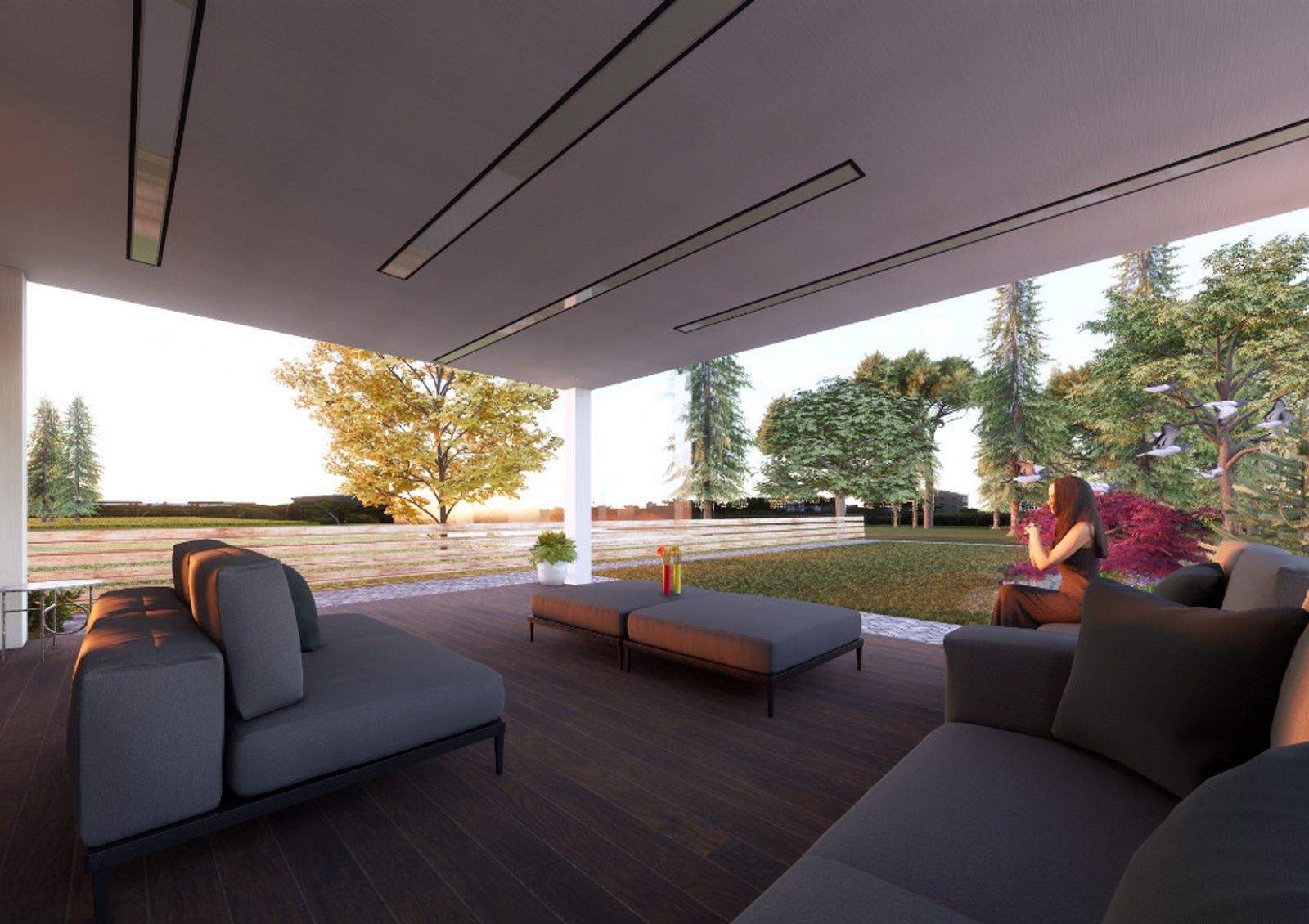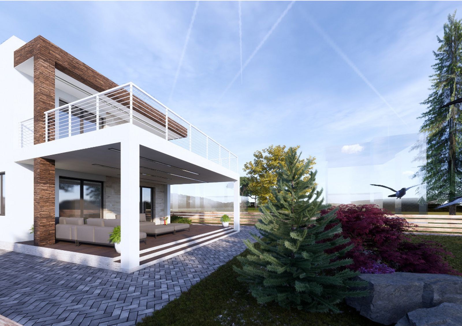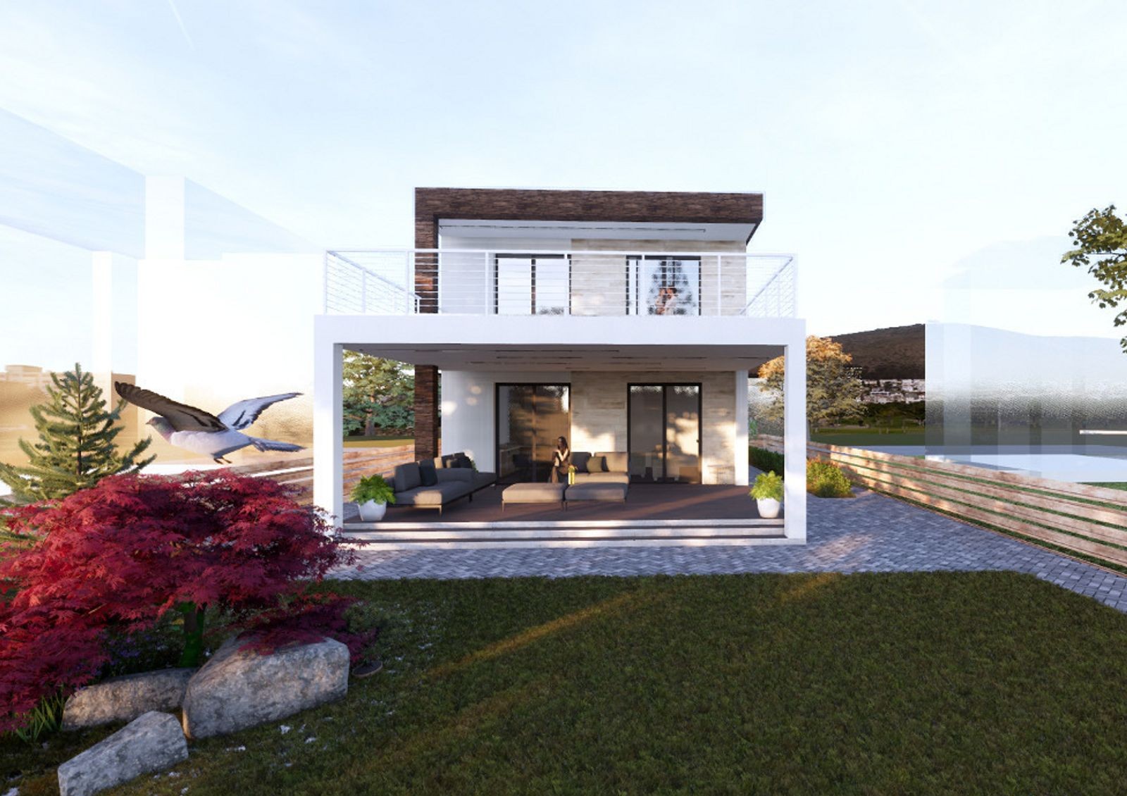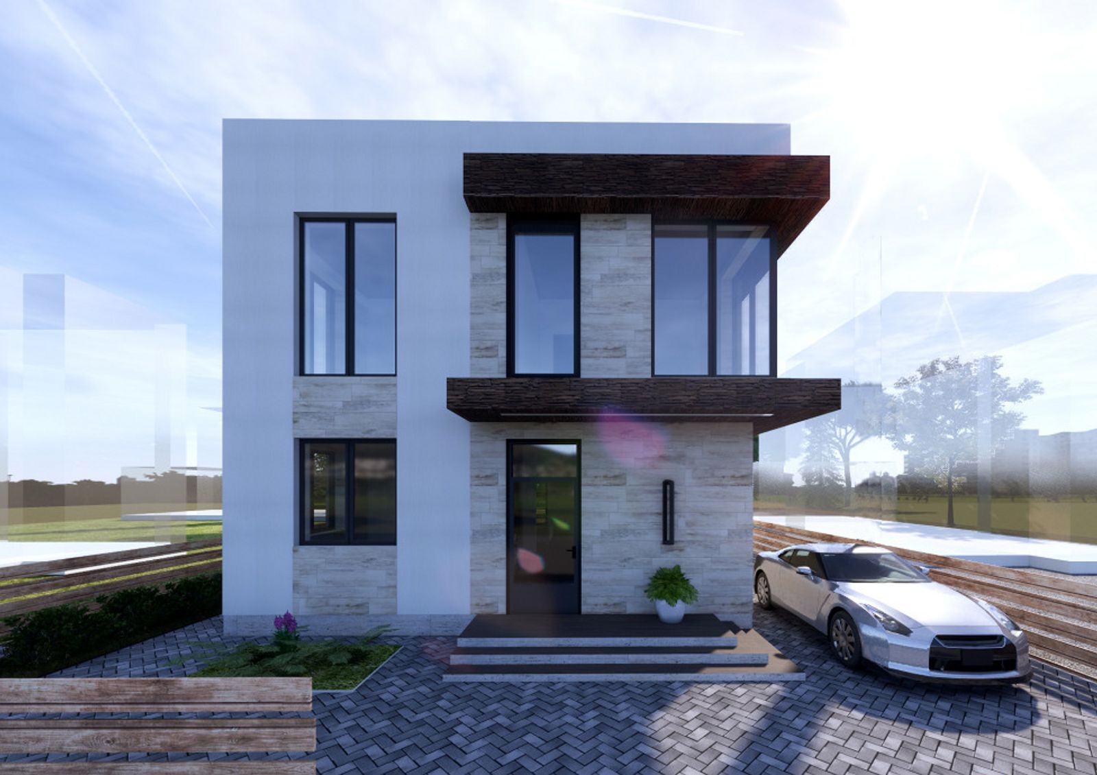 Коттеджи строят в стиле Hi-Tech — для них характерны минимализм, лаконичность, четкие прямые линии и сдержанный дизайн фасада. Типовая планировка двухэтажного дома включает в себя кухню-гостиную с камином, кабинет, гардеробные, кладовки, три спальни и несколько санузлов. Также в распоряжении жильцов две просторные террасы и придомовой участок 5-6 соток, где можно обустроить барбекю-зону или заняться садоводством.