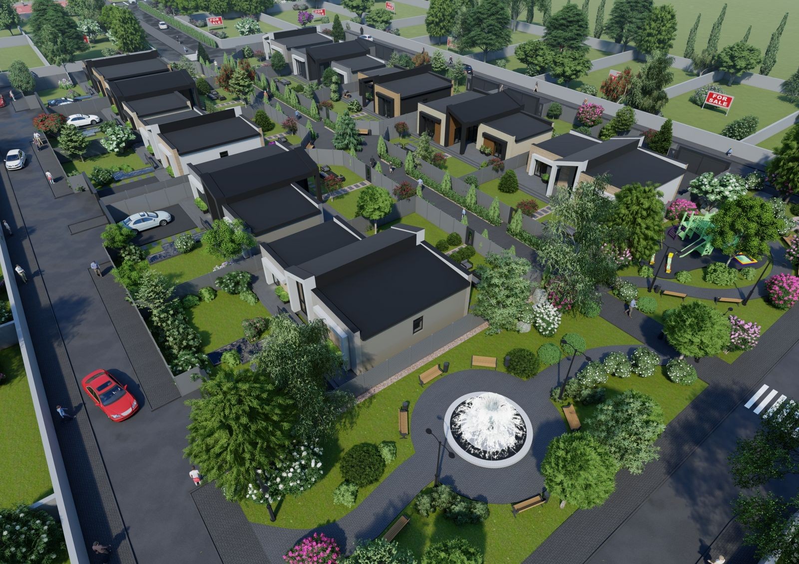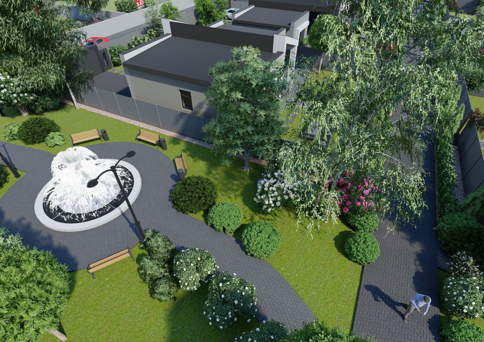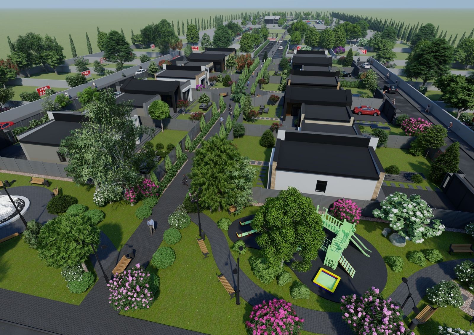 участки с индивидуальными подъездами, каждый участок огорожен и облагорожен с использованием ландшафтного дизайна