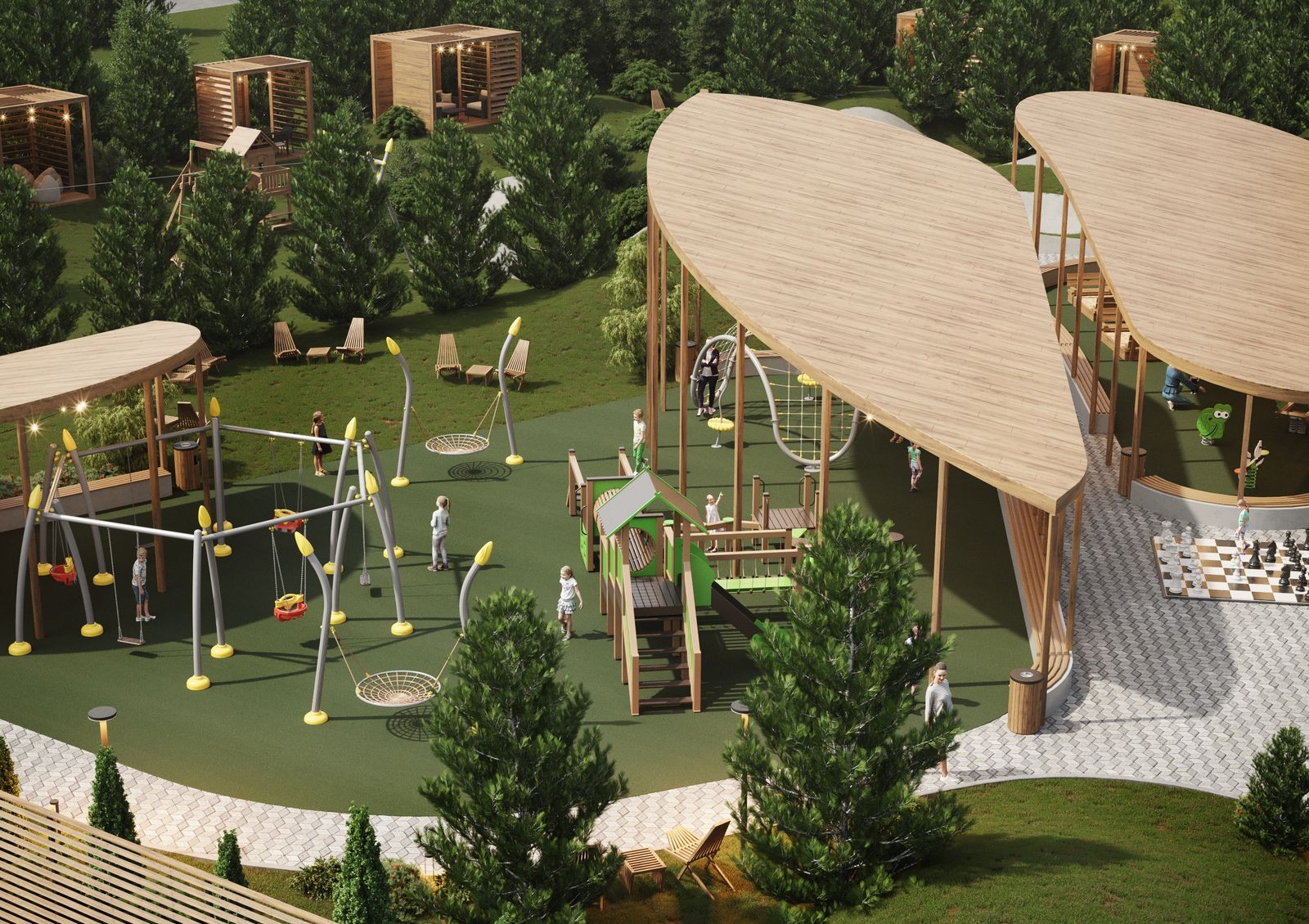 Для детей у коттеджного городка будут детские площадки, детский сад и школа раннего развития. Также родители малышей смогут выбрать одно из учебно-воспитательных учреждений в радиусе 3-7 минут езды от дома: муниципальные сады-ясли №1 «Золотая рыбка», №2, №3, №4, №5 и частный двуязычный детский сад «Академия детства». Для школьников на таком же расстоянии от коттеджей муниципальные школы №1, №2 и №3. За 8 минут на авто ребенка можно отвезти в детскую школу искусств.