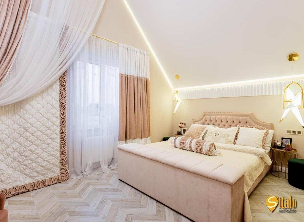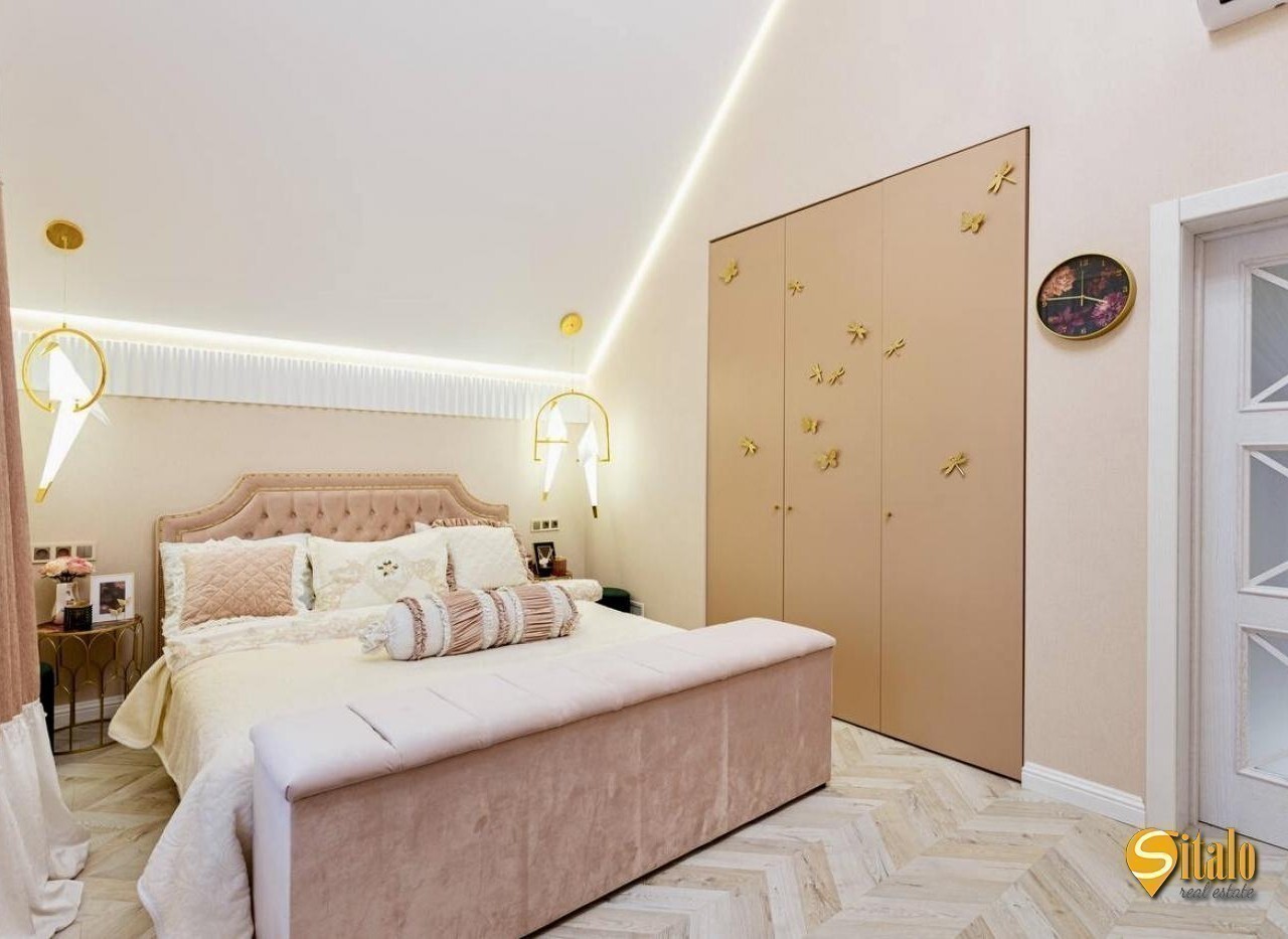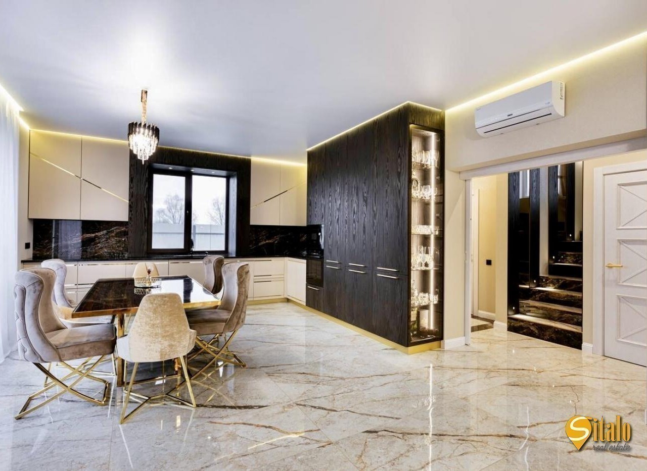 Продаж будинку з дизайнерським ремонтом в Осокорках. Просторий сучасний будинок із новим авторським ремонтом, розташований у престижному дачному кооперативі - найвища точка району, асфальтований під'їзд, до метро Славутич 5 км. Ділянка - 6 соток, будинок двоповерховий з великою терасою (27 кв. м. ), кухнею-студією (44 кв. м. ), санвузлом (8 кв. м. на 2 поверсі), 4 кімнатами, двома гардеробними, балконом та просторою ванною з панорамним вікном. У будинку: кондиціонери, тепла підлога, бойлери, сучасна котельня, три фази електропостачання (10 кВт), септик, свердловина, система фільтрації води. В оздобленні використано дорогі матеріали - натуральний камінь, декоративні панелі, золоті акценти. Ділянка рівна, сусіди - нові сучасні будинки, до озера Мартишів - 400 м. Ідеальний варіант для тих, хто шукає стильне житло у тихому районі з хорошою транспортною доступністю. Код об'єкта 16041