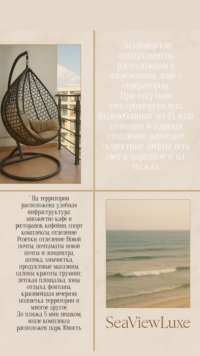 Сдается люксовая квартира в сердце Аркадии - в элитном жилом комплексе 48 жемчужина на Каманина с охраной и видеонаблюдением. До моря и пляжей (Ибица, Итака) - всего 5 минут пешком! Локация: - Аркадия, самый престижный район Одессы - 5 мин до клубов, аллеи Аркадии и лучших кафе - Рядом супермаркеты, кафе, аптеки О квартире: - Дизайнерский ремонт, дорогая мебель, новая техника - Большая терраса с видом на море - Зона отдыха на террасе: стол, стулья, кресло-кокон - Отлично подойдёт для утреннего кофе, закатов, вечеринок или контент-съёмки - 4 спальных места (2+2) - Полностью укомплектована всем необходимым Бесконтактное заселение - в любое время, по коду, ключи в боксе у двери. Удобства: - Закрытая охраняемая территория - Зелёный ухоженный двор - 3-уровневый подземный паркинг (оплачивается отдельно) - Укрытие на паркинге (в случае воздушной тревоги) - Есть розетки в укрытии для зарядки и приготовления еды Очень инстаграмная квартира, идеально для фотосессий, видео, сторис! Почему выбирают мою квартиру: Топовая локация Чистота и уют гарантированы Можно заехать в любое время суток - даже ночью Хозяйка всегда на связи, помогу с любыми вопросами Идеально для отдыха парой, с друзьями или семьёй Часто выбирают блогеры - очень фотогеничная локация. Терраса, шикарный ремонт… Цена зависит от сезона и количества дней и количества человек. Пишите/звоните - отправлю больше фото и отвечу на все вопросы. Бронируйте заранее - летом высок спрос! Актуальные цены на аренду: Май - 3500 грн/сутки Июнь - 4500 грн/сутки Фото документов обязательно! Большая просьба писать на Viber. Не звонить.