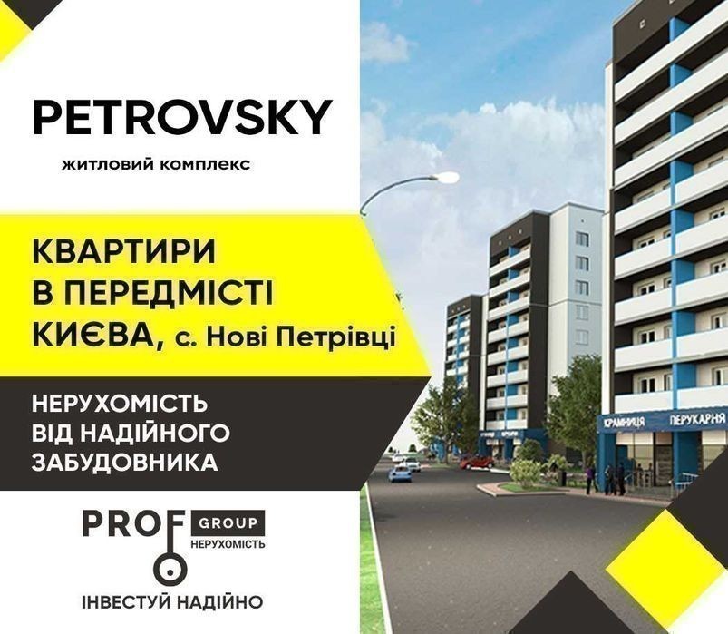 ЖК «PETROVSKY» - це тихий, затишний і сучасний житловий комплекс в передмісті. Комплекс розташований всього в 10 км від м. Київ, а саме Вишгородський район, с. Нові Петрівці, на розі вул. 1-го Травня та пров. 1-го Травня. Інтервал поїздки до метро Героїв Дніпра займає всього 15-20 хвилин громадським транспортом. Регулярні перевезення, гарне транспортне сполучення. Комплекс складається з п'яти, 9-ти поверхових цегляних будинків. На території комплексу передбачена наземна гостьова парковка, сучасний благоустрій, озеленення подвір'я і безпечні дитячі майданчики. Комплектація квартири: - чорнова штукатурка (обробка) стін, - вхідні металеві двері, - сантехніка розведена по стоякам, - металопластикові вікна, - висота стелі 2.70 - встановлені лічильники на всі види комунікацій: вода, електрика; газ - опалення- індивідуальне (2-х контурний газовий котел) - ввідний кабель електроенергії - 1 ліфт - Централізовані комунікації (водопостачання, каналізація, газопостачання та електрифікація)