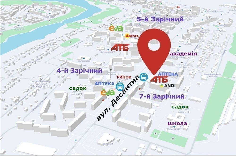 ТОВ «АТБ-маркет» пропонує - 261м² у великому масиві (Зарічний) понад 58 000 мешканців. вул. Десантна 15 АТБ №1 якір в країні, який забезпечує великий постійний потік відвідувачів протягом дня. - Великій потік покупців. - Щільність масиву 3 089 осіб/км² (вище чим в два рази по Кривому рогу) - Транспортна доступність ключова вулиця району (зупинка транспорту) - Розвинена інфраструктура 2 школи, 2 дитсадки, лікарня, 2 ринки, магазини та ТЦ - Парковка. Є також варіант оренди від 1 м² до 3 000м². Та інші локації по місту. Телефонуйте або пишіть, відповімо на всі запитання та оперативно організуємо перегляд БЕЗ КОМІСІЇ