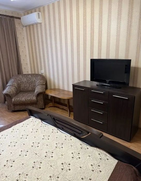 Сдам 1-комнатную квартиру на Победе-6, ул. Набережная Победы, 118. Квартира полностью укомплектована всем необходимым для комфортного проживания. По планировке: кухня, просторная комната и застеклённый балкон. В комнате - двуспальная кровать, кондиционер, телевизор, два удобных кресла, шкаф и комод. Выход на балкон. Все соответствует фото. По дополнительным вопросам обращайтесь по телефону.