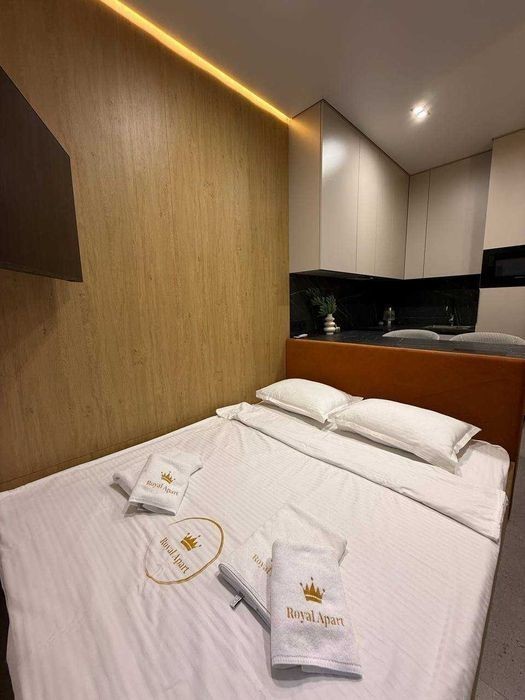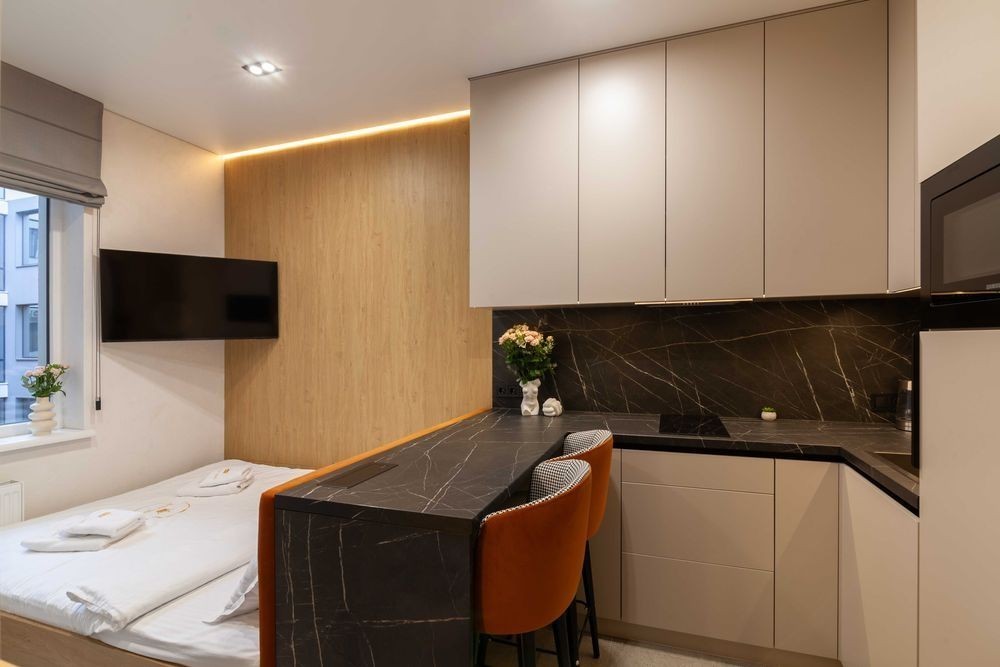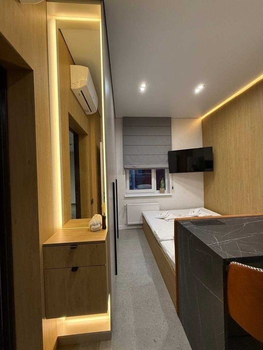 Затишна студія в сучасному стилі неподаліфк центру міста. Сучасна, світла та продумана до дрібниць квартира-студія - ідеальний варіант для комфортного проживання однієї або двох осіб. У квартирі є все необхідне: -зручне двоспальне ліжко з брендованою білизною; -кухня з плитою, посудом і всім необхідним для приготування їжі; -пральна машина -рушники -фен та праска -телевізор, кондиціонер, Wi-Fi; -простора шафа для зберігання речей; -сучасне освітлення та стильний дизайн у теплих відтінках. Квартира розташована в тихому та безпечному районі, поруч є магазини, кафе, аптека та зручна транспортна розв'язка.
