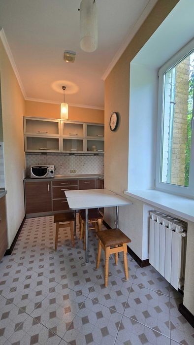 Продається квартира в цегляному будинку в тихому та дуже зеленому масиві міста. Квартира з ремонтом: паркет, нові склопакети, нові радіатори. Кімнати роздільні. Є все необхідне для комфортного проживання: вбудована кухня з побутовою технікою, м'які меблі, шафи купе, техніка. 2 санвузла - ванна та душова кабіна, підігрів підлоги. 3 кондиціонера, бойлер. Панорамні вікна. Поруч парк Нивки, каскад озер, консульство США. Станція метро Берестейська - ь5 хв. пішки. Є відеоогляд квартири. Ключі на руках!