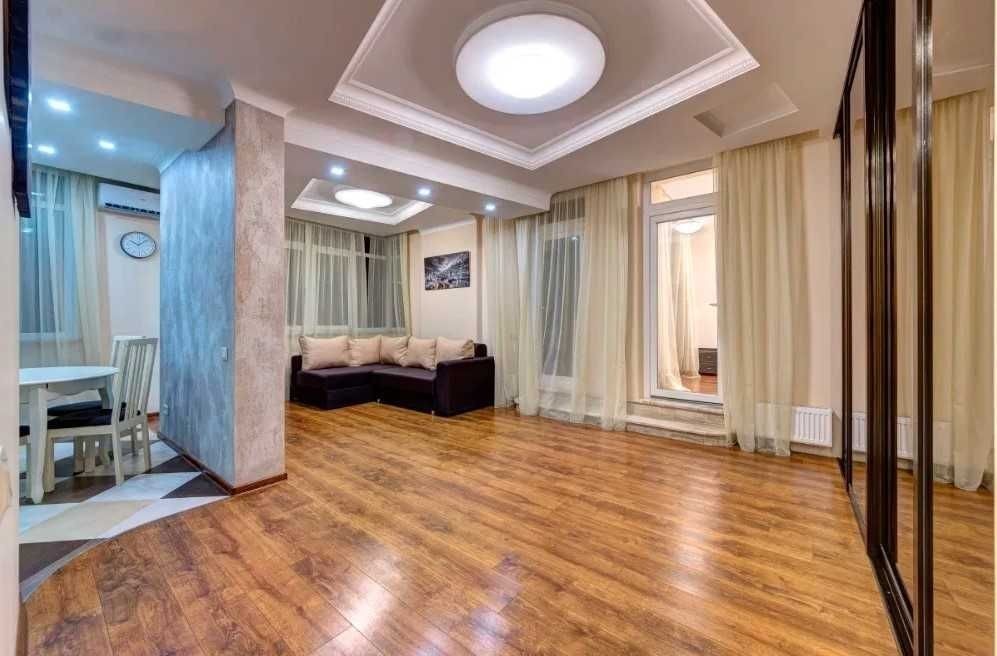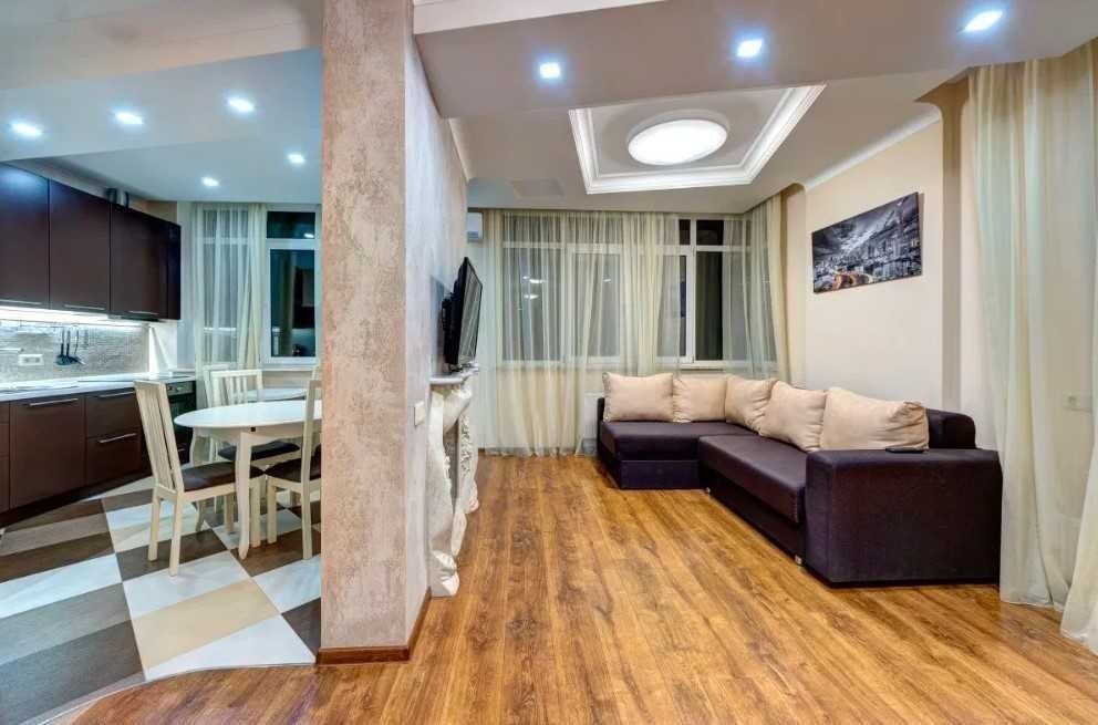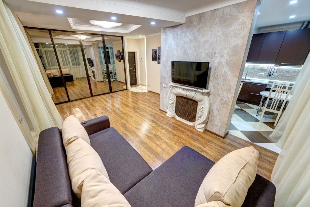 Однокімнатні апартаменти будуть доречними для перебування гостей у кількості до 2 осіб. Розташовані за адресою: вул. Юлії Здановської, 46. Зал-студіо - практично перше, що бачать гості, коли відчиняються двері в квартиру. Тут є комфортабельний двоспальний диван, навпроти якого розташована стіна, де є декоративний камін і настінний плазмовий телевізор. Просто дзеркальна шафа для зберігання особистих речей. Кухонна зона вміщує круглий стіл на чотирьох персон, який за бажання можна перемістити у вітальню залу. За мікроклімат приміщення відповідає кондиціонер. Якщо говорити про побутові прилади, то тут є: - холодильник; - мікрохвильова піч; - індукційна панель із духовкою; - електричний чайник. Будемо раді надати вам комфортне проживання! Вартість оренди квартири у вихідні уточнюйте за номером телефону. Для швидкого бронювання - дзвоніть!