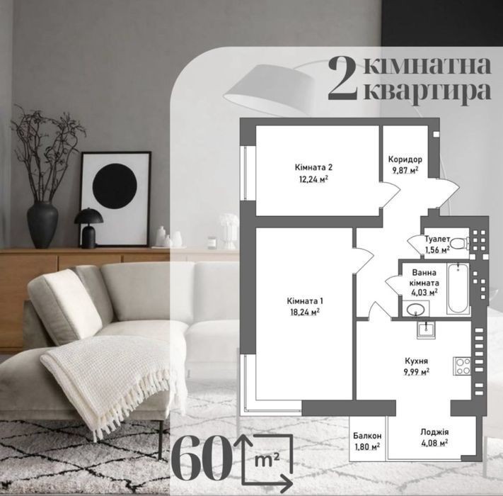До Вашої уваги продаж просторої двокімнатної квартири в новому будинку. Загальна площа 60,5 кв. м., з них дві спальні 18 та 12 кв. м., кухня з лоджією 14 кв. м., балкон 1,8 кв. м., гардероб з коридором 9 кв. м., та роздільний санвузол. Квартира поштукатрена, зроблена електрика, сантехніка (тепла підлога кухня, коридор, санвузол). Готова до ремонту! Продаж по переуступці!