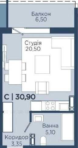 АКЦІЙНА пропозиція! Продається компактна та функціональна квартира-студія площею 30,90 м² з великим балконом 6,5 м². Спеціальна ціна - лише 23 639 $! Переваги планування: • Простора студія 20,5 м² - зручно під зону відпочинку, кухню та робоче місце • Великий балкон - ідеальне місце для відпочинку чи додаткового зберігання • Ванна кімната 5,10 м² - комфортний простір для облаштування • Зручний коридор 3,35 м² з місцем під шафу Ідеально підходить для: • проживання однієї людини чи пари • оренди як інвестиція • тих, хто шукає бюджетне, але раціональне житло Поспішіть! Акційна ціна діє обмежений час.