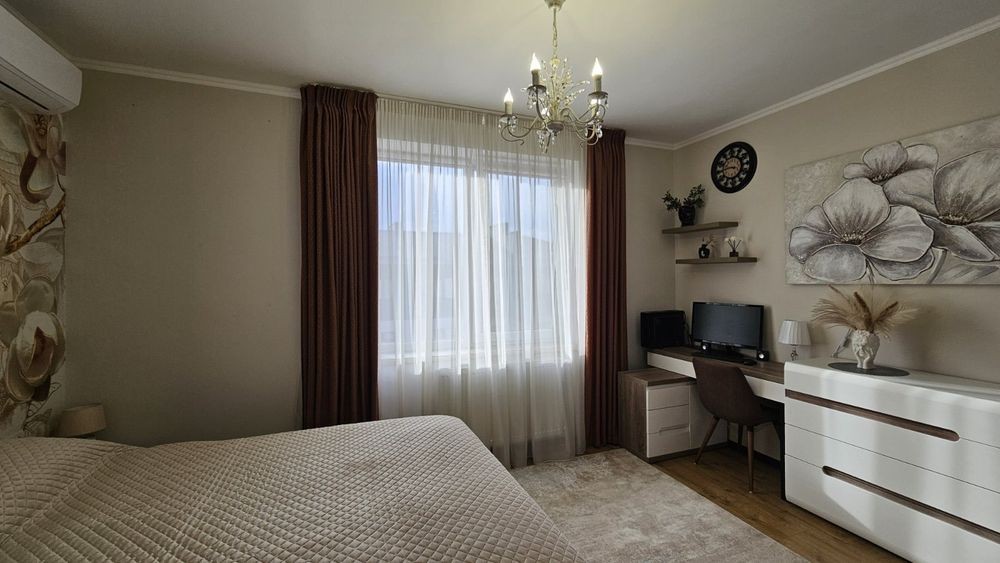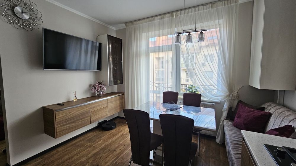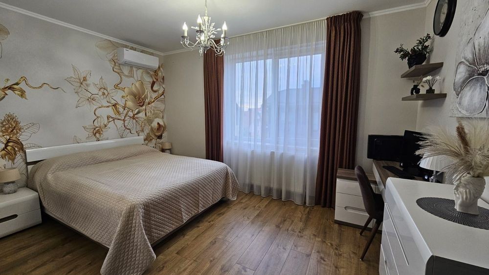Довготривала оренда 2-х кім. квартири, 3/5 70 метрів в. Новобудові. Двір закритого типу, два санвузли, де є душова і вана. Багато шаф для зберігання речей. Посудомийка, тепловий насос, газове опалення. Вся битова техніка, письмовий стіл. Діван розкладний, двухспальне ліжко. В під'їзді кодовий замок, домофон, сігналізація, бронюванні двері.