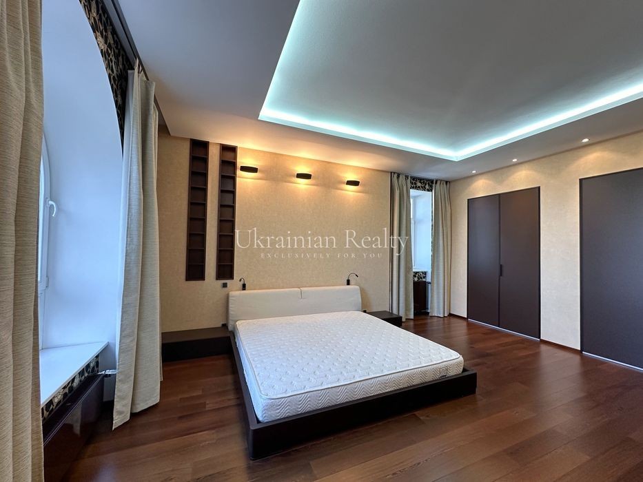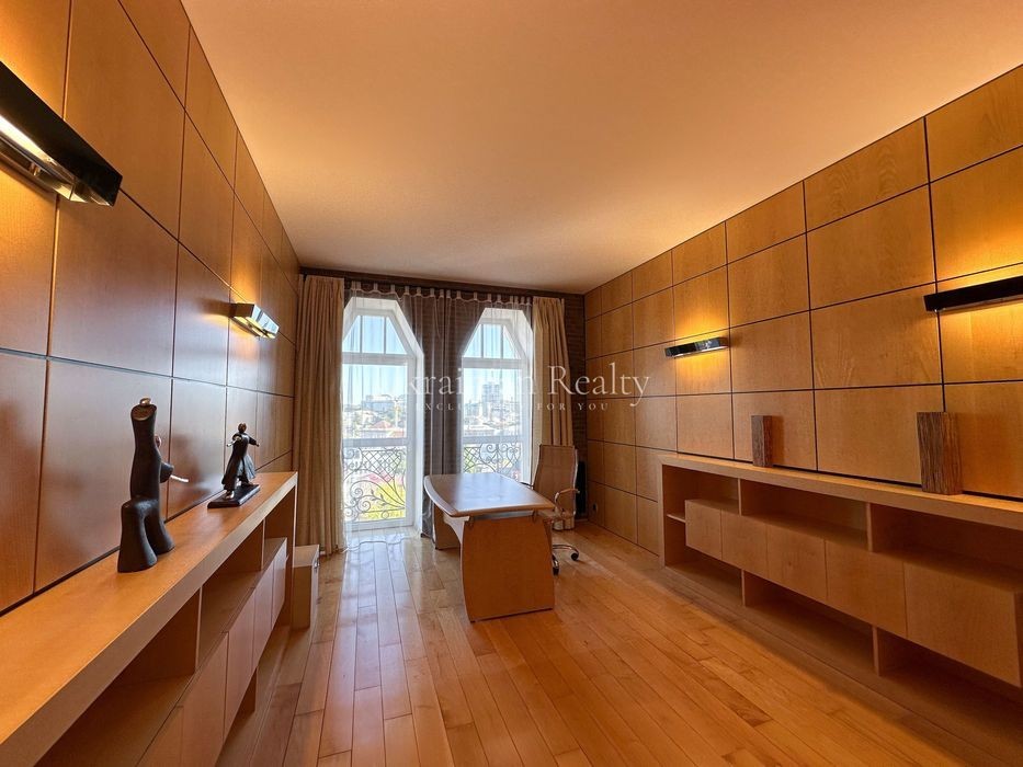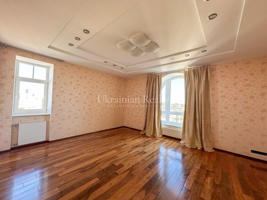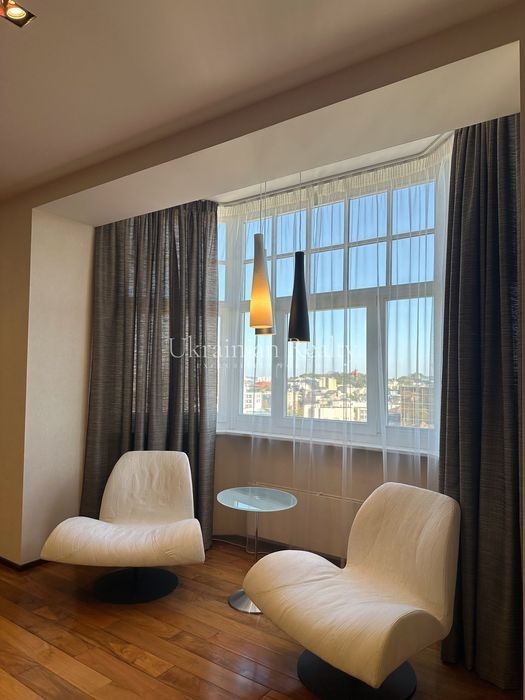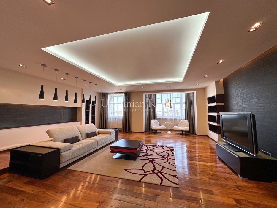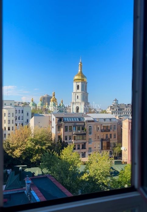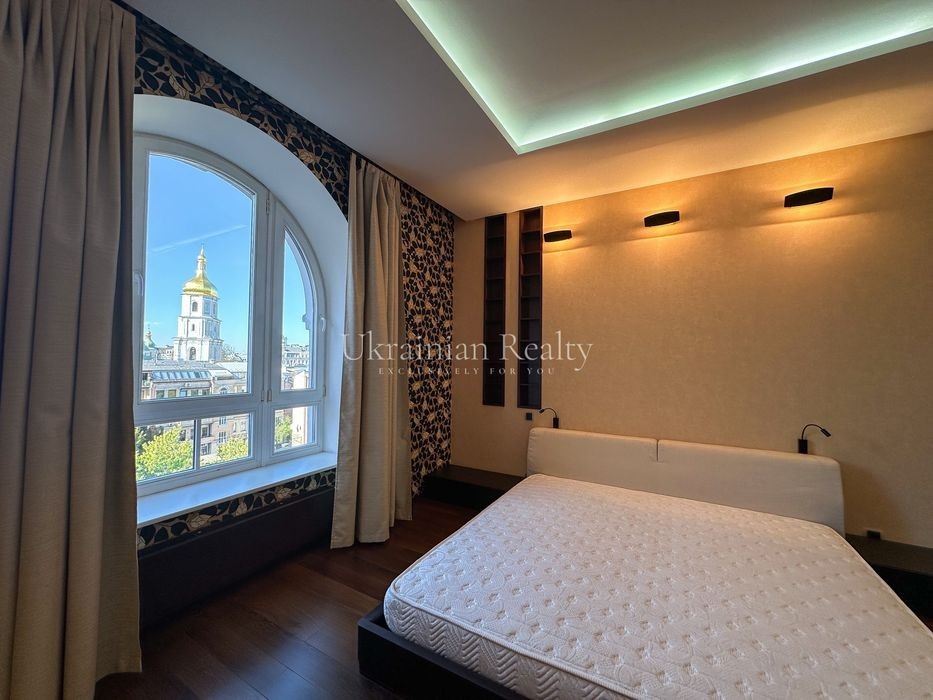 ст. м. «Золоті Ворота», вул. Ірининська 5/24 10/12 поверх, будинок обладнаний генератором Площа: 263/135/46 кв. м. Висота стель: 3 м. Квартира розташована в самому серці історичного центру Києва та має панорамні види в усі сторони міста. Софія Київська - у безпосередній близькості. Квартира повністю мебльована та знаходиться в ідеальному стані. Планування та характеристики: • Передпокій - 26 кв. м • Кухня/обідня зона - 46 кв. м з видом на Софію Київську • Вітальня - 59 кв. м з видом на Хрещатик • Дві просторі спальні між ними велика гардиробна та ванна кімната з вікном • Кабінет з невеличким гардеробом та санвузлом з душовою кабіною. • Два санвузли • Постирочна • Паркомісце з прямим доступом ліфтом (розмір 3.13 × 5.12 м, площа 15.9 кв. м) В оздобленні використані матеріали преміумкласу: дерев'яні стінні панелі, паркет із палісандра (міцність у два рази вища за дуб). Технічне оснащення: Квартира повністю укомплектована технікою Miele (варильна поверхня, гриль, посудомийна машина, духова шафа, мікрохвильова піч, пароварка, холодильник, винна шафа, витяжка, пральна та сушильна машини). Телевізор BANG & OLUFSEN, кондиціонери, тепла підлога.