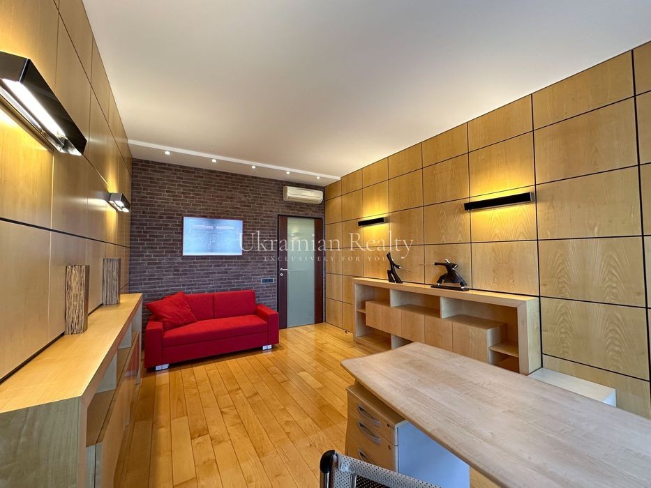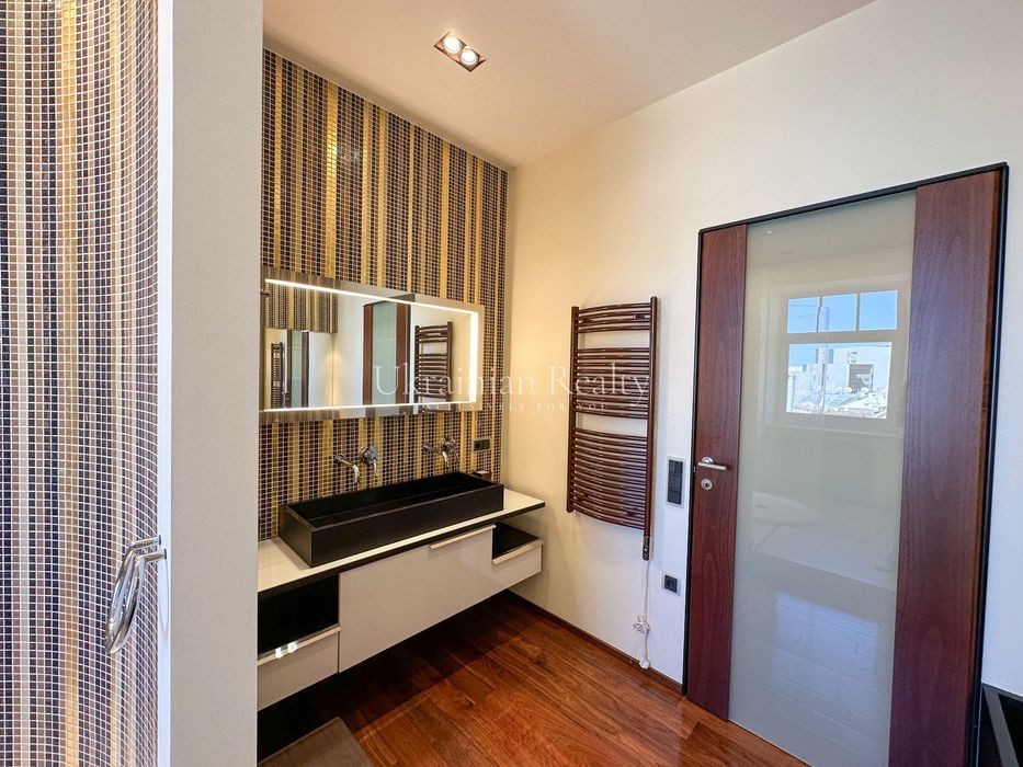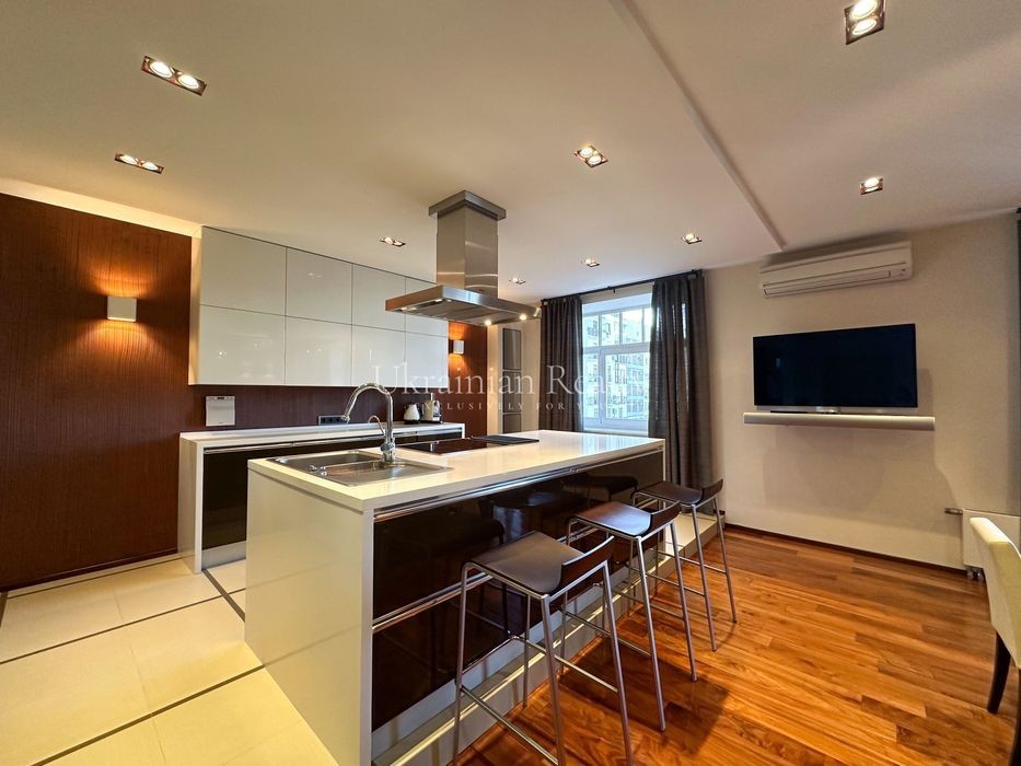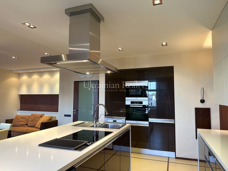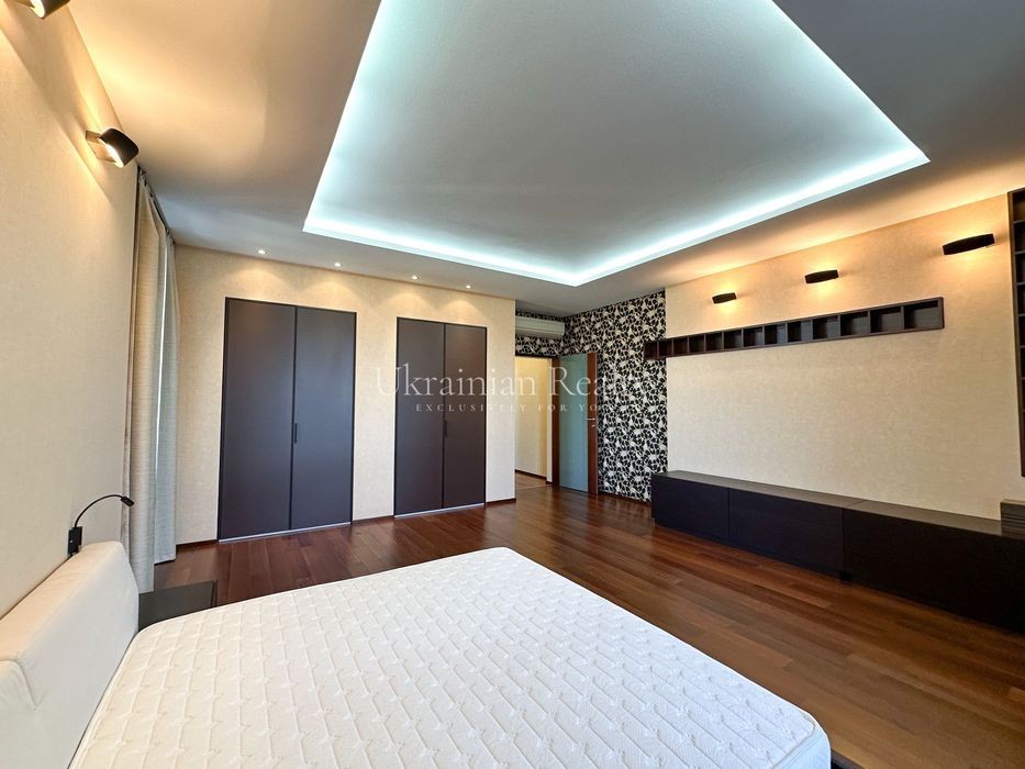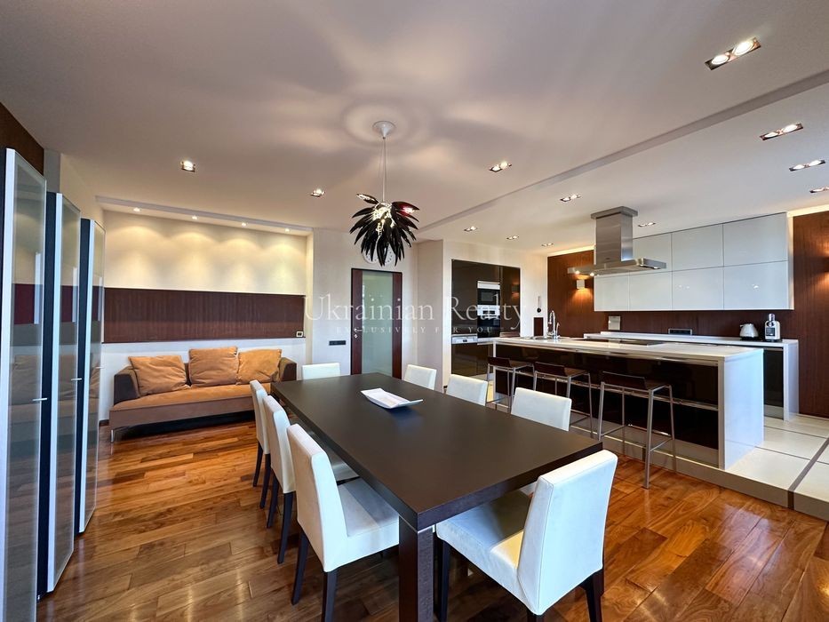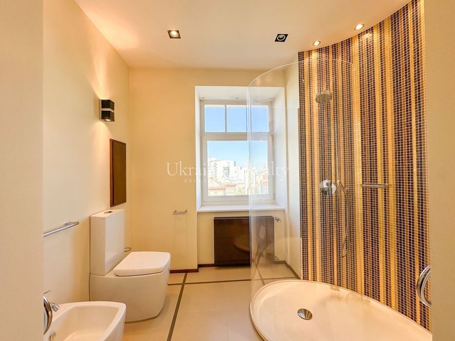 ст. м. «Золоті Ворота», вул. Ірининська 5/24 10/12 поверх, будинок обладнаний генератором Площа: 263/135/46 кв. м. Висота стель: 3 м. Квартира розташована в самому серці історичного центру Києва та має панорамні види в усі сторони міста. Софія Київська - у безпосередній близькості. Квартира повністю мебльована та знаходиться в ідеальному стані. Планування та характеристики: • Передпокій - 26 кв. м • Кухня/обідня зона - 46 кв. м з видом на Софію Київську • Вітальня - 59 кв. м з видом на Хрещатик • Дві просторі спальні між ними велика гардиробна та ванна кімната з вікном • Кабінет з невеличким гардеробом та санвузлом з душовою кабіною. • Два санвузли • Постирочна • Паркомісце з прямим доступом ліфтом (розмір 3.13 × 5.12 м, площа 15.9 кв. м) В оздобленні використані матеріали преміумкласу: дерев'яні стінні панелі, паркет із палісандра (міцність у два рази вища за дуб). Технічне оснащення: Квартира повністю укомплектована технікою Miele (варильна поверхня, гриль, посудомийна машина, духова шафа, мікрохвильова піч, пароварка, холодильник, винна шафа, витяжка, пральна та сушильна машини). Телевізор BANG & OLUFSEN, кондиціонери, тепла підлога.