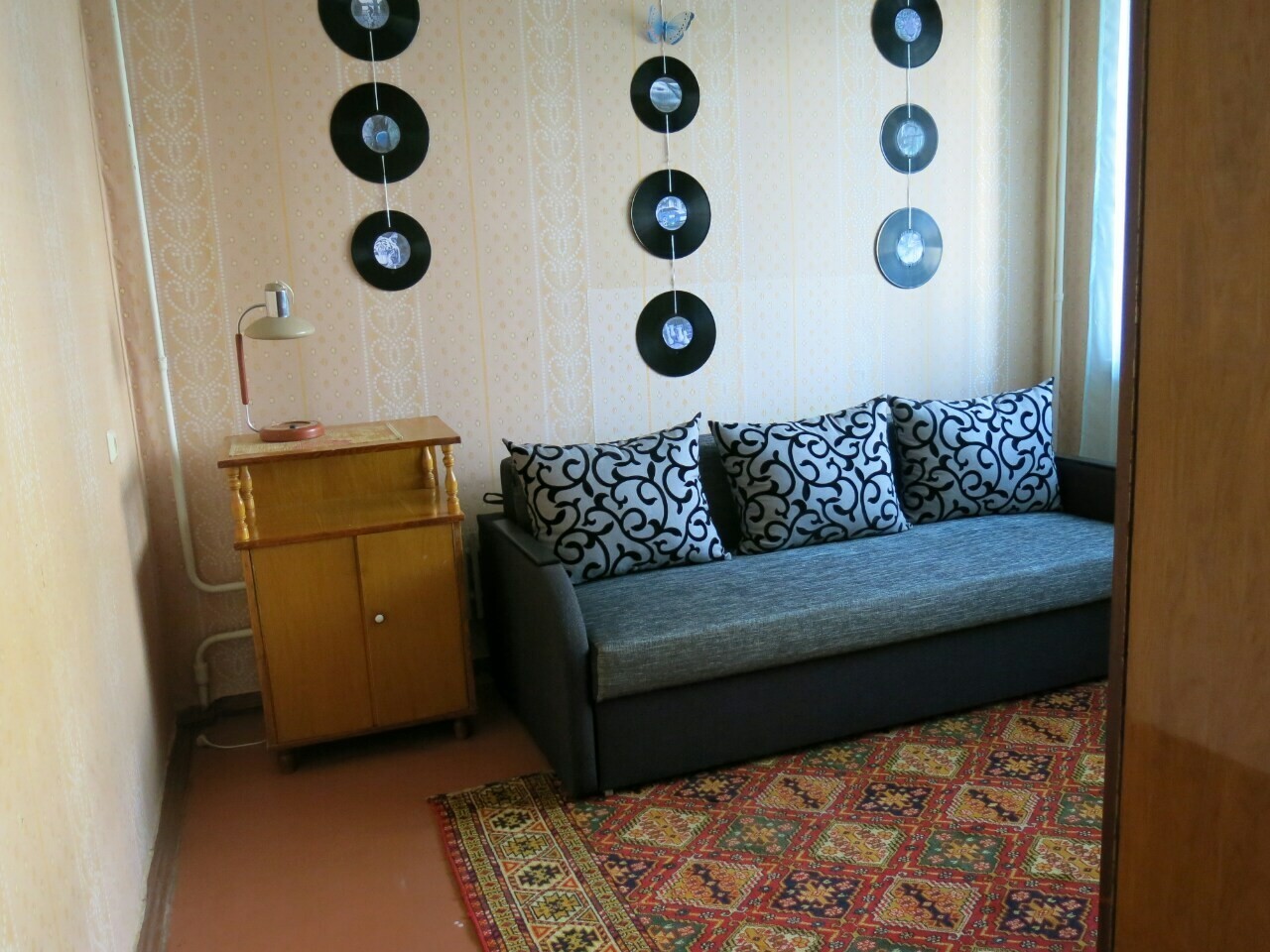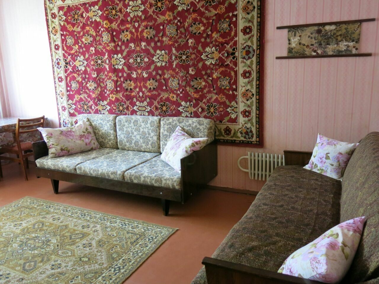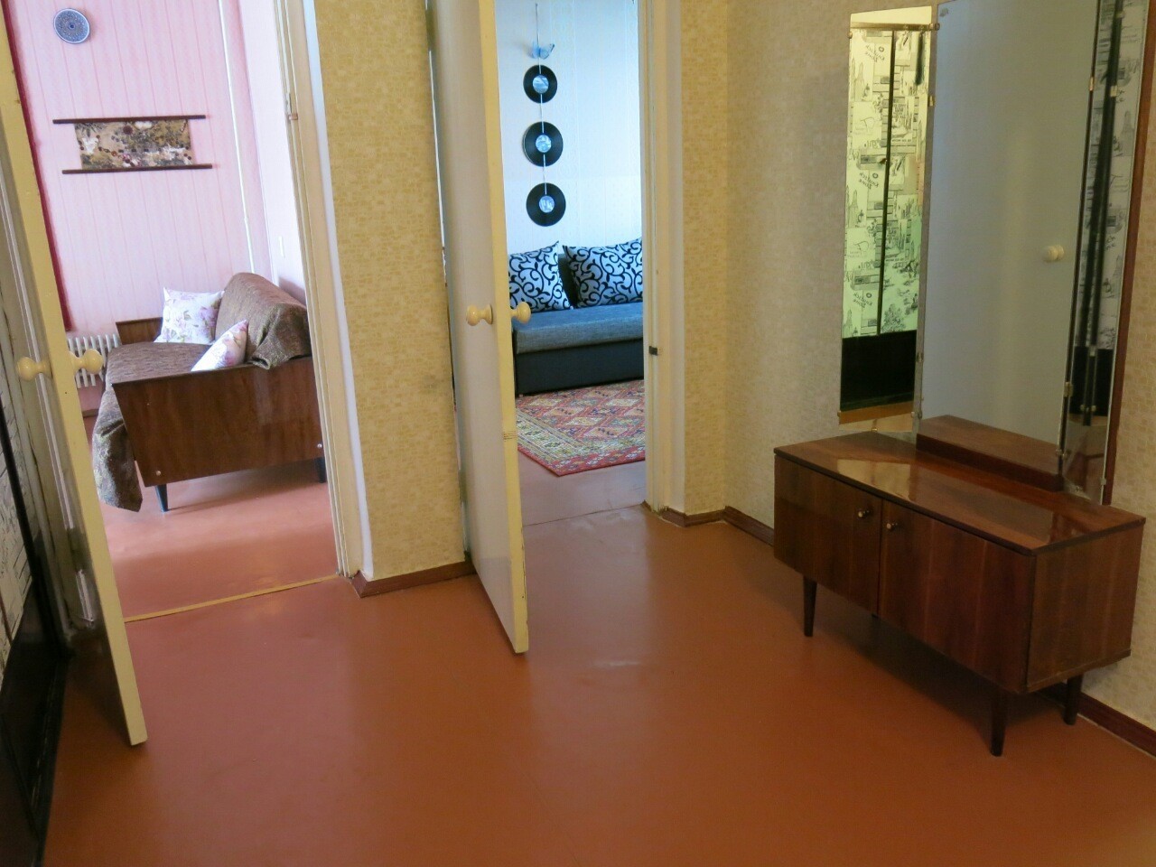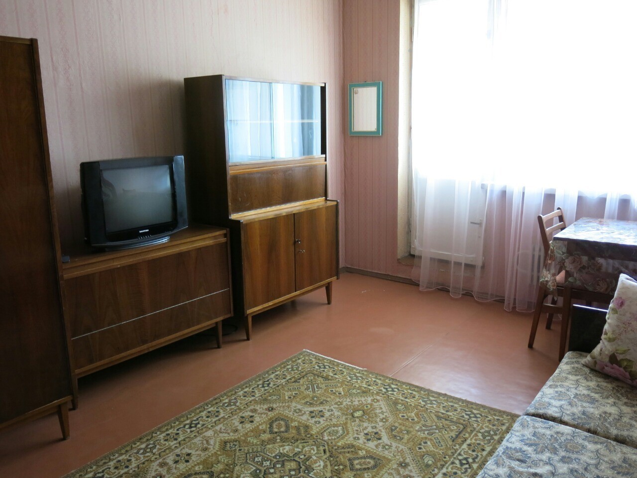 Ул. Самолетная, 17. Ост. Аэрофлотская. Во дворе АТБ, дет. сад., рядом школа. 3/16-эт. дома, два лифта, ухоженый тамбур на две кв. 3 отд. комнаты, холл, большая кухня, раздельный санузел, кладовка, две застекленные лоджии. Косметика, состояние жилое, чистая, светлая, просторная квартира. 4 отдельных спальных места и дополнительный диван. Два стола, стулья, в каждой комнате платяной шкаф, встроенный шкаф в холле. Подушки. Из техники- холодильник, телевизор, wi-fi, стиральная машина-автомат на 5 кг, электрическая варочная поверхность-стеклокерамика, микроволновка, электрочайник, гладильная доска, утюг, обогреватель, частично посуда. Сантехника исправна, вода перекрывается. Брон. дверь, домофон. Окна МПО и деревянные, линолеум на полу.