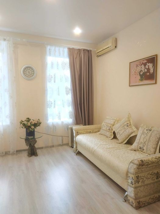 Однокомнатная, ул. Базарная-Екатерининская. Второй этаж, высокие потолки. Сделан новый капитальный ремонт. МПО, на полу ламинат и плитка. Душкабина, бидэ, новая сантехника, красивая облицовка. Всегда есть своя горячая вода через электробойлер. Вся мебель, посуда, микроволновка, газовая плита, духовка, вытяжка, эл. чайник, новый большой холодильник. Стиральная машина. Телевизор. Большой раскладной диван, шкаф, кондиционер. Интернет Wi-Fi. Квартира уютная, окна смотрят в тихий переулок, Недалеко Дерибасовская, Соборная площадь, Консерватория, Институты. В пешей доступности Вокзал и Привоз. Звоните!